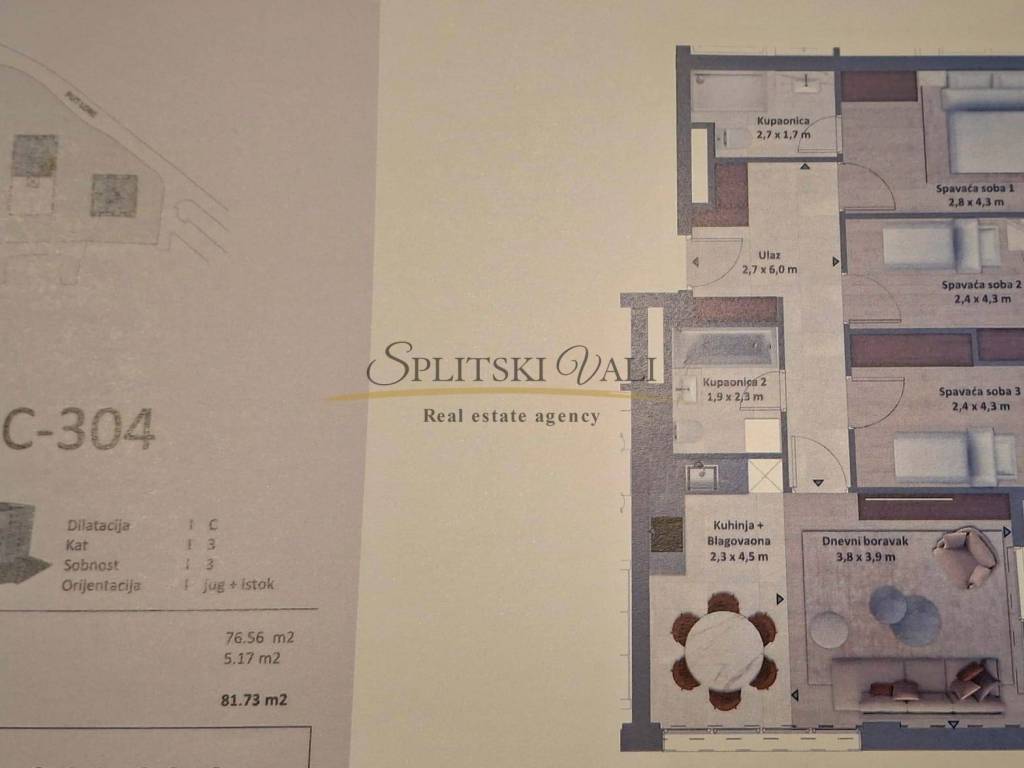 Stan C304 - Trosoban stan ukupne površine 81,73 m2 nalazi se na 3. katu (od 6 kata) zgrade. Sastoji se od tri spavaće sobe, dva kupatila, kuhinje s blagovaonicom, dnevnog boravka i lođe. Velike staklene stijenke pružaju mnogo osvjetljenja tokom dana i otvoren pogled. Orijentacija stana je jugoistok. Stanu pripadaju tri parking mjesta u garaži u iznosu od 35 000 po svakom mjestu, te sprema koja se nalazi u suterenu zgrade u iznosu od 22 000.