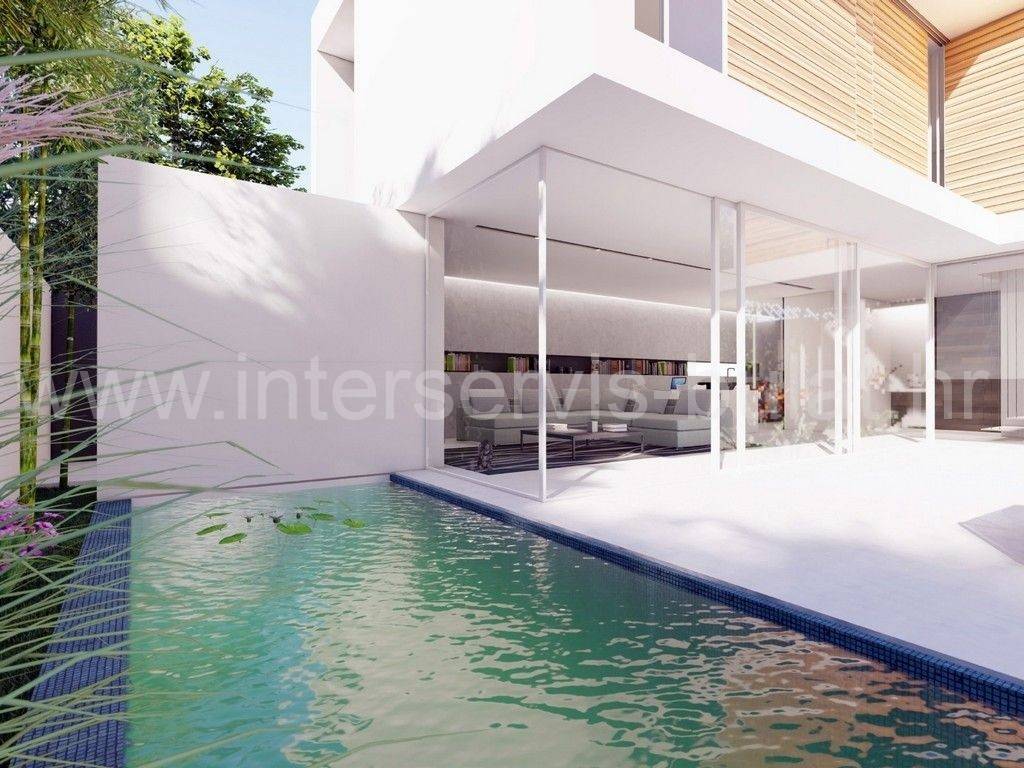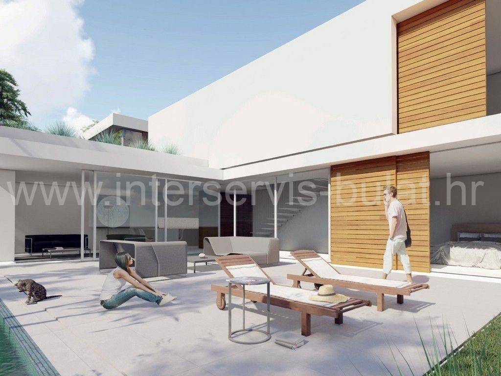 A modern villa in a new building is located in a quiet location in Tribunj. It consists of a ground floor and a first floor, and the living area has156.03 sqm. On the ground floor of 79.21 sqm, there is a hallway, a study, a laundry room, a wardrobe, a kitchen with a dining room and a living room and a bathroom. From the hallway and the living room you can access the terrace with the pool. We climb the internal stairs to the first floor where we find three bedrooms, each with its own bathroom and terrace with a view of the sea.