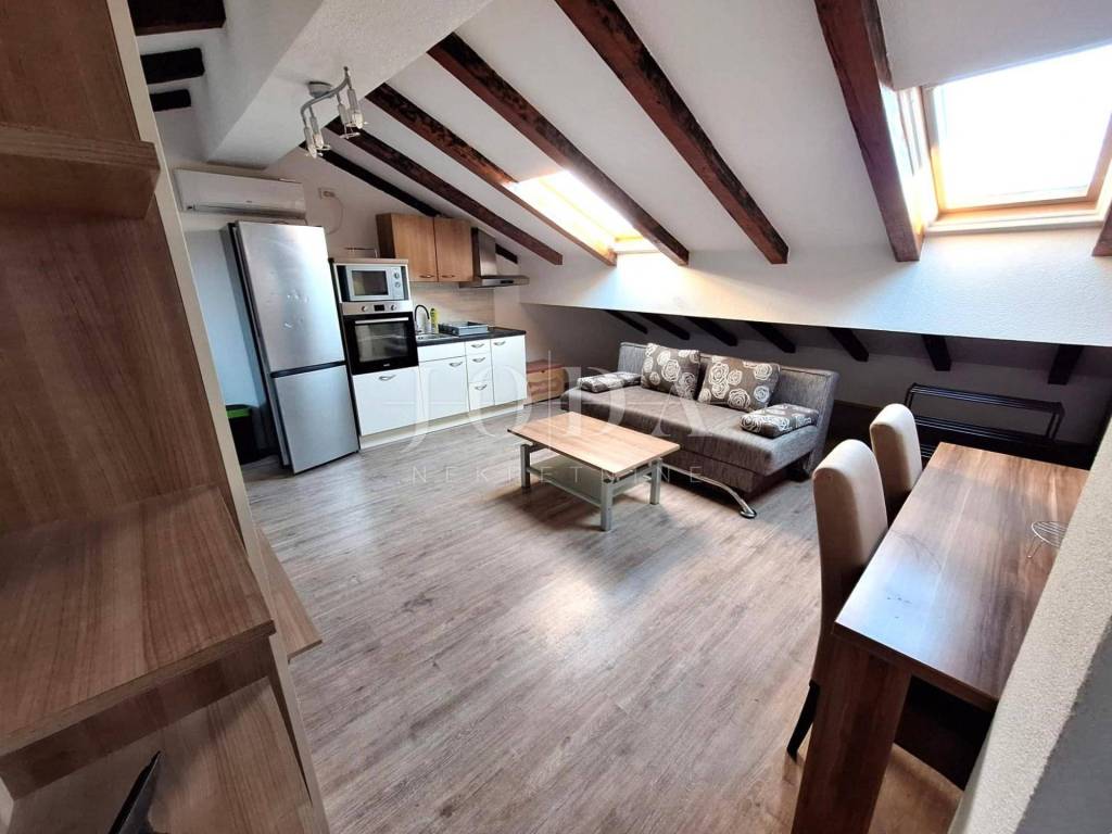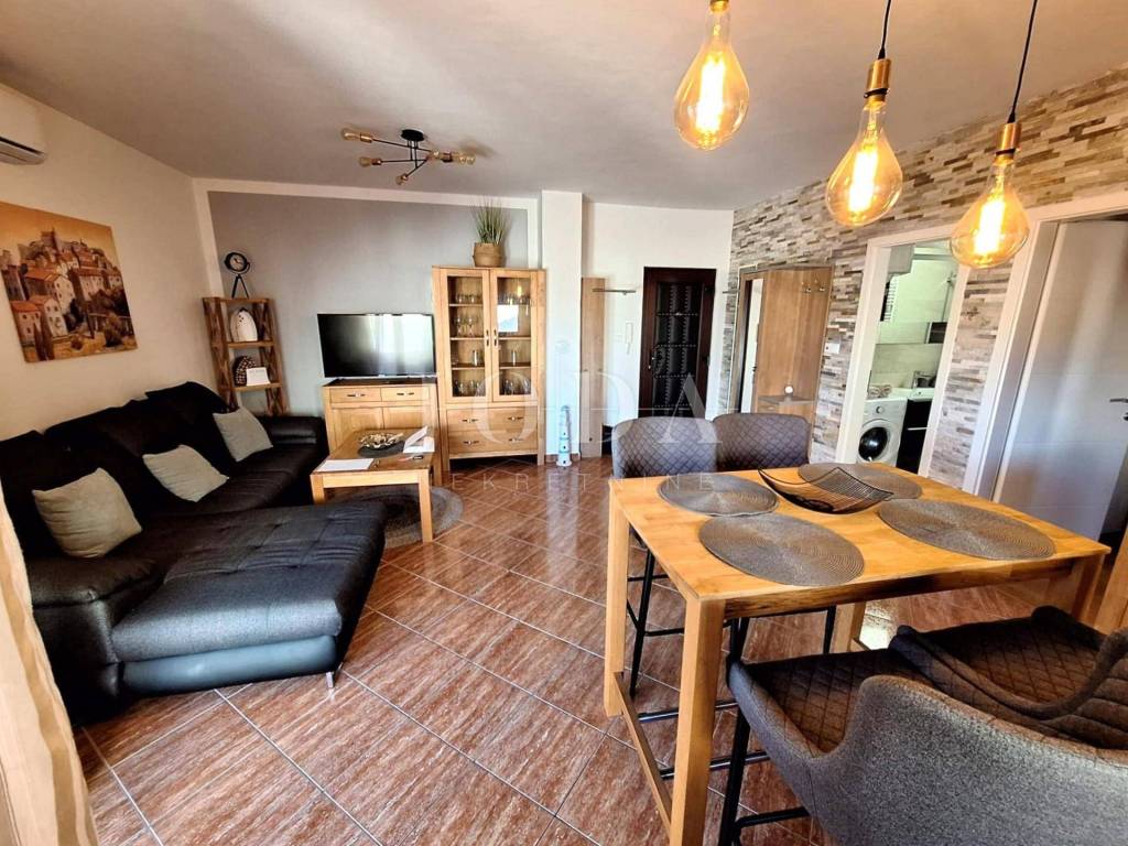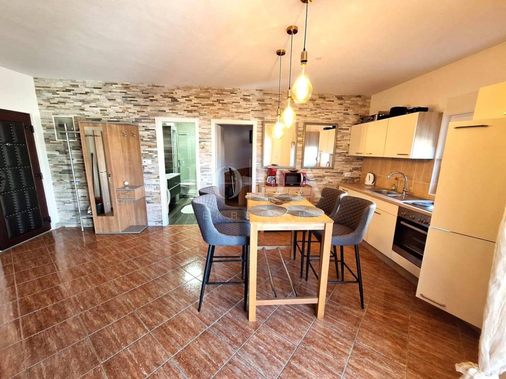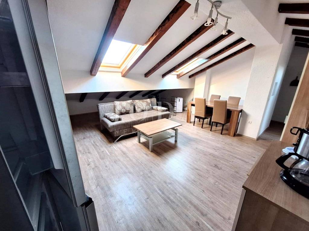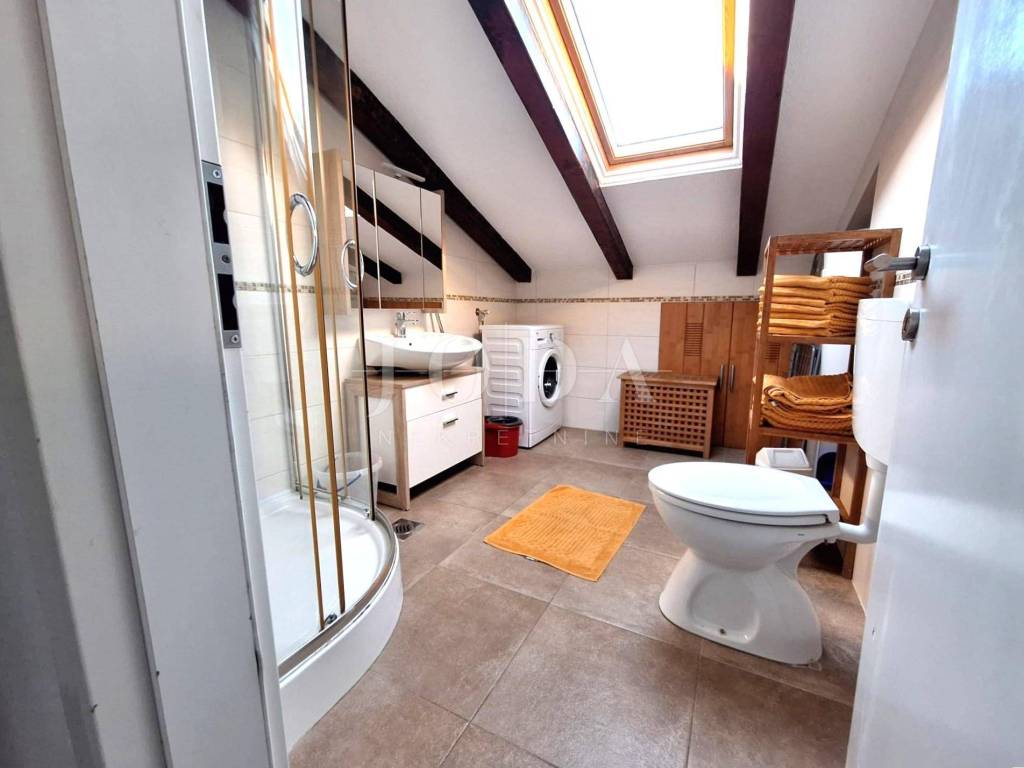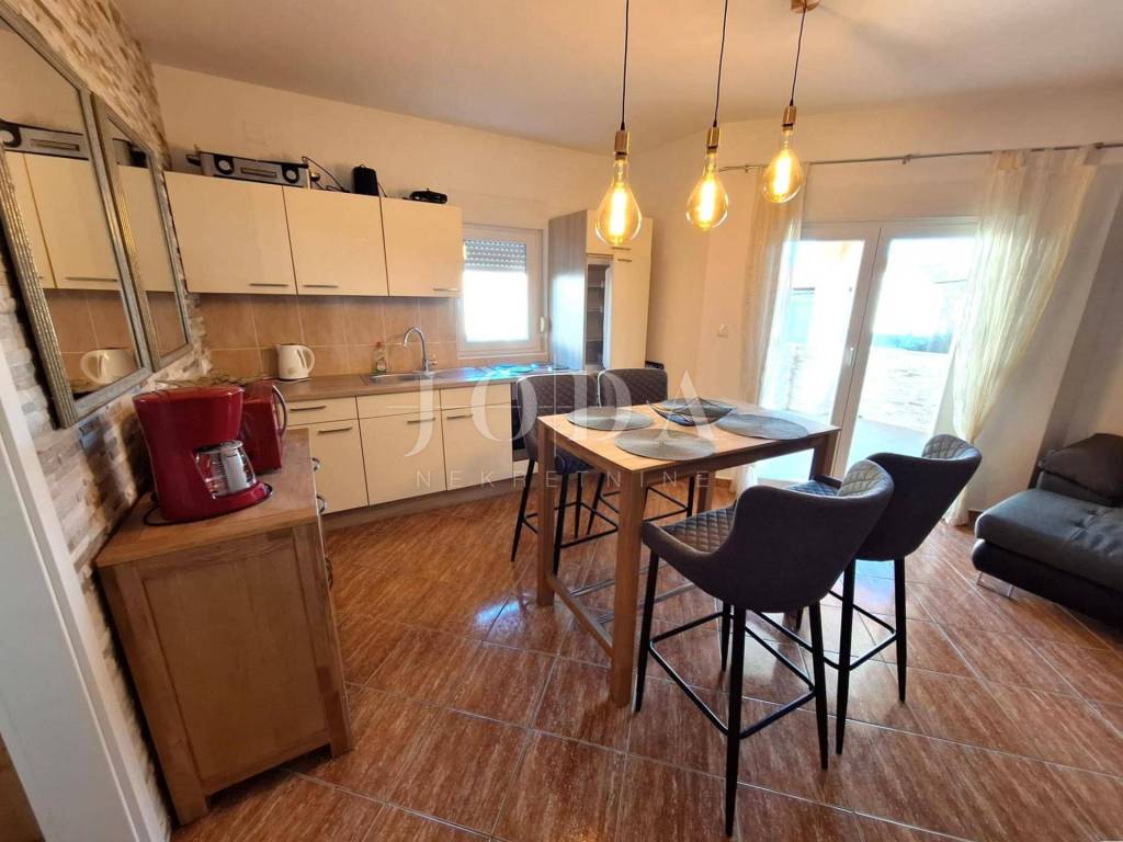 An apartment is for sale in a peaceful area near Malinska, located in a building with a total of six apartments. The apartment is situated on the first floor and includes an associated attic space. It has proper documentation. In the ownership records, it is registered as one independent residential unit, while in practice it is divided into two separate residential units, each with its own entrance.