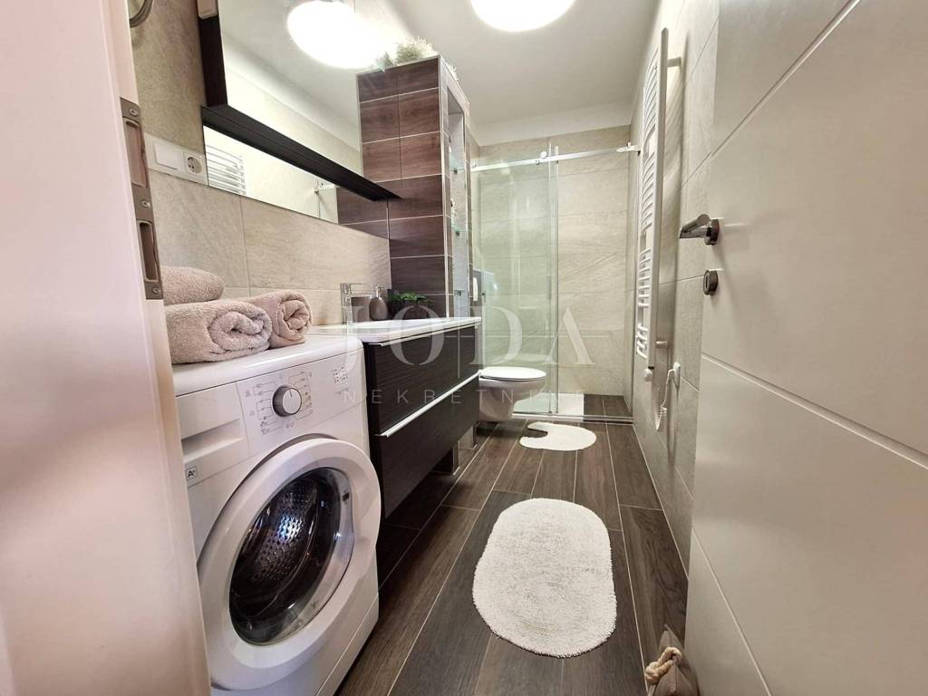 The apartment on the first floor consists of a bedroom, living room with kitchen and dining area, bathroom, and a covered terrace. The attic apartment features one bedroom, an open-plan living room with kitchen and dining area, and a bathroom. The apartment areas are 49.86 m and 44.37 m.