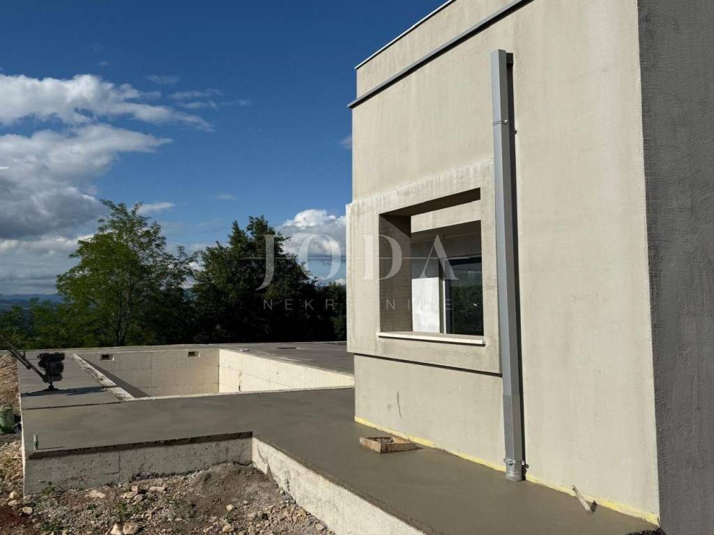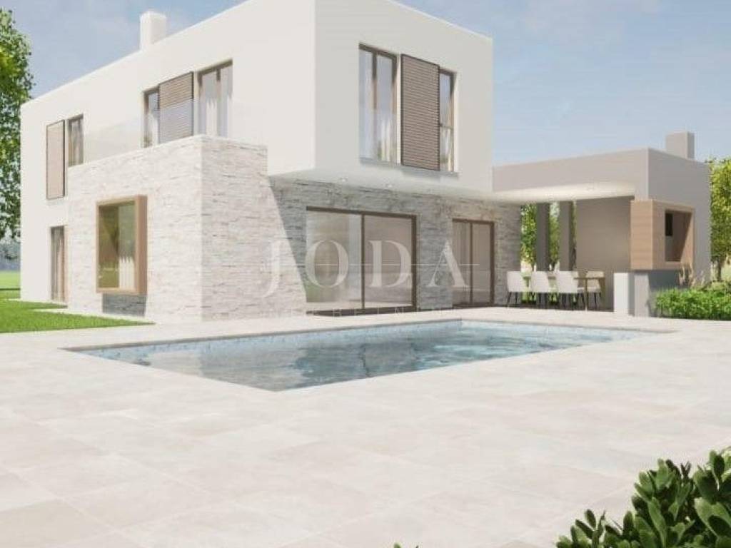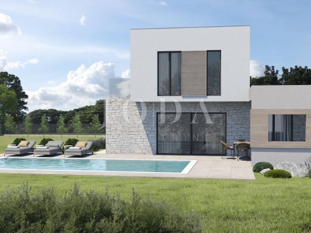 Beautiful villa near Labin. This modern villa of 150m2, on a spacious plot of 1328m2, offers complete privacy. It is designed as a modern and elegant space, illuminated by large glass walls that provide an open panoramic view. On the ground floor there is an entrance hall, open space living room, kitchen and dining room with access to a covered terrace and sunbathing area, a 36m2 swimming pool and a barbecue and socializing area. On the ground floor there is also a bedroom and a bathroom. On the first floor there are two bedrooms, each with its own bathroom, balcony and utility room.
