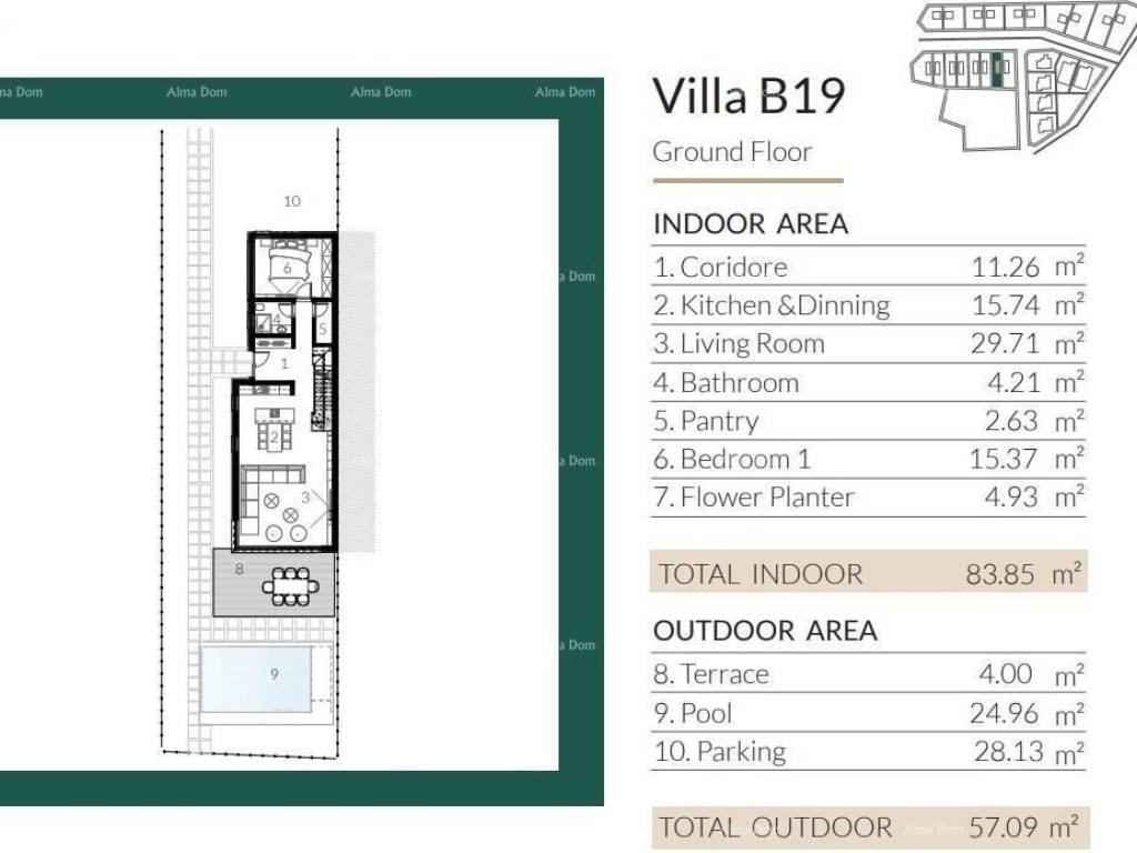 New in the offer, a villa with a pool!These beautiful villas have a unique design.Given their incredible location, they create a natural and unexpected expression of what beautiful, livable, modern spaces can be.See nature from a beautiful, modern home that combines minimalist architecture with rustic design elements.Villa B19, with a total area of 211.95 m2, consists of a ground floor and a first floor. On the ground floor there is a hallway, living room, kitchen with dining room, bathroom, bedroom, pantry and a green area for flowers.The first floor is accessed by stairs and consists of a hallway, 2 bedrooms, 2 bathrooms and a large covered terrace.There is a swimming pool in the yard.The villa has two parking spaces.The villas are located along the beautiful coast of Istria, between the sea and the forest, providing comfort and convenience - close enough to the big cities for your metropolitan needs and far enough to enjoy your seaside retreat.The complex will have a swimming pool, wellness center and SPA, exercise gym, children"s playground, restaurant and bar.Also, the complex will be under surveillance 24/7, a reception and parking spaces for charging electric cars.Your feeling of summer will last all year round.Note: The stated price is for legal entities. For private individuals, a VAT of 25% is added to the price.For more information, please contact:Azra +385 91 6115706+385 98420885azra@almadominvest.com