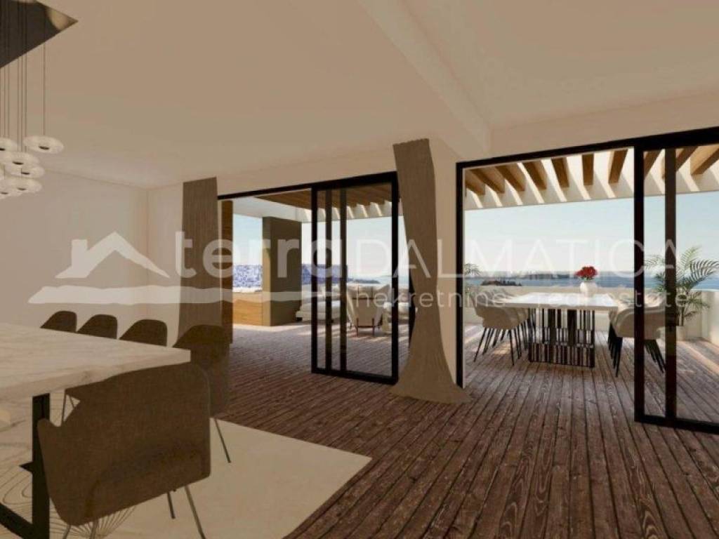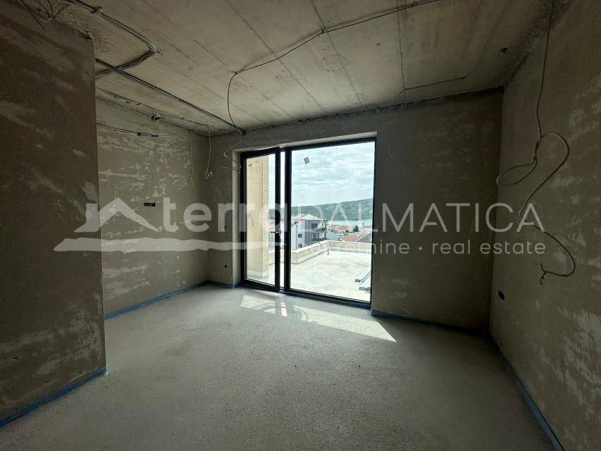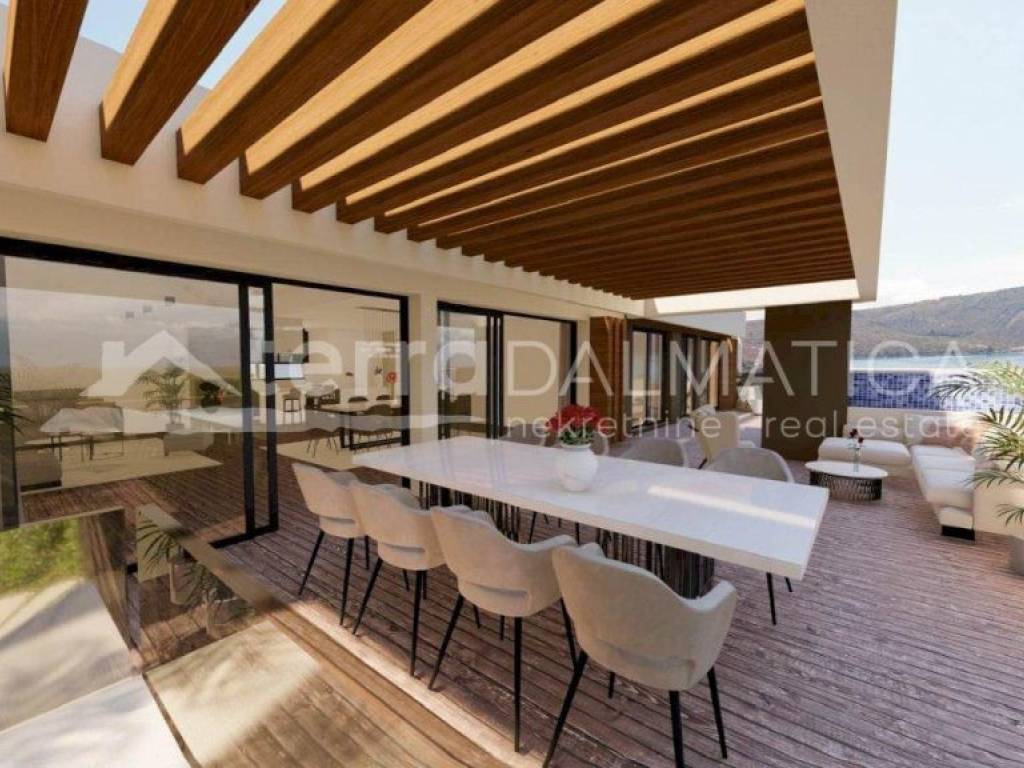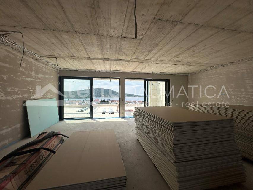 It is our pleasure and honor to present a new project with luxury apartments in Primosten. A modern look, top-quality materials and equipment, and a breathtaking view are the advanteges that make this project special. The building, which is currently under construction, consists of seven residential units distributed over four above-ground floors, as well as garages and storage rooms located in the basement. Completion of the works and occupancy is expected in 2025. Penthouse S7 covers the entire top floor. It consists of a spacious kitchen, dining room and living room with a total area of 61.92 m2, three bedrooms, one of which has its own bathroom and sauna, additional bathroom, toilet and laundry room. The exterior of the apartment consists of a loggia and a terrace with a hot tub. The apartment has a garage and a storage room in the basement, as well as one outdoor parking space. All apartments will be equipped with burglar-proof doors, video surveillance, high-quality ALU carpentry with blinds on electric lifters, underfloor heating with a heat pump. The apartments on the ground floor have an outdoor pool, and the other apartments have hot tubs on the terraces. The building will also have a built-in elevator. Primosten is a beautiful Dalmatian town widely known for its pebble beaches. It is one of the most picturesque small towns on the Adriatic, with many characteristic narrow streets in the old town. In addition to the natural beauty, you can also enjoy various seafood delicacies and widely known wine in one of the many restaurants in Primosten. Contact our agent and schedule your tour. Note: Renderings are used in the ad.