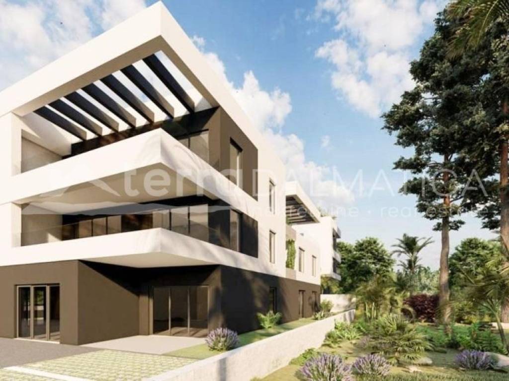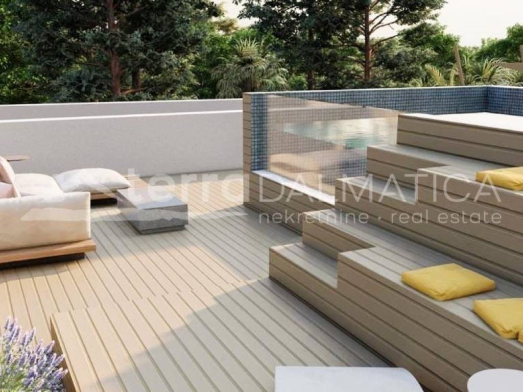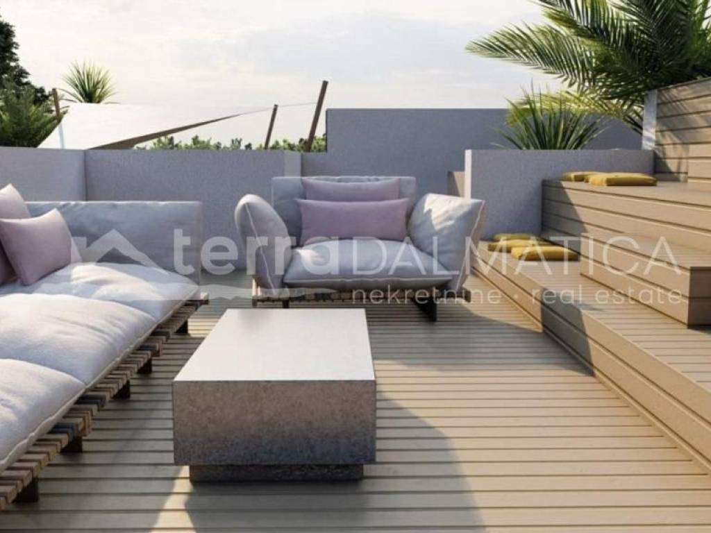 A luxury apartment with roof terrace is for sale in Tribunj. It is located in an apartment building near the marina, only a five-minute walk from the town center and the beach. The building is currently under construction, and completion of the works and occupancy is expected at the beginning of 2024. Apartment E has a total net usable area of 128.47 m2 and consists of a kitchen, living room, two bedrooms with their own bathrooms, hallway, storage room, wardrobe, three terraces, and the associated roof terrace where the swimming pool will be placed. From the apartment, and especially from the roof terrace, there will be a beautiful view of the sea and the town. The apartment has one garage parking space. From the equipment that will be installed, we can single out electric underfloor heating, aluminum carpentry, electric roller blinds, mosquito nets, high-quality sanitary ware, air conditioners... Tribunj is a small Dalmatian town and port in the middle Adriatic. Although it has turned to tourism in recent decades, it still retains the charm of a small and authentic Dalmatian town. The old core of Tribunj with its characteristic stone houses is located on an islet connected to the mainland by a stone bridge. Tribunj has two city beaches and a built promenade to Sovlje on one side and nearby Vodice on the other. In the hinterland there are organized hiking and cycling trails. Tribunj has a diverse catering offer, and considering the large fishing fleet, the restaurant offer always offers fresh fish. The national parks of Krka and Kornati are nearby, as well as the city of Sibenik, and the airport is only an hour's drive away. Contact our agent and schedule your tour.