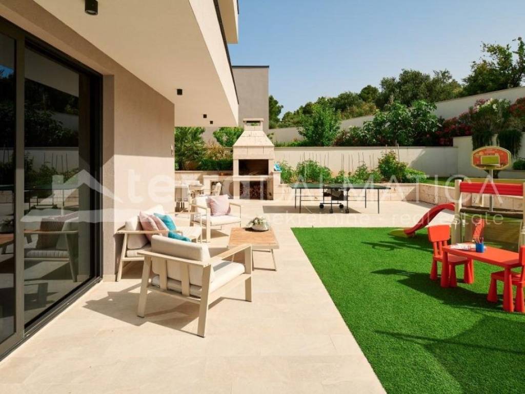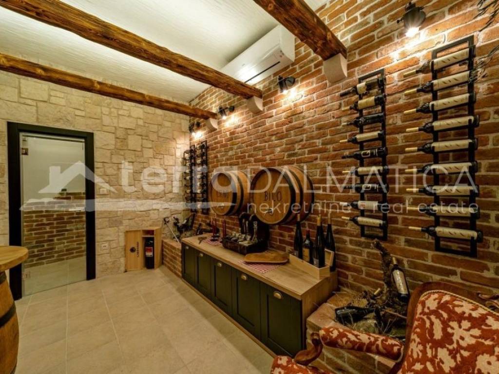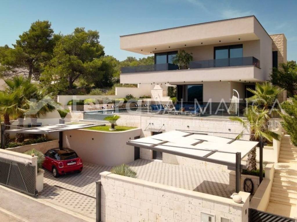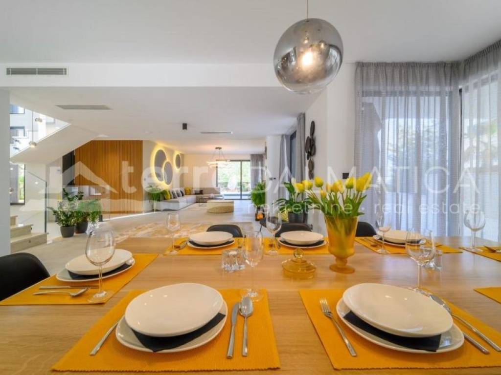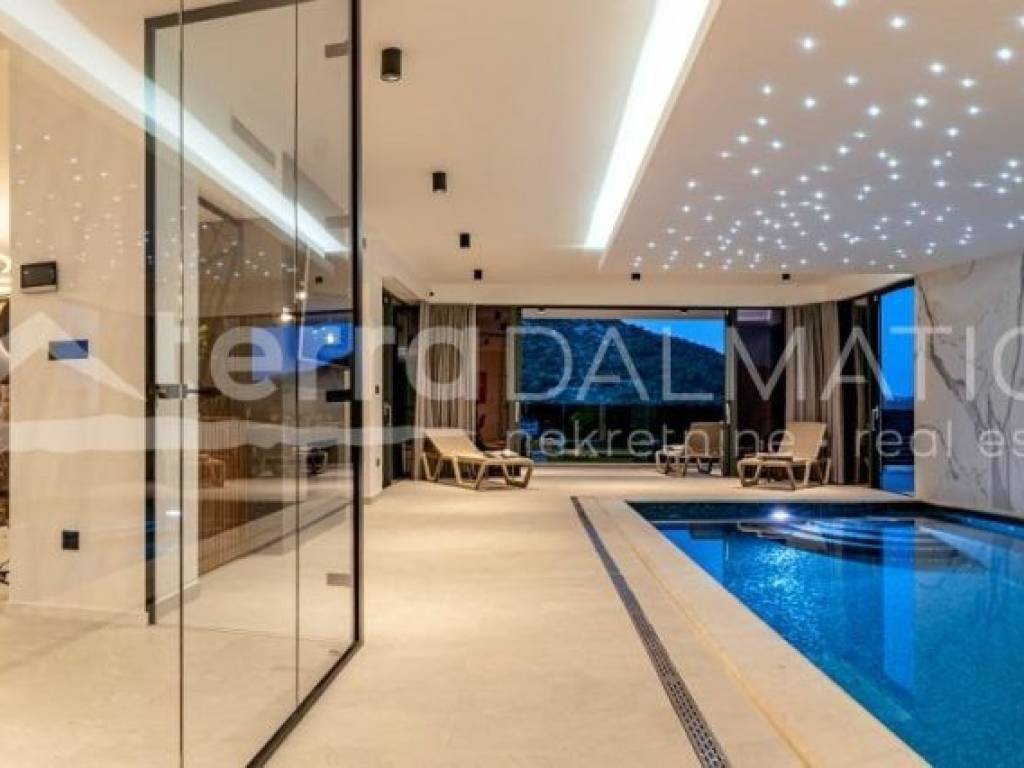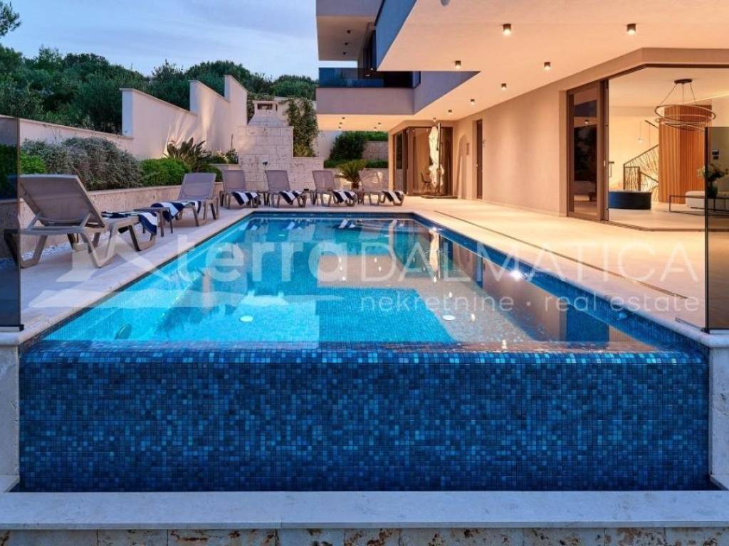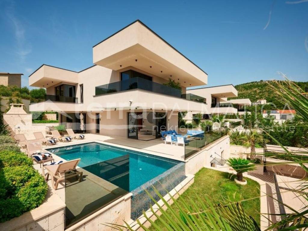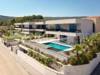 In Marina, a resort with three luxury villas, MARINA HILLS RESORT, is for sale. The resort consists of 3 villas with a total of 12 bedrooms, two outdoor and one indoor swimming pool. The villas are designed in such a way that on the ground floor there is a spacious living area, which on the front side continues to a terrace with a swimming pool and a sunbed, and on the side to a beautifully landscaped garden with a barbecue, a dining area and a children's playground. The terraces offer a beautiful panoramic view of the sea and the landscape. An elegantly decorated staircase leads to the first floor, where there are four bedrooms, each with its own bathroom and terrace, and almost each of them has a panoramic view of the sea. In the basement there are fully equipped gyms and a sauna, and in one villa there is also a children's playroom. All pools are heated, and in addition, floor heating has been installed around the two outdoor pools, so they can be used throughout the year. In two villas, there is an one apartment in the basement in each of them, while in the third there is a fully equipped tavern decorated with handmade wooden furniture, a professional kitchen, underfloor heating and a large fireplace. Next to the tavern, there is also a game room equipped with various entertainment facilities. Marina Hills Resort villas are a perfect combination of modern and spacious design, comfort and beautiful scenery. All three villas are designed as a whole by themselves, and the privacy of each of them is respected, both in terms of construction and horticultural design. Hundreds of plant seedlings have been planted in the resort, from palm trees and other ornamental shrubs and flowers to various fruit trees (cherries, plums, citrus fruits...). All green areas are equipped with automatic watering, and are taken care of by a licensed agronomist. In order for the comfort in the villas to be complete, top-quality equipment has been installed, among which we can single out Hitachi air conditioners that, in combination with the heat pump, provide a reliable system of cooling, underfloor heating and air heating as needed, video surveillance by the well-known manufacturer Saphire, an alarm system of the manufacturer DCS, electrical appliances manufactured by Bosch and Liebherr. A beautiful pebble beach is only 150 m away, and the bay where the Marina is located is quiet and peaceful, and protected from strong winds. Well-thought-out architecture, top-quality equipment and design, a combination of outdoor and indoor swimming pools and all other additional facilities are the trump cards for buying this luxury resort. If you are looking for an investment property, or a property that you would personally enjoy with an additional source of income, this is the right opportunity for you. Marina is a small, quiet fishing village located in a beautiful bay with clean sea and untouched nature. Nearby there are several beautiful bays known for their beautiful pebble and sandy beaches. In the Marina there are several shops, restaurants and cafes, as well as a small marina for boaters, and the beautiful town of Trogir is a 10-minute drive away. Contact our agent and schedule your tour.
