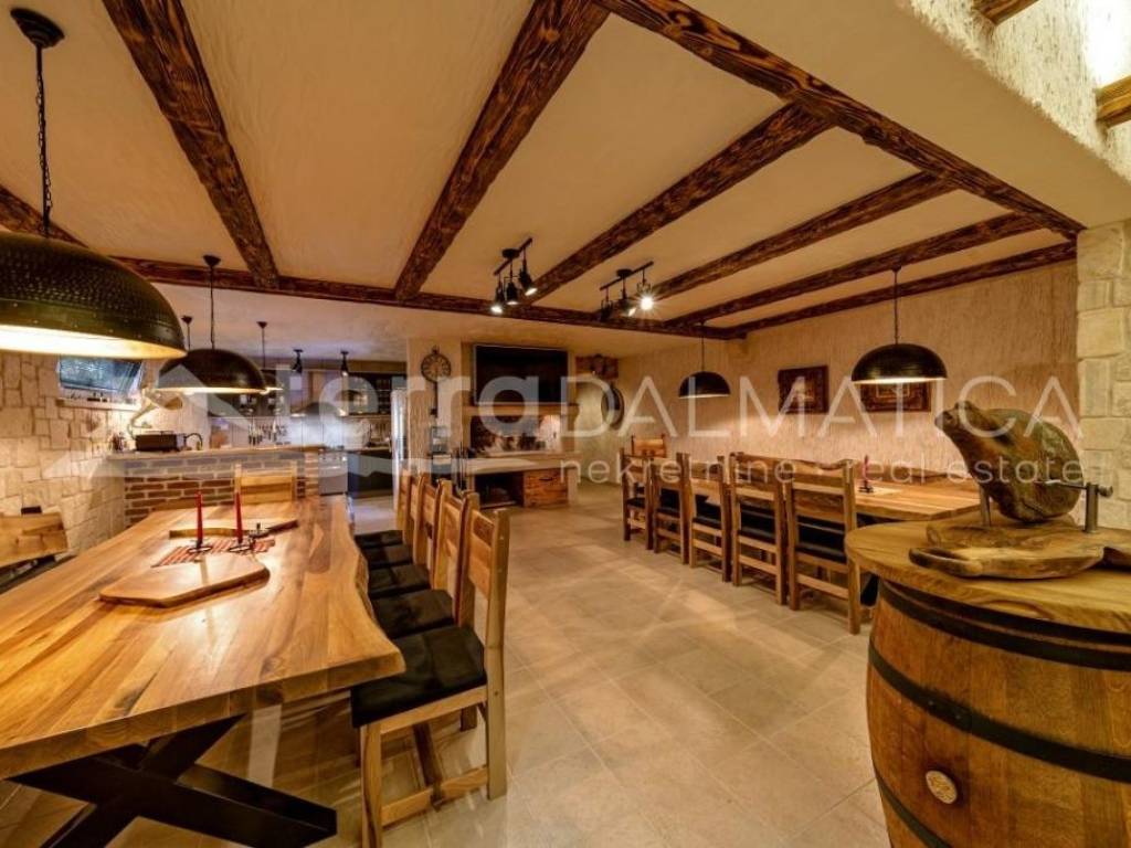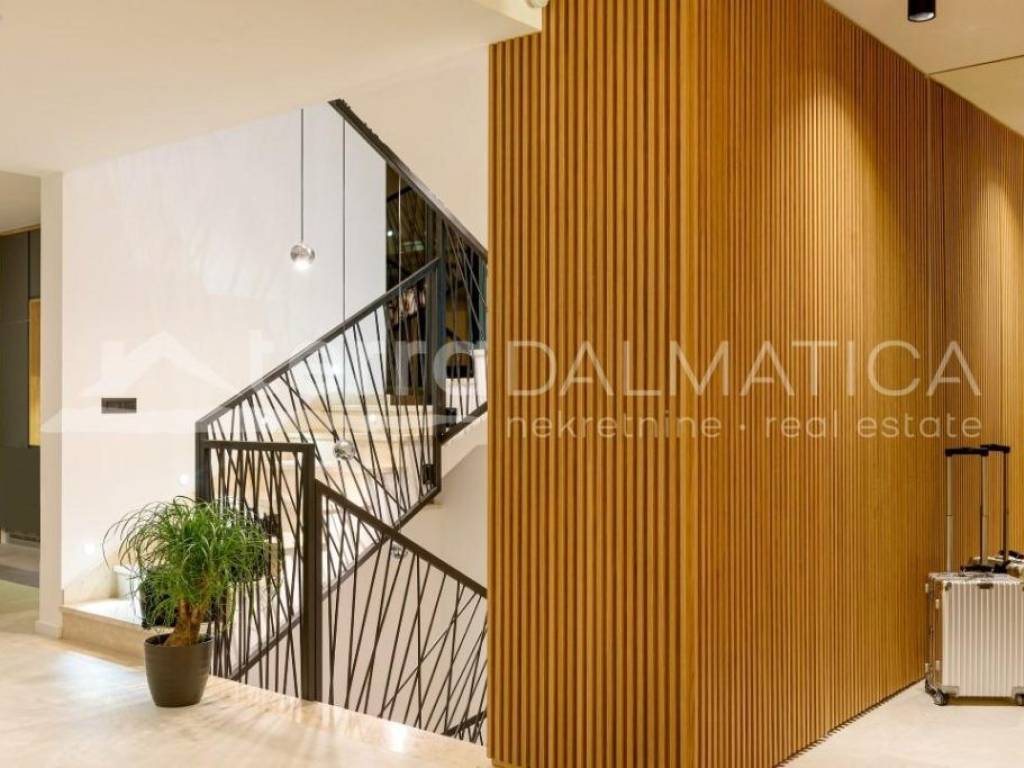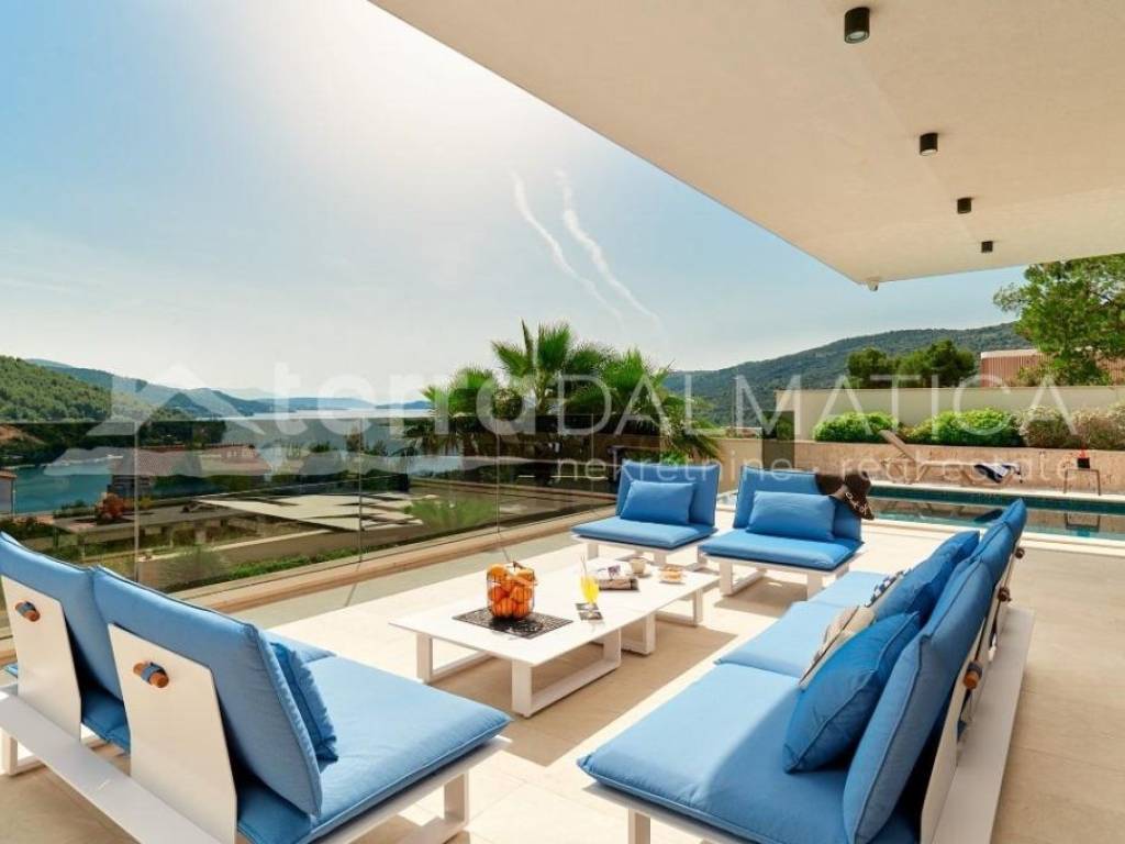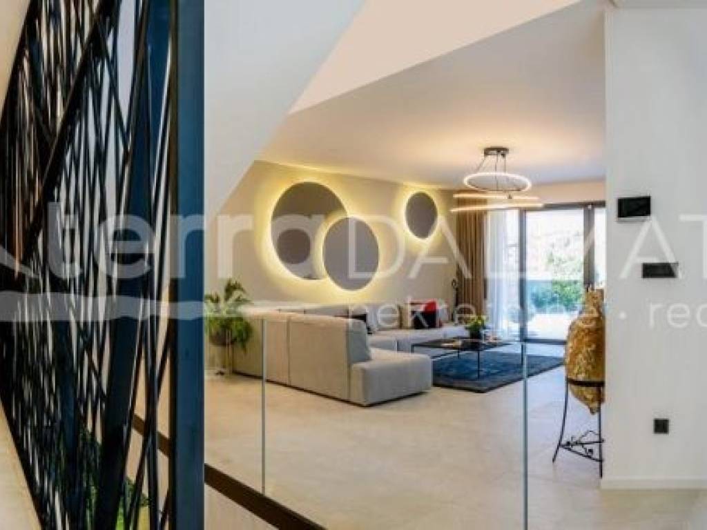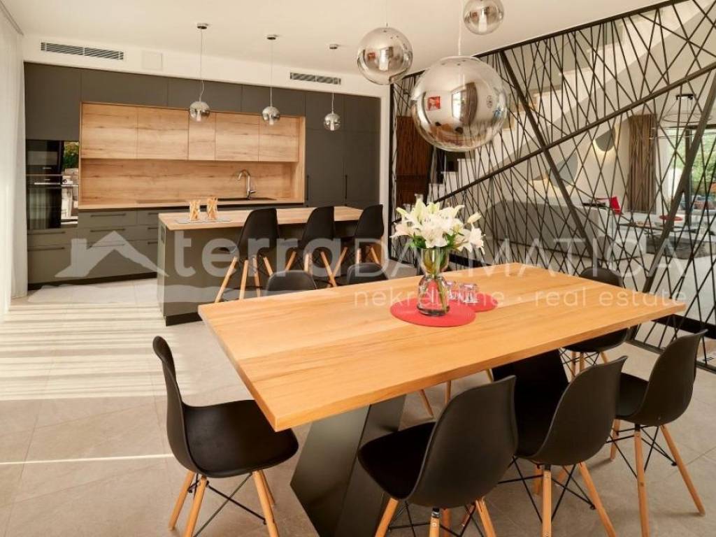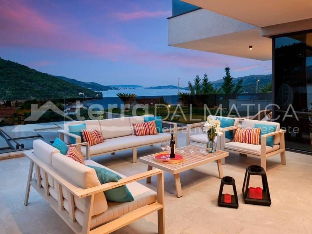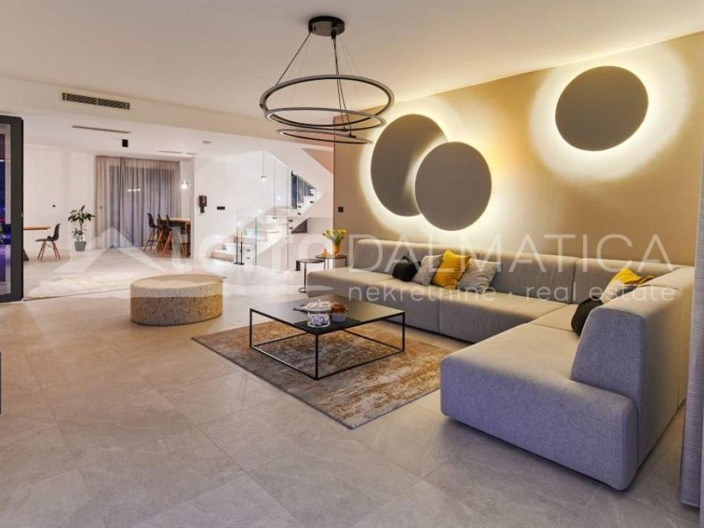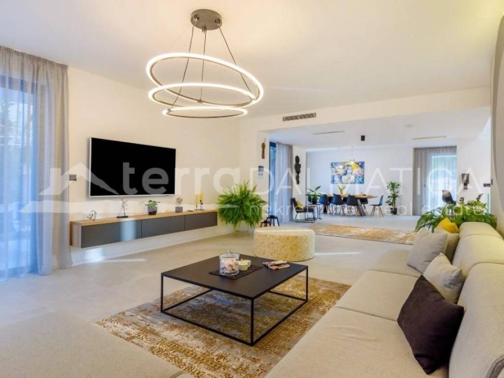 In Marina, a resort with three luxury villas, MARINA HILLS RESORT, is for sale. The resort consists of 3 villas with a total of 12 bedrooms, two outdoor and one indoor swimming pool. The villas are designed in such a way that on the ground floor there is a spacious living area, which on the front side continues to a terrace with a swimming pool and a sunbed, and on the side to a beautifully landscaped garden with a barbecue, a dining area and a children's playground. The terraces offer a beautiful panoramic view of the sea and the landscape. An elegantly decorated staircase leads to the first floor, where there are four bedrooms, each with its own bathroom and terrace, and almost each of them has a panoramic view of the sea. In the basement there are fully equipped gyms and a sauna, and in one villa there is also a children's playroom. All pools are heated, and in addition, floor heating has been installed around the two outdoor pools, so they can be used throughout the year. In two villas, there is an one apartment in the basement in each of them, while in the third there is a fully equipped tavern decorated with handmade wooden furniture, a professional kitchen, underfloor heating and a large fireplace. Next to the tavern, there is also a game room equipped with various entertainment facilities. Marina Hills Resort villas are a perfect combination of modern and spacious design, comfort and beautiful scenery. All three villas are designed as a whole by themselves, and the privacy of each of them is respected, both in terms of construction and horticultural design. Hundreds of plant seedlings have been planted in the resort, from palm trees and other ornamental shrubs and flowers to various fruit trees (cherries, plums, citrus fruits...). All green areas are equipped with automatic watering, and are taken care of by a licensed agronomist. In order for the comfort in the villas to be complete, top-quality equipment has been installed, among which we can single out Hitachi air conditioners that, in combination with the heat pump, provide a reliable system of cooling, underfloor heating and air heating as needed, video surveillance by the well-known manufacturer Saphire, an alarm system of the manufacturer DCS, electrical appliances manufactured by Bosch and Liebherr. A beautiful pebble beach is only 150 m away, and the bay where the Marina is located is quiet and peaceful, and protected from strong winds. Well-thought-out architecture, top-quality equipment and design, a combination of outdoor and indoor swimming pools and all other additional facilities are the trump cards for buying this luxury resort. If you are looking for an investment property, or a property that you would personally enjoy with an additional source of income, this is the right opportunity for you. Marina is a small, quiet fishing village located in a beautiful bay with clean sea and untouched nature. Nearby there are several beautiful bays known for their beautiful pebble and sandy beaches. In the Marina there are several shops, restaurants and cafes, as well as a small marina for boaters, and the beautiful town of Trogir is a 10-minute drive away. Contact our agent and schedule your tour.