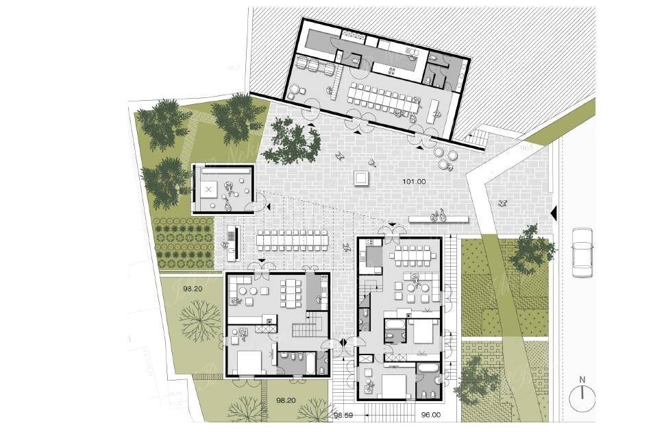 Centralni seoski trg okružen je sa 2 kamene kuće gdje su smješteni spavaći kapaciteti, ugostiteljski dio sa velikom tavernom, etničkim muzejom, vinarijom, roštiljem te glavna kuća gdje su smješteni svi potrebni sadržaji da cijeli kopleks funkcionira savršeno. Neizostavan dio pravog sela je i kapelica, a smjestena je u gornjem dijelu kompleksa ali i teren za dobro poznatu igru Balota dok dašak luksuza svakako daje područje wellnessa sa svim sadržajima za opuštanje.