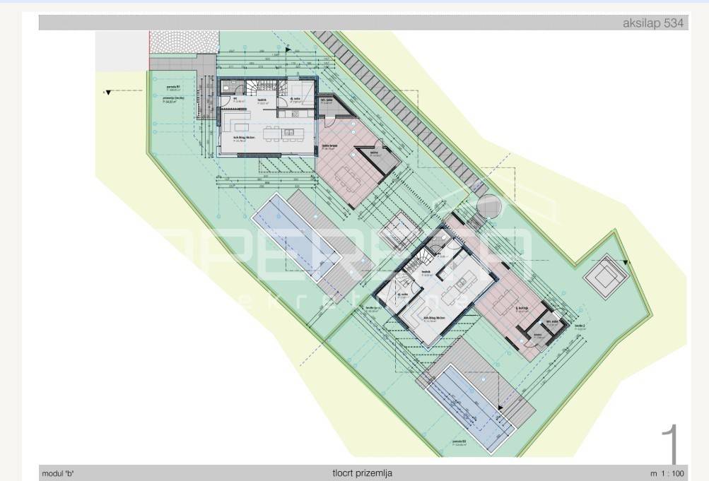 Parcela posjeduje važeću građevinsku dozvolu te kompletnu projektnu dokumentaciju za izgradnju dviju modernih vila. Predviđene su vile oznaka B1 površine 188 m i B2 površine 175 m, koje se sastoje od prizemlja i kata, s tri spavaće sobe, bazenom i ljetnom kuhinjom, prema projektu Modul B.