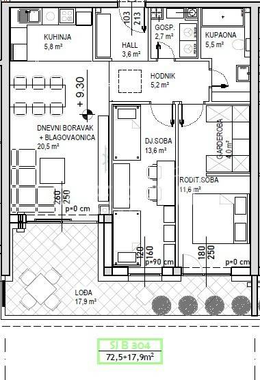 Prodaje se stan površine 72,5 m2 s lođom površine 17,9 m2 na 3. katu niskoenergetske stambeno poslovne zgrade na odličnoj lokaciji. Zgrada se sastoji od podruma, visokog prizemlja, prvog, drugog i trećeg kata te sadrži ukupno 74 stambene jedinice i 7 poslovnih prostora. Završetak gradnje predviđen je krajem 2025./početak 2026. Energetski razred je A+. Moguć je odabir podnih obloga (keramika, parket ili laminat) te odabir unutarnje stolarije. Uz stan moguća je kupovina vanjskog parkirnog mjesta, garažnog mjesta bez spremišta ili garažnog mjesta sa spremištem.