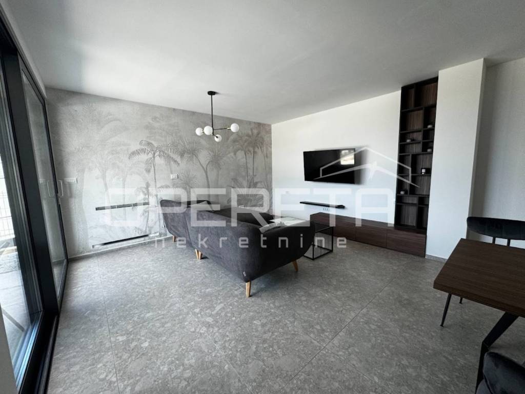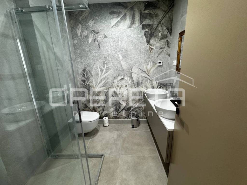 The apartment is equipped with underfloor heating throughout, powered by heat pumps, plus air conditioning in every room for year-round comfort. It is sold fully furnished, ready for immediate move-in. The construction showcases premium materials, including triple-glazed thermopane windows, wooden interior joinery, aluminum exterior joinery, stone flooring, and high-quality bathroom fixtures.