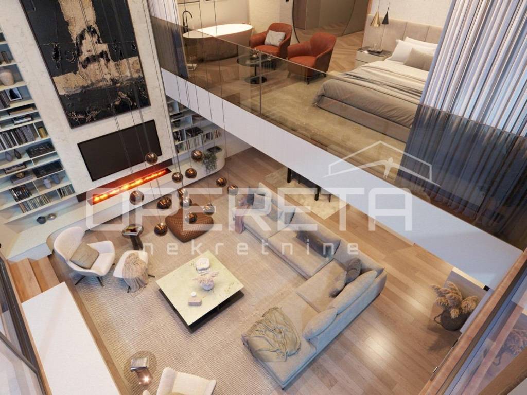 The apartment consists of three spacious bedrooms, each with its own bathroom, an additional guest toilet and an impressive living room with a ceiling height of 7 meters and a glass wall that provides an open, unobstructed view of the sea. The space exudes light and elegance, creating a feeling of luxury and openness.