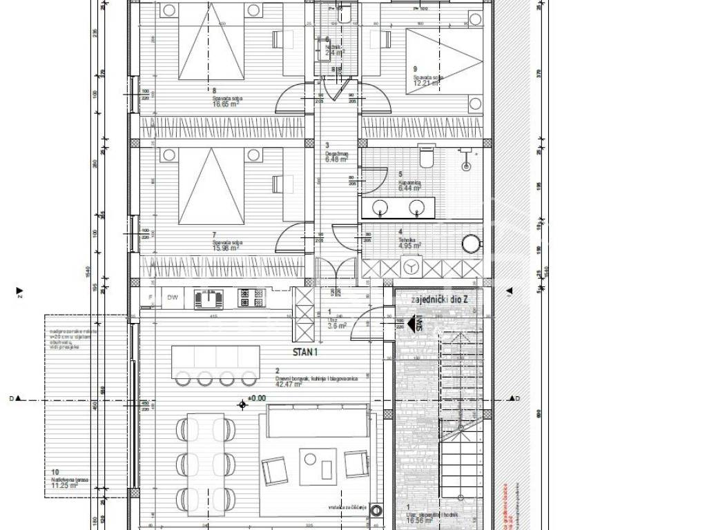 Stan ima tri spavaće sobe svaka dovoljno prostrana da omogući maksimalnu udobnost i privatnost. Dvije natkrivene terase koje daju stanu dodatnu vrijednost.