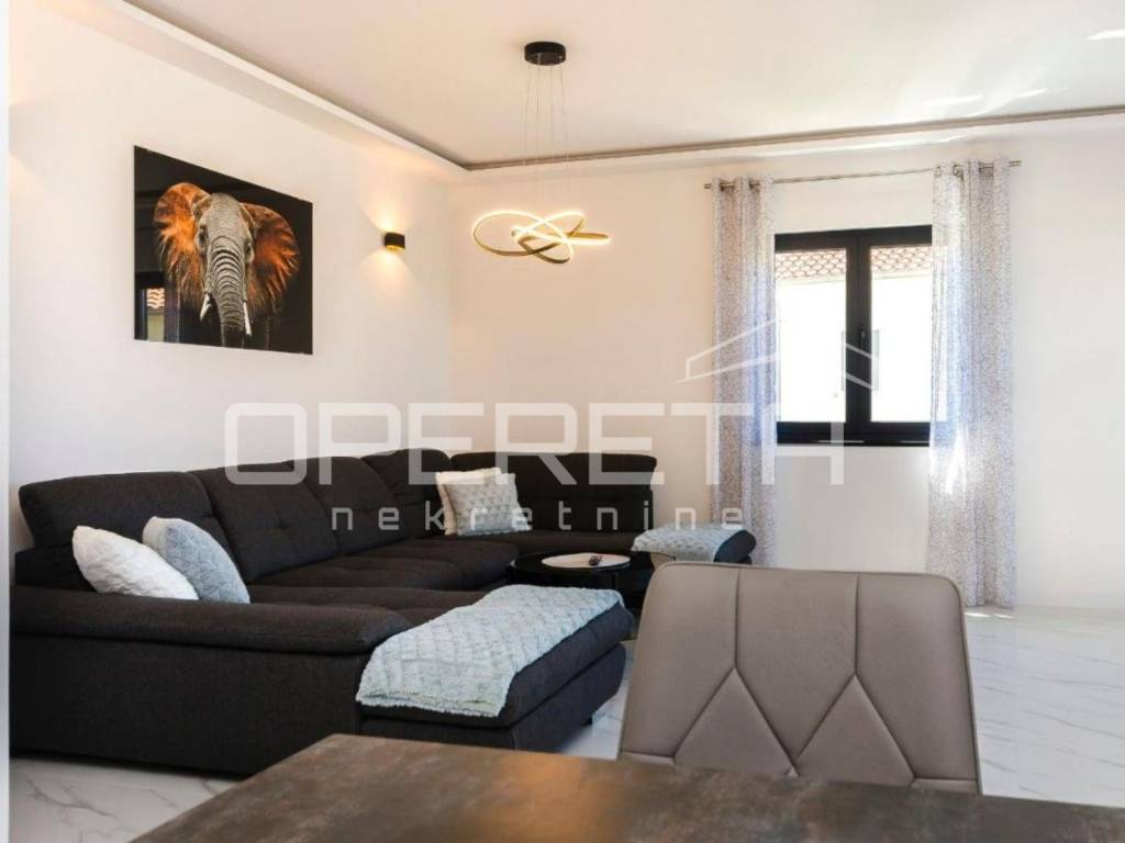 Opremljen je modernim sustavima za ugodan boravak tijekom cijele godine: podnim grijanjem u dnevnim sobama i kupaonicama, električnim podizačima roleta, solarnim panelima, dizalicom topline. Parkirno mjesto osigurano je u dvorištu zgrade.