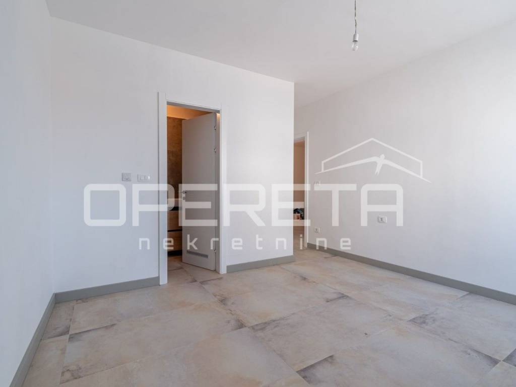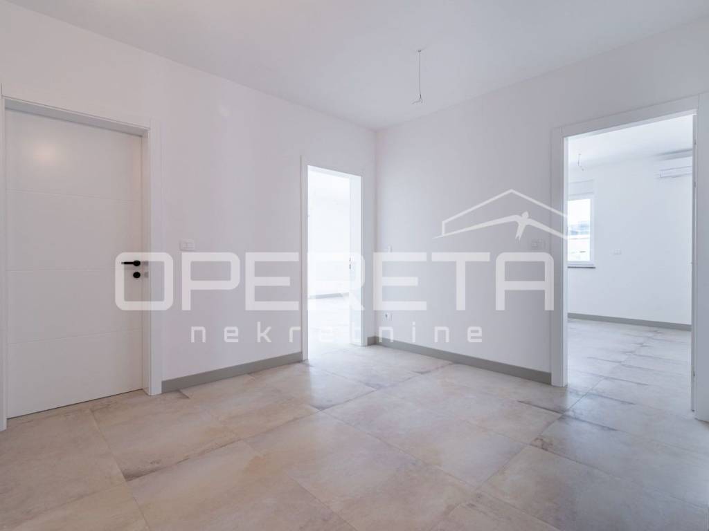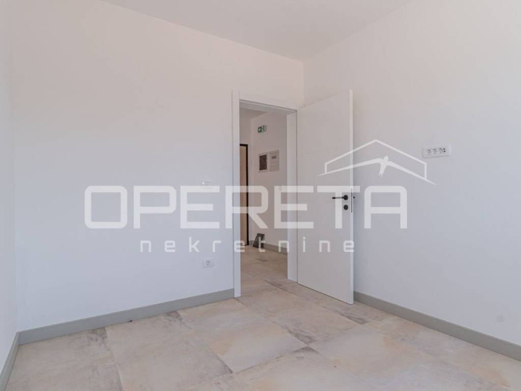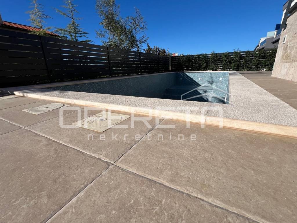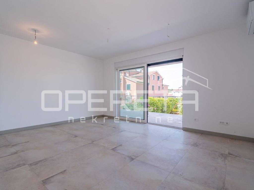 Istria, Banjole, just 320 m from the sea, a new apartment on the ground floor of a building is for sale. The apartment is characterized by top quality workmanship and materials. The net usable area of the apartment is 110 m2, while the net living area is 92.13 m2. The apartment has a 131 m2 garden with a swimming pool. The apartment is completed and ready to move in, and is being sold unfurnished. The apartment consists of a spacious hallway, three bedrooms (one en suite with bathroom), an additional bathroom and a living room with a kitchen and dining room with access to the outside - a covered terrace and a swimming pool. There is a Mitsubishi air conditioner in each room, and electric underfloor heating has been implemented throughout the entire apartment with thermostats for regulation in each room. The flooring in all rooms is top-quality Lamborghini ceramics. The apartment comes with two parking spaces and a storage room.
