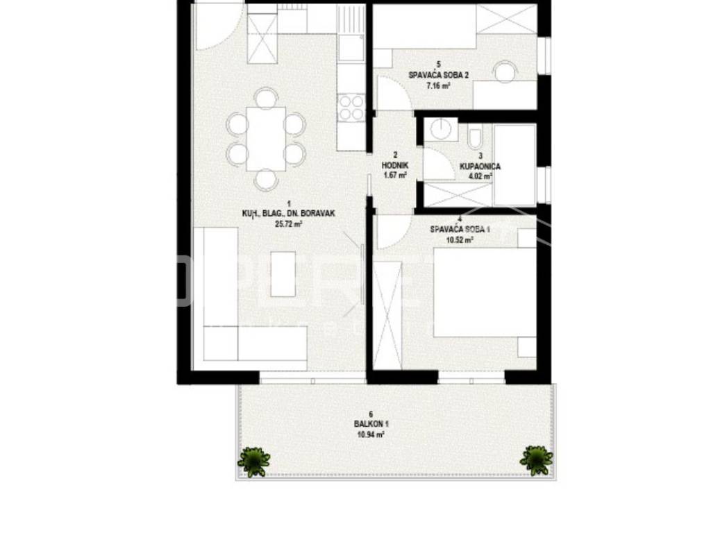 The living room, kitchen, and dining area form a bright open space filled with natural light. The bedroom and additional room provide privacy and relaxation. The apartment has one balcony offering a pleasant outdoor connection and a Mediterranean lifestyle.