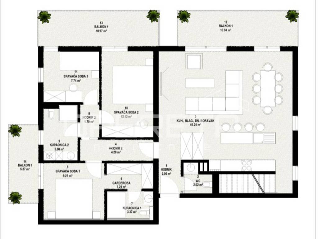 The apartment features three balconies and a spacious terrace of 21.18 m, perfect for relaxing, outdoor dining, and enjoying warm Mediterranean evenings. These outdoor areas enhance the sense of openness and connection with the surroundings.