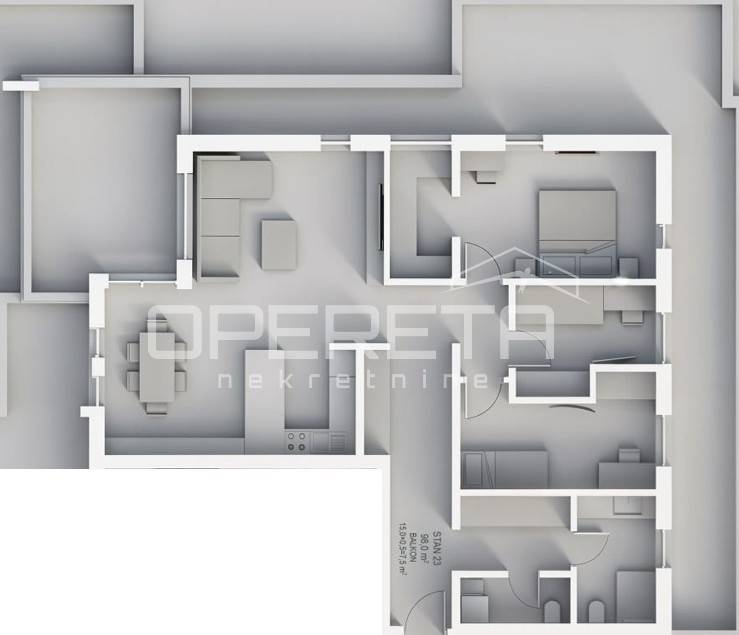 Stan oznake S23 nalazi se na 3. katu stambene zgrade u izgradnji od ukupno 3 kata. Sastoji se od velikog "open space" dnevnog boravka s kuhinjom i blagovaonicom te izlazom na terasu, master spavaće sobe s garderobom, 2 spavaće/radne sobe, kupaonice s wc-om, spremišta, zasebnog wc-a, ulaznog prostora i hodnika.