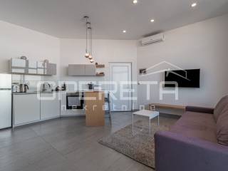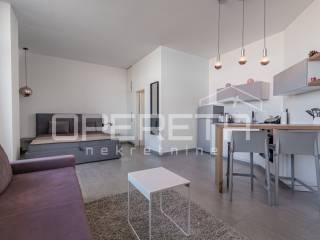 Impressive studio apartment in an exceptional location only 100 meters from the sea, with all urban amenities in the immediate vicinity. The interior has an open concept that connects the living and night areas and a fully glazed wall facing the terrace, providing plenty of natural light and beautiful views.