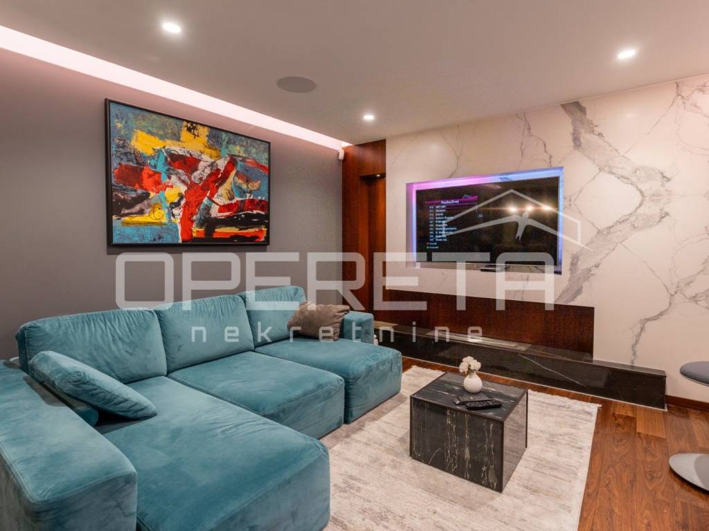 The outdoor space is carefully landscaped with Mediterranean plants and trees, and the automatic irrigation system takes care of garden maintenance.