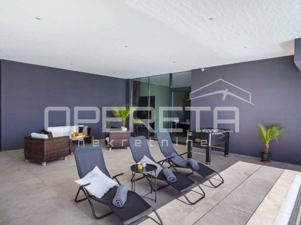 The pool is heated by a 15 kW inverter heat pump + solar panels on the roof of the building. It also has the most modern water disinfection using salt, electrolysis creates natural chlorine. The swimming pool sunbathing area also provides a barbecue and plenty of space for socializing and relaxing.