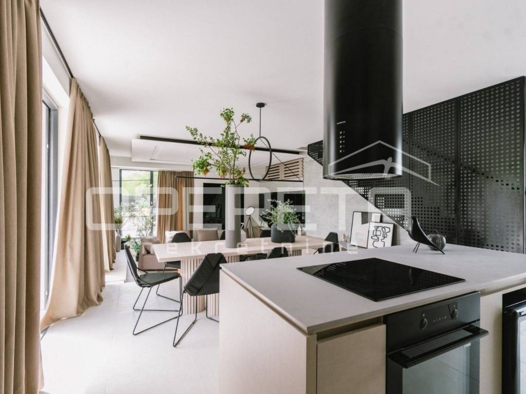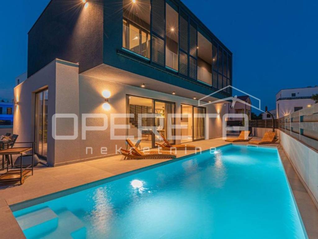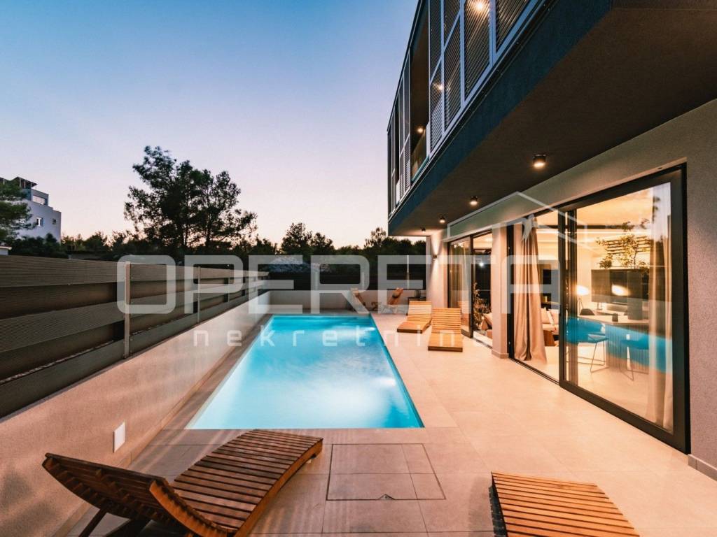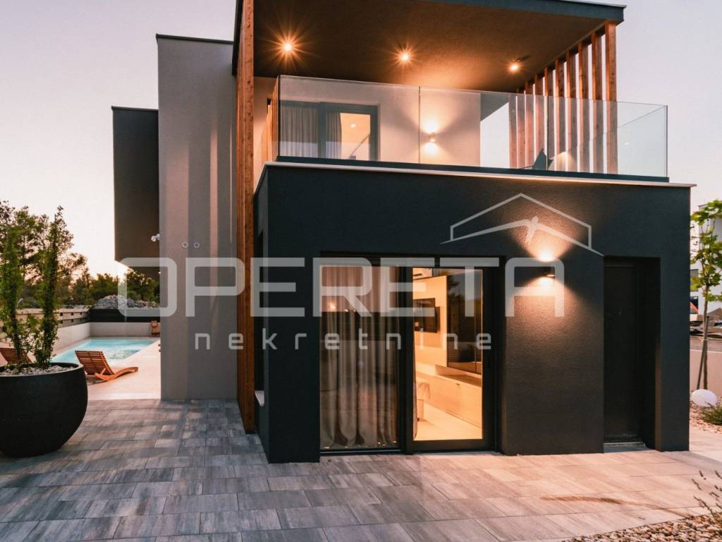 An extraordinary designer villa for sale in Vodice, combining contemporary architecture, refined aesthetics, and functionality in every detail. This unique property of 200 m is set on a 400 m plot, thoughtfully utilized to provide a perfect balance of comfort and outdoor amenities. The landscaped courtyard features two covered private parking spaces and two additional ones outside, complemented by rich Mediterranean greenery, a sunbathing area, jacuzzi, a 10-meter swimming pool, and a barbecue zone that together create a private oasis of relaxation.