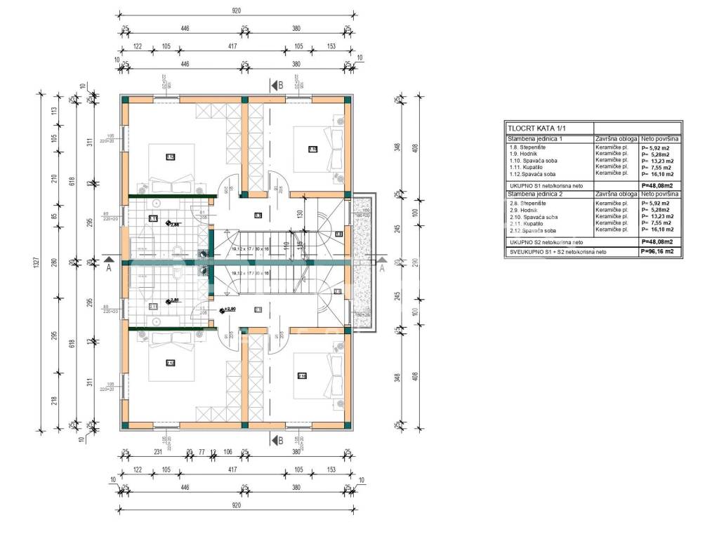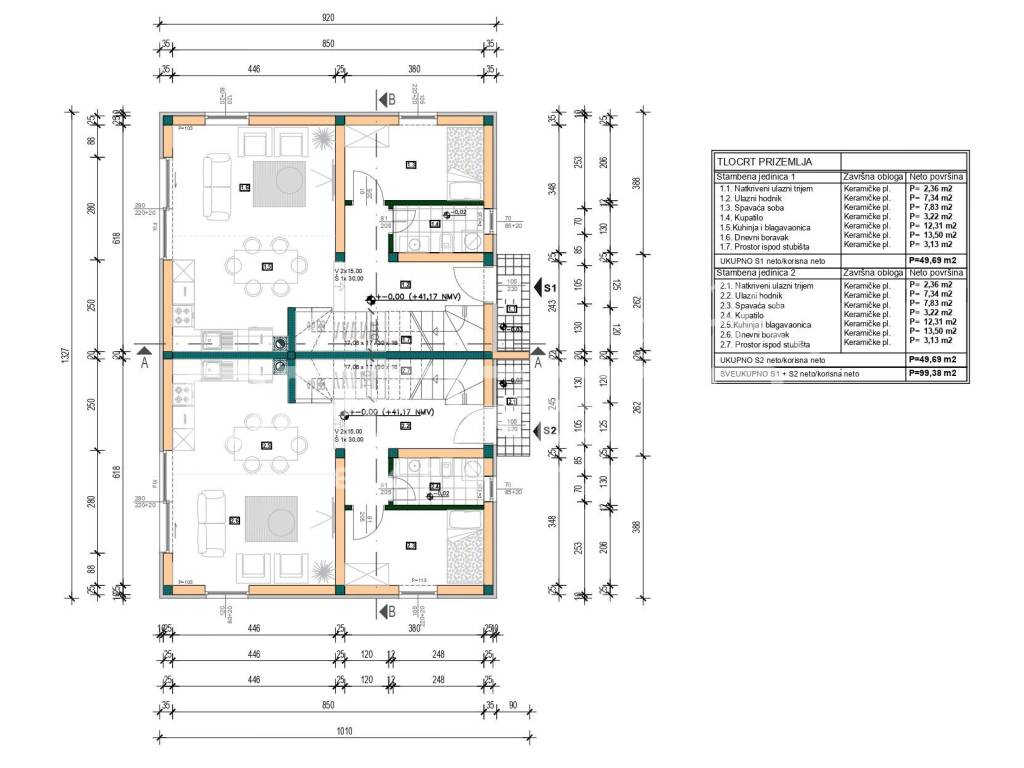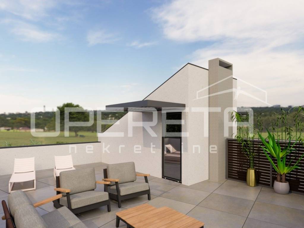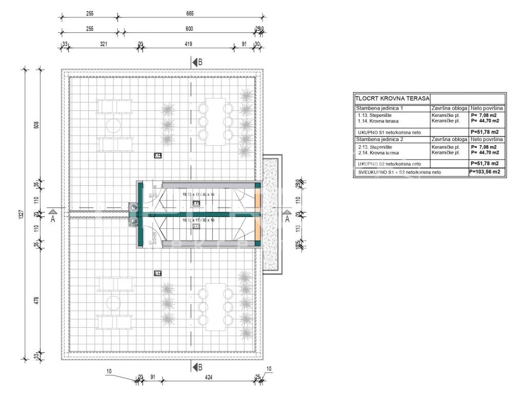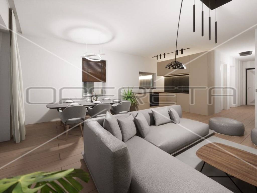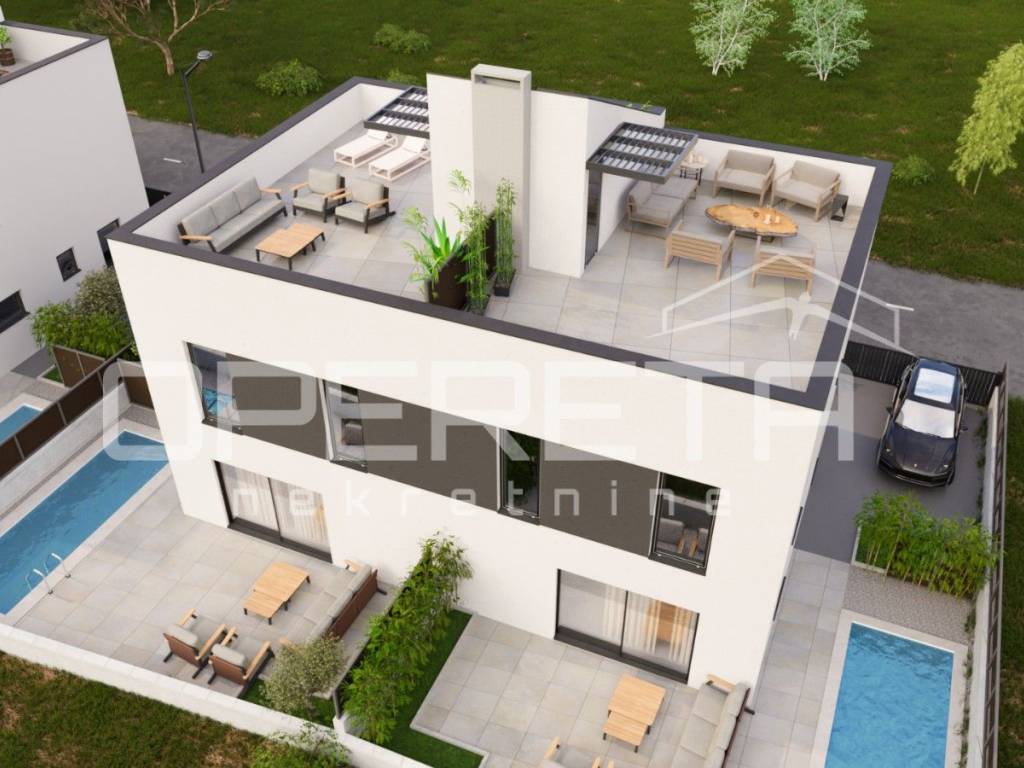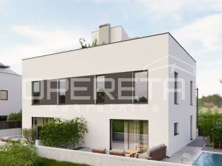 Istria, Peroj, a newly built duplex house for sale in a prime location in a quiet part of Peroj, just 1.5 km from the beaches! Two units are for sale. House (apartment) - S1 and S2, each with a net reduced area of 116 m2, of which 98 m2 is the living area. On the ground floor there is a kitchen with a dining room and a living room with access to the garden, a hallway, a small bedroom, a bathroom. On the first floor there are two bedrooms and a bathroom and a hallway with access to a roof terrace of 44 m2 from which there will be a beautiful view of the sea. Modern and simple design. 18 m2 swimming pool 90 m2 landscaped garden. Parking space. Furniture is not included in the price. Estimated start of construction - 2/2026.