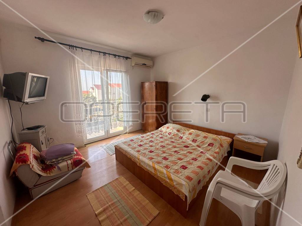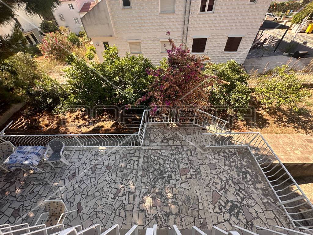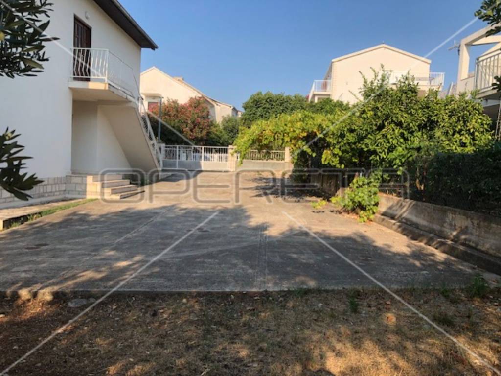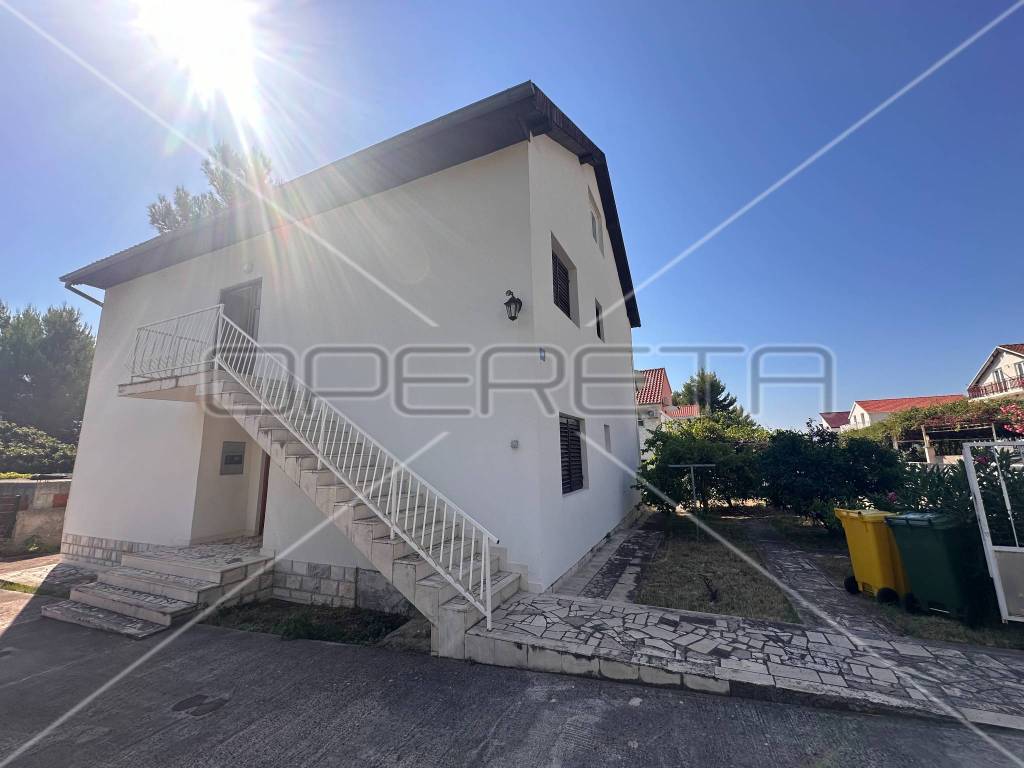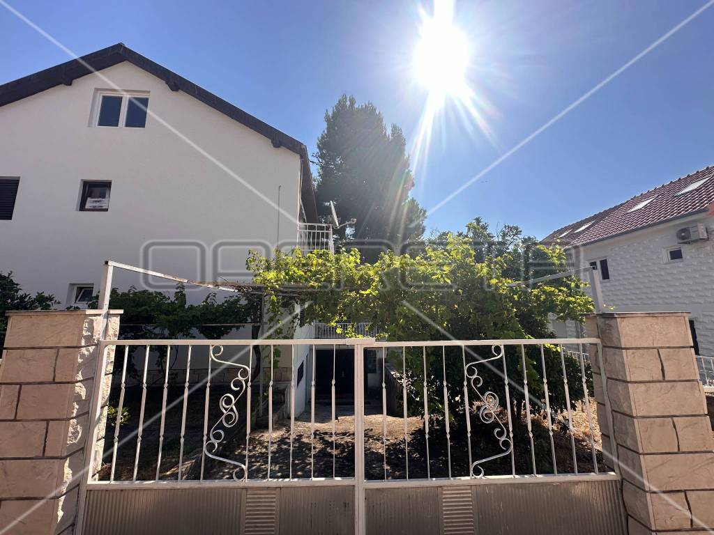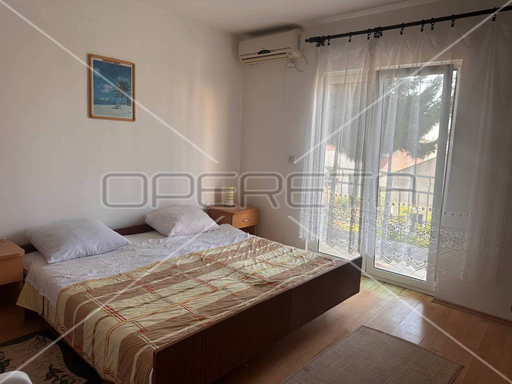 The first floor houses two separate apartments, each approximately 60 m in size, equipped with all necessary amenities for a comfortable stay - two bedrooms, air conditioning, WiFi, two bathrooms, a south-facing balcony, and a fully equipped kitchen. Each apartment has its own parking space for two vehicles, with access to the first floor provided by external stairs on the north side of the house. Internal stairs on the first floor lead to an unfinished attic where installations for water, electricity, and sewage have already been laid, with the possibility of converting it into an additional two apartments or another purpose according to the owner's needs.