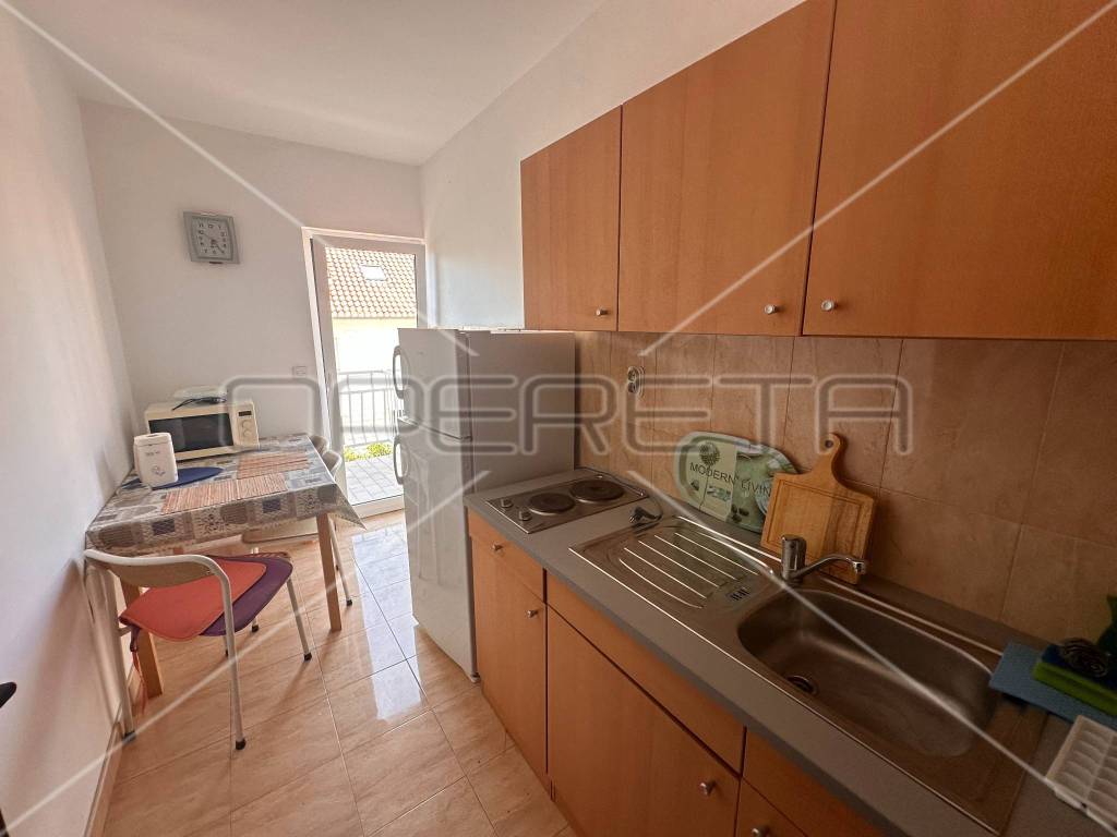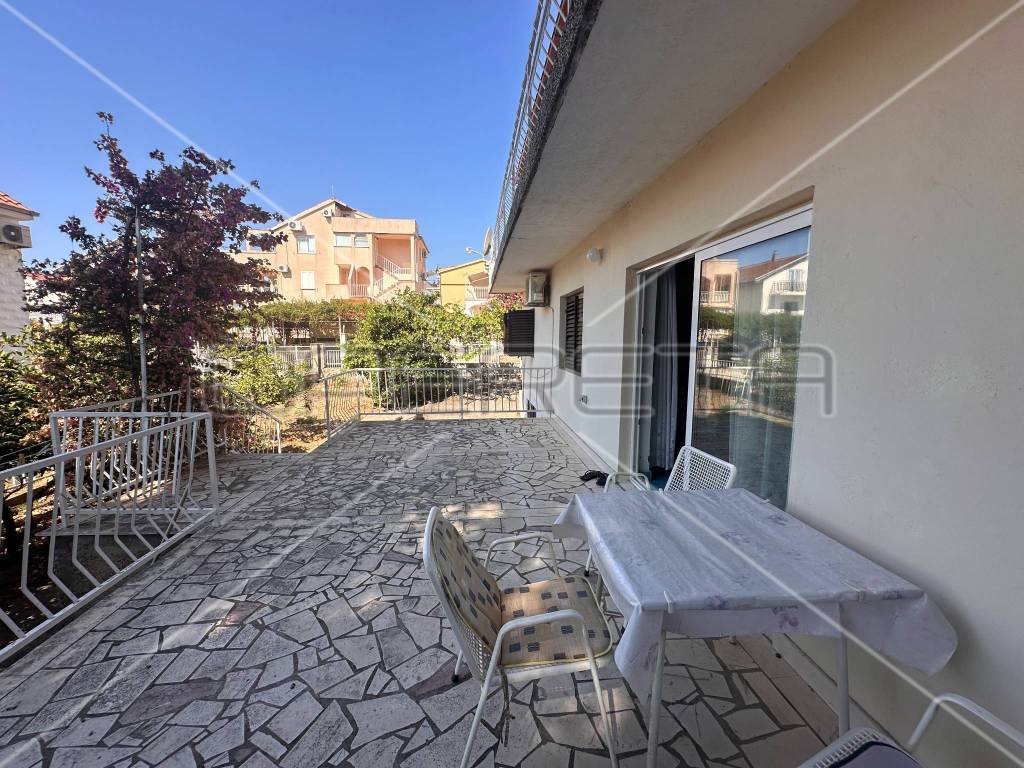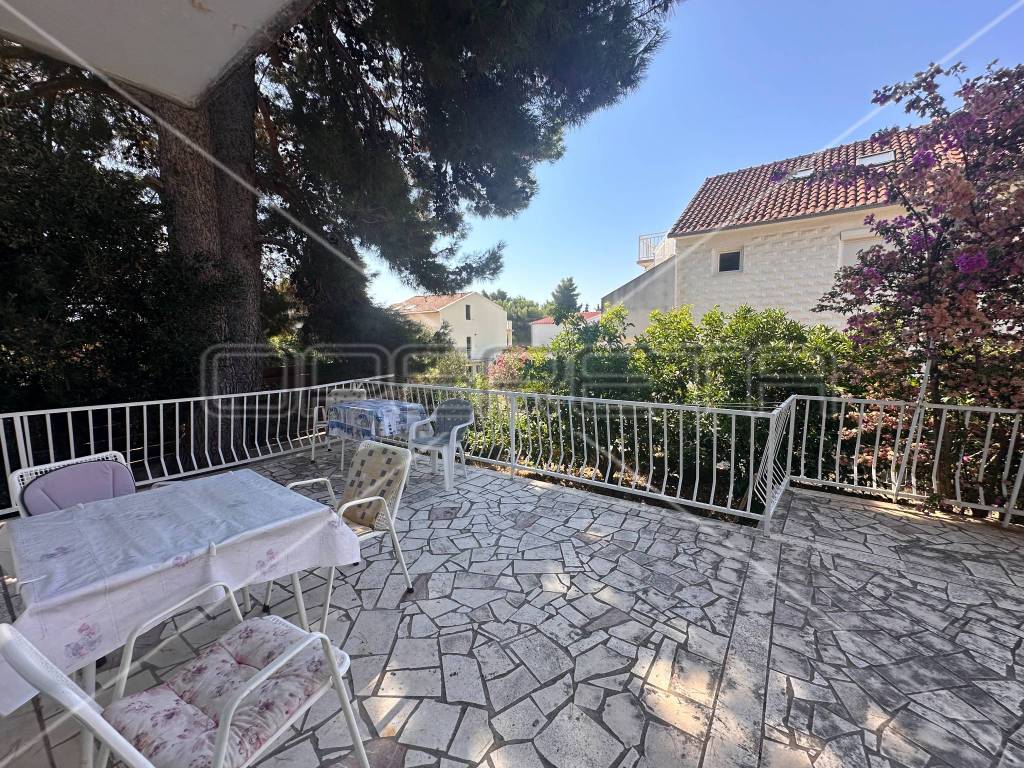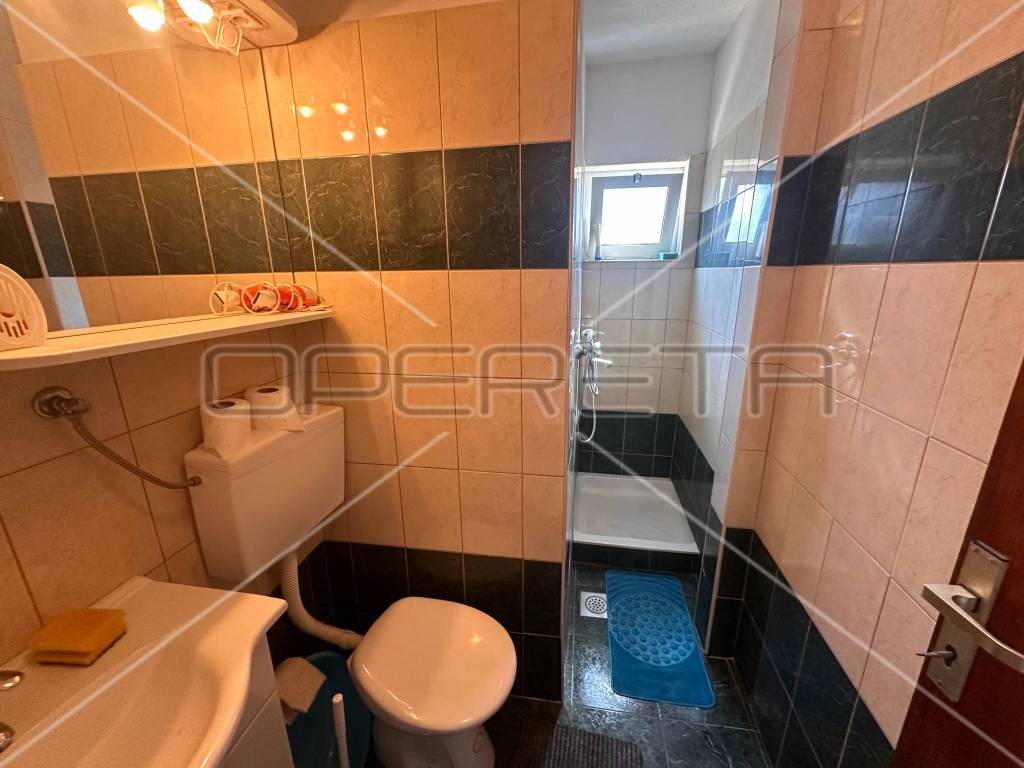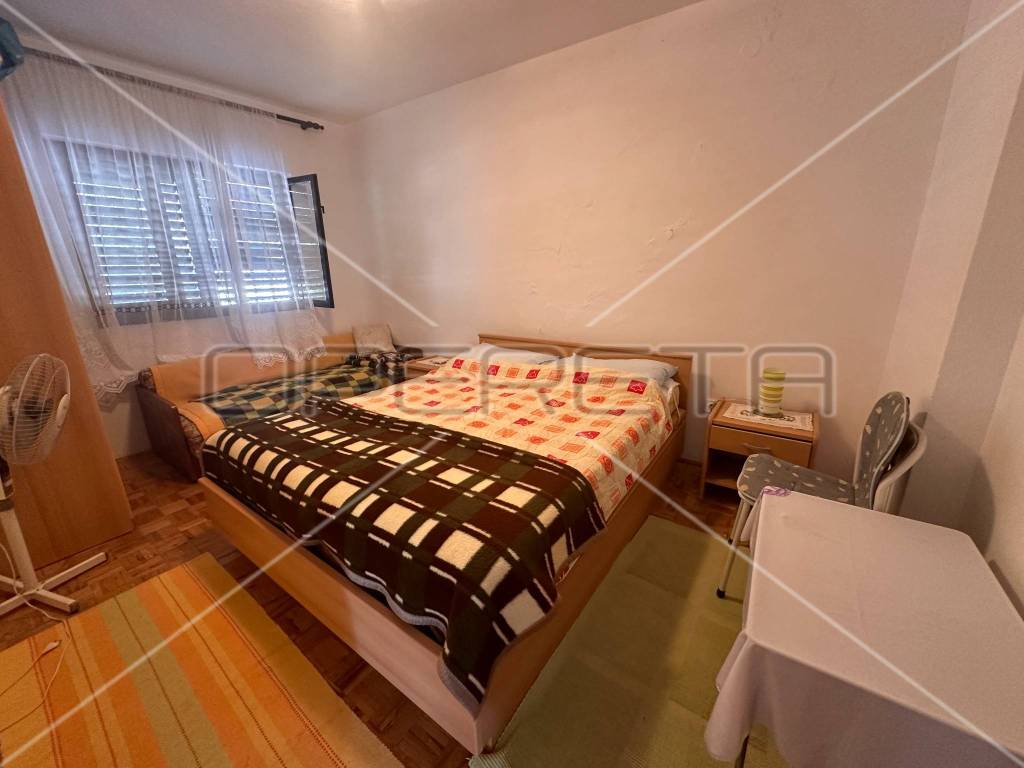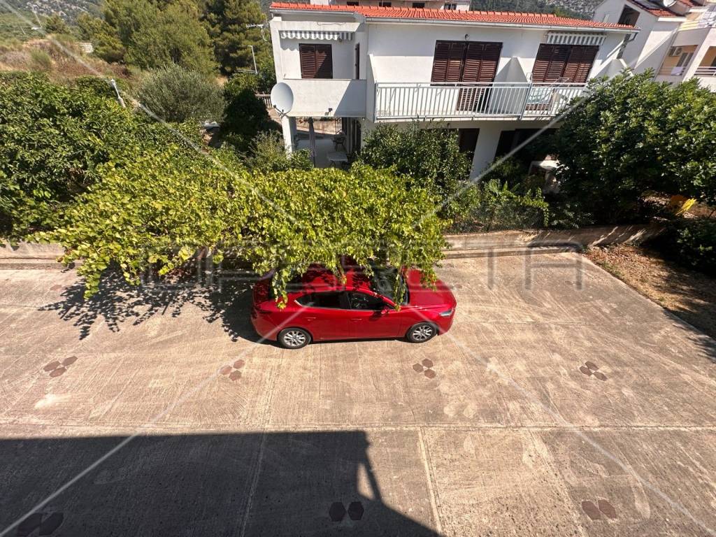 The first floor houses two separate apartments, each approximately 60 m in size, equipped with all necessary amenities for a comfortable stay - two bedrooms, air conditioning, WiFi, two bathrooms, a south-facing balcony, and a fully equipped kitchen. Each apartment has its own parking space for two vehicles, with access to the first floor provided by external stairs on the north side of the house. Internal stairs on the first floor lead to an unfinished attic where installations for water, electricity, and sewage have already been laid, with the possibility of converting it into an additional two apartments or another purpose according to the owner's needs.
