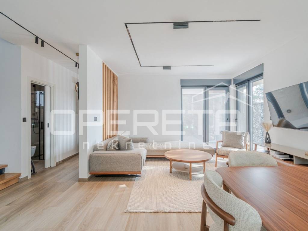 The upper floor is designed for privacy and relaxation, offering two comfortable bedrooms. Each bedroom has its own en-suite bathroom and access to a shared terrace. The house also includes a sauna, completing this private wellness area.
