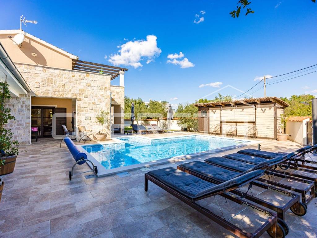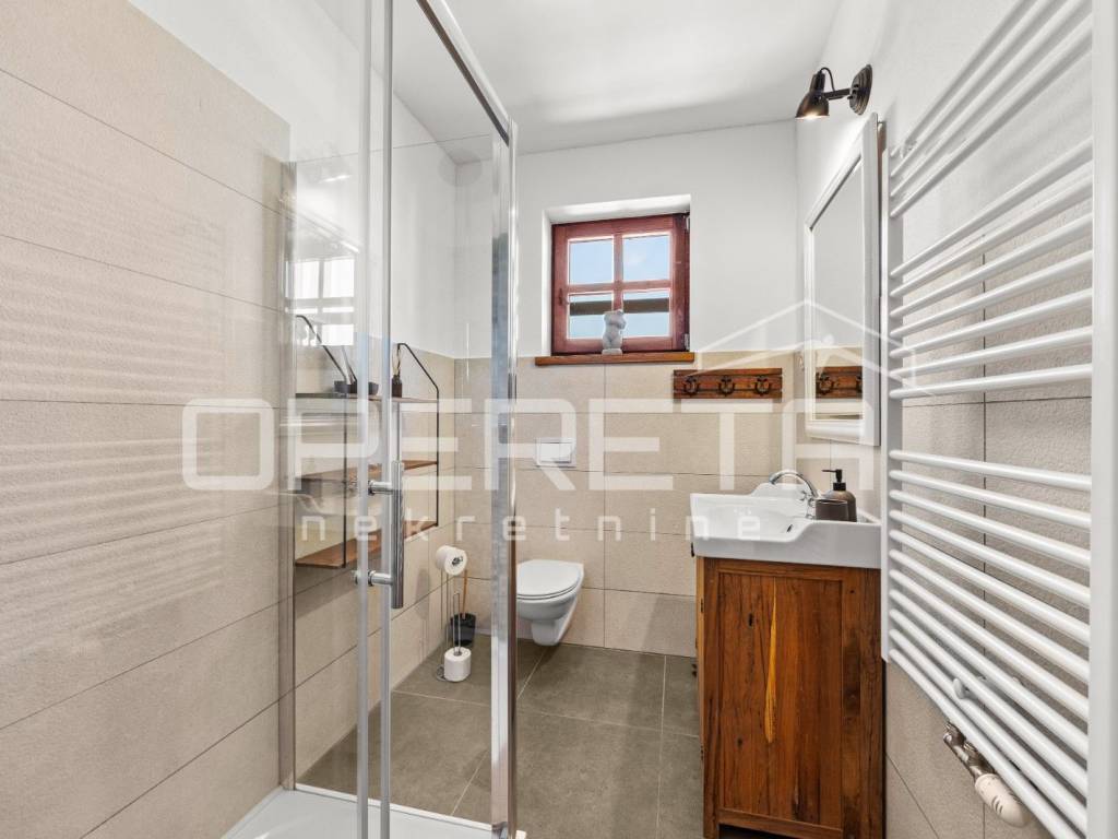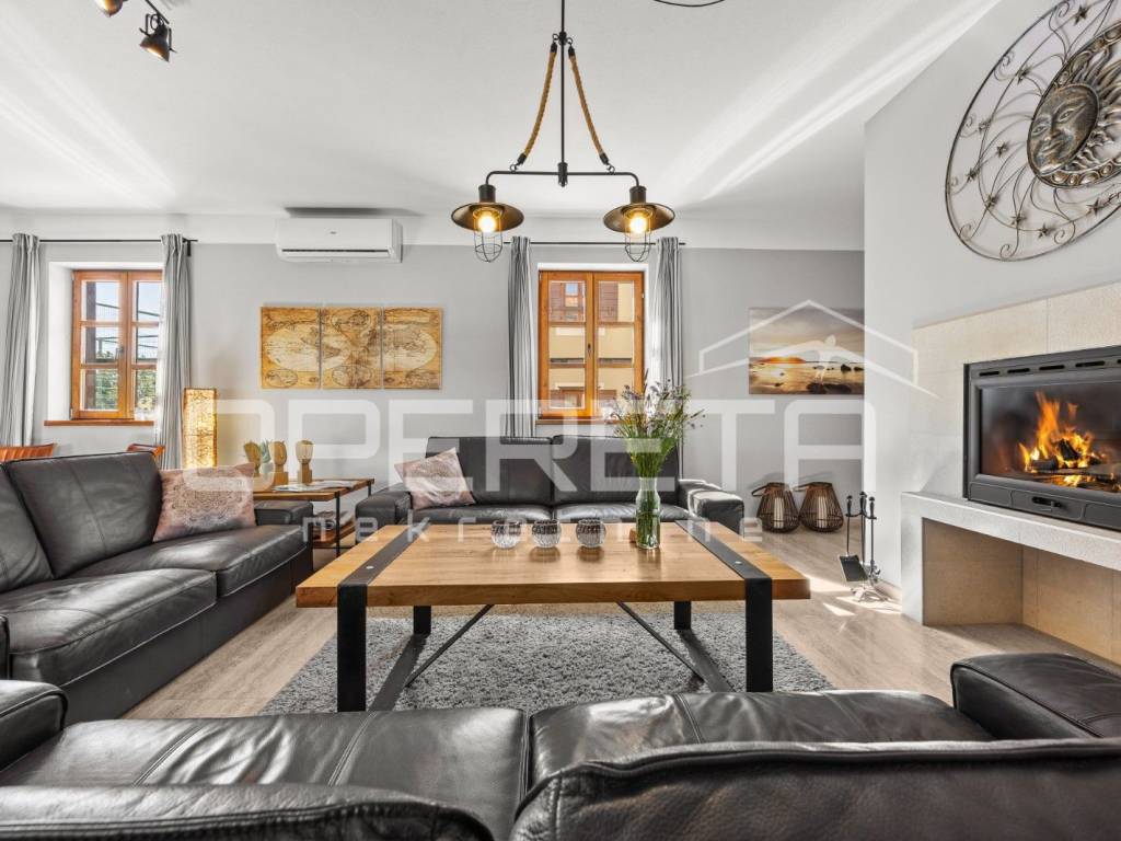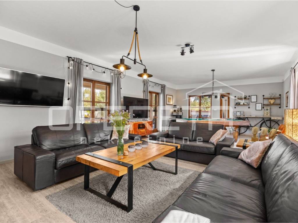 On the ground floor of the villa there is a hallway, a particularly spacious kitchen with a dining room and access to a covered terrace, a spacious living room with a fireplace for additional comfort in winter days, also from the living room there is access to the terrace and the swimming pool sundeck, a bedroom with its own bathroom, and a storage room where the house heating system is located on the principle of a central wood-burning stove that heats the entire house. The first phase of underfloor heating is installed on the first floor.