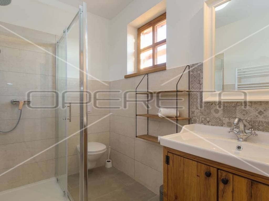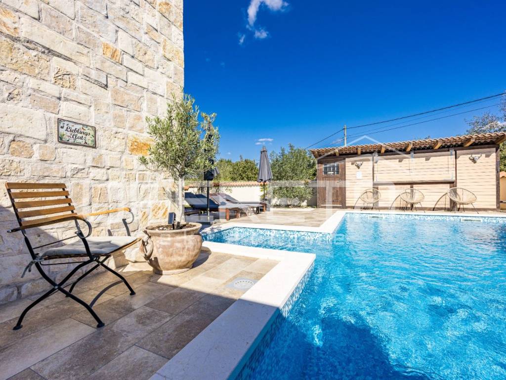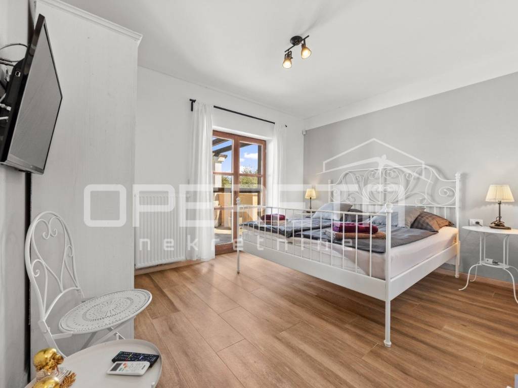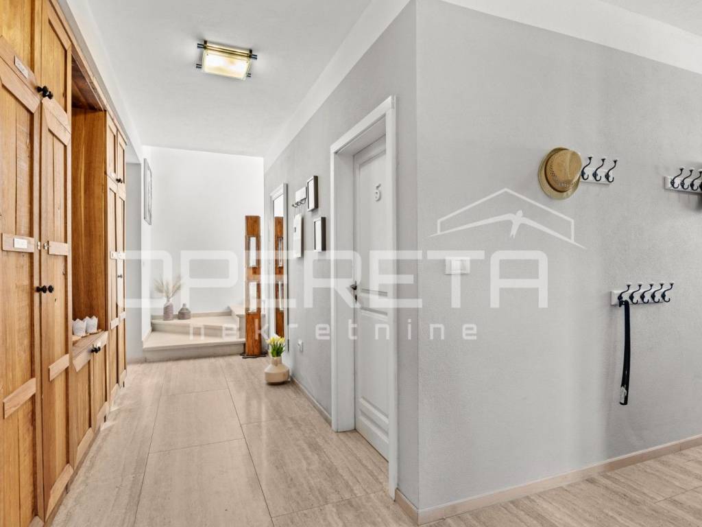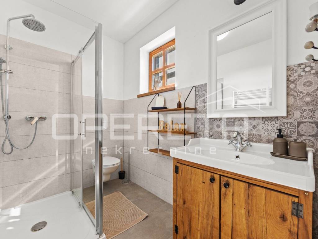 On the ground floor of the villa there is a hallway, a particularly spacious kitchen with a dining room and access to a covered terrace, a spacious living room with a fireplace for additional comfort in winter days, also from the living room there is access to the terrace and the swimming pool sundeck, a bedroom with its own bathroom, and a storage room where the house heating system is located on the principle of a central wood-burning stove that heats the entire house. The first phase of underfloor heating is installed on the first floor.