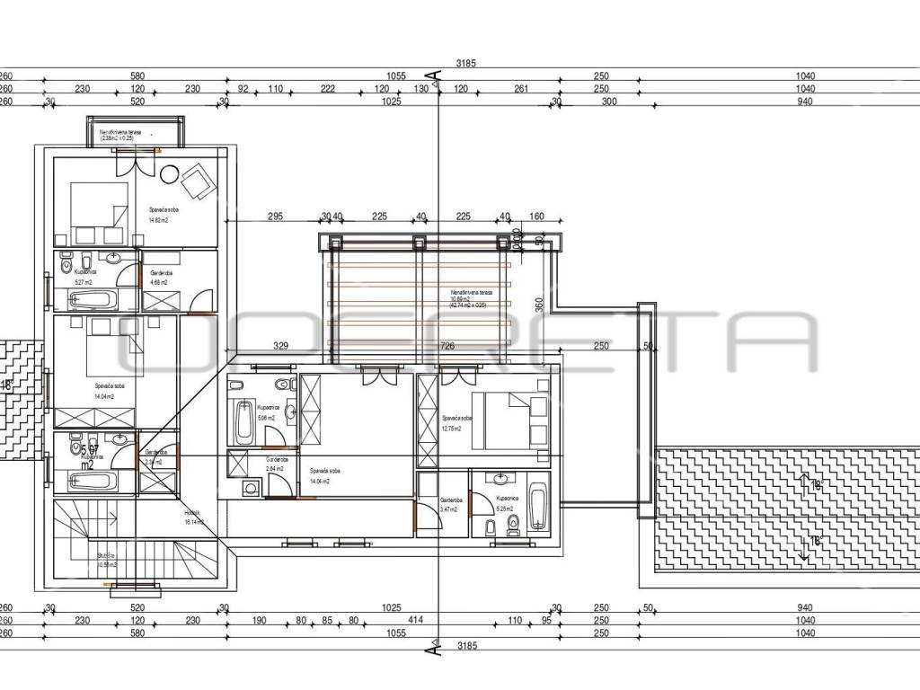 There are four bedrooms on the first floor. Each room has a dressing room and its own bathroom. Three rooms have access to a terrace with a panoramic view of nature.