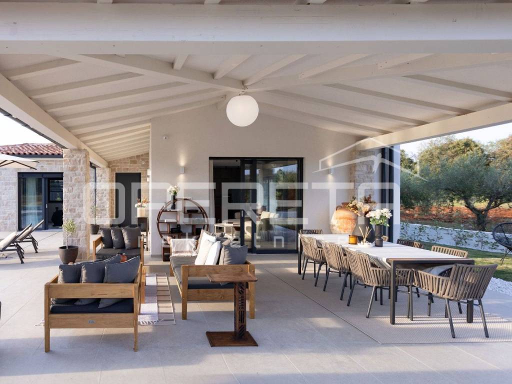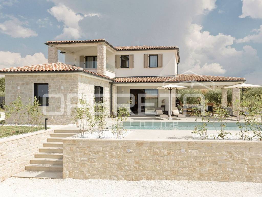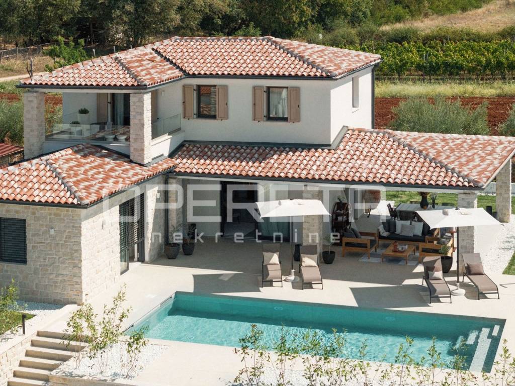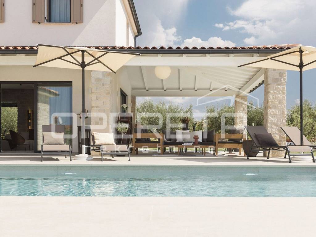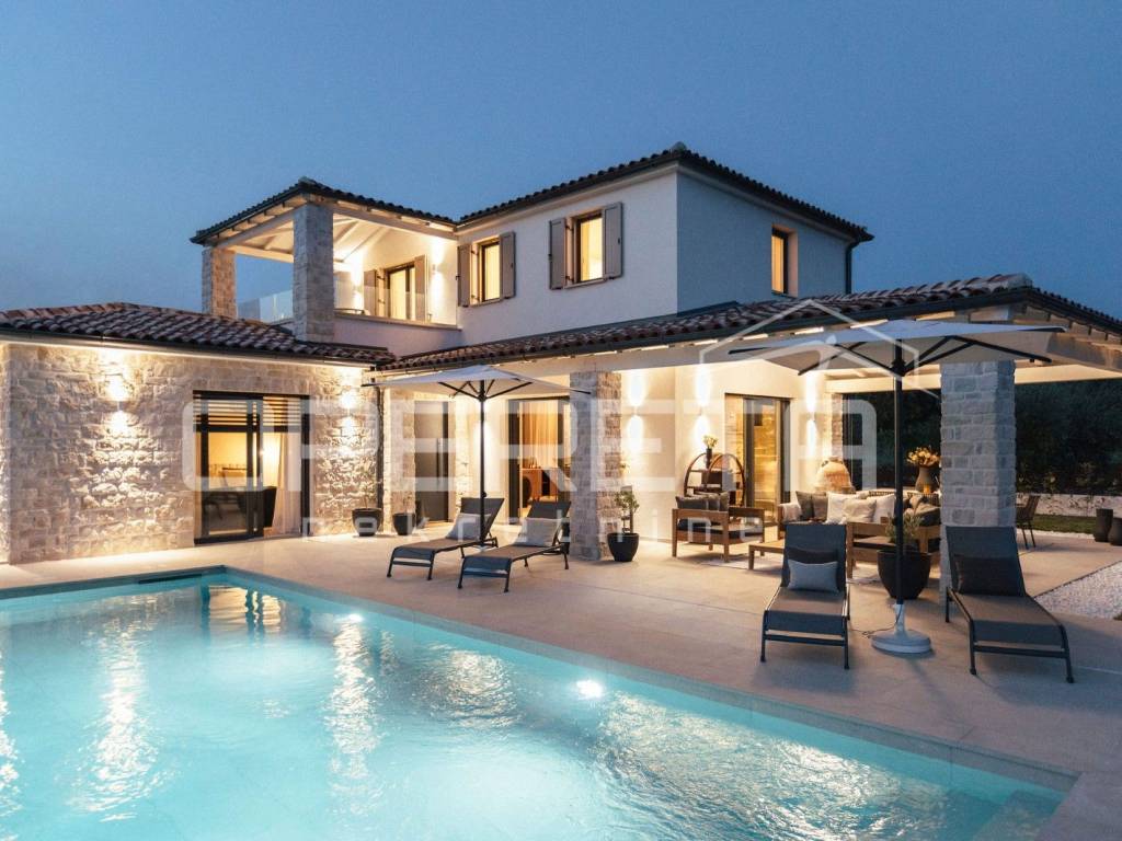 We offer a luxurious newly built house with a total area of 145 m, located in a quiet location just 2 km from the sea and in the immediate vicinity of Poreč. The house is spread over two floors and is located on a plot of 400 m, which includes a spacious yard with a heated swimming pool, a sunbathing area and a covered terrace, ideal for enjoying the outdoors.