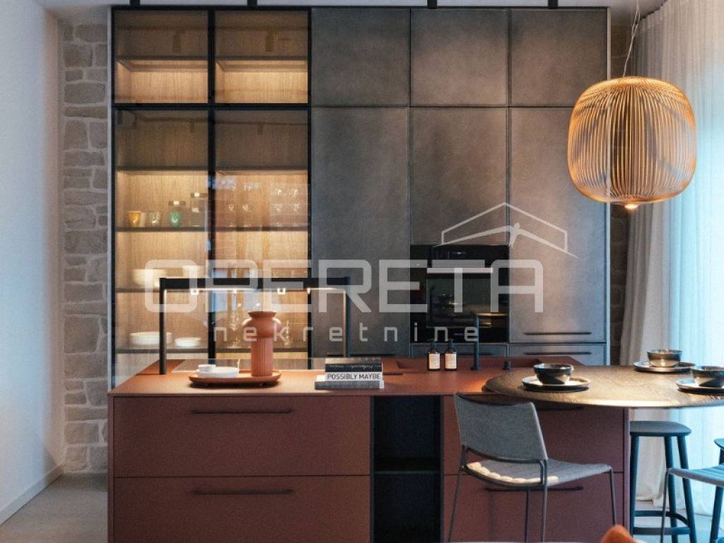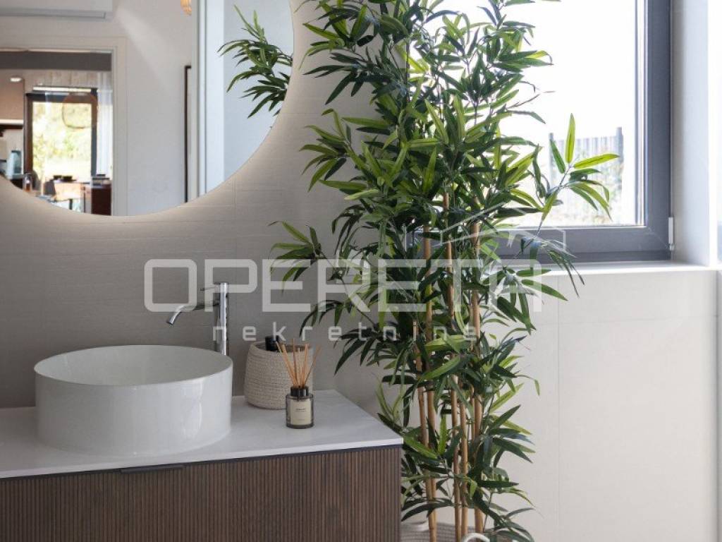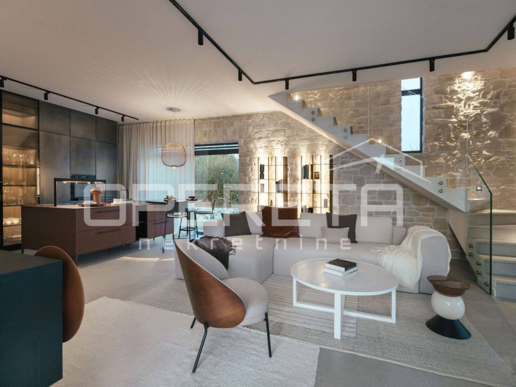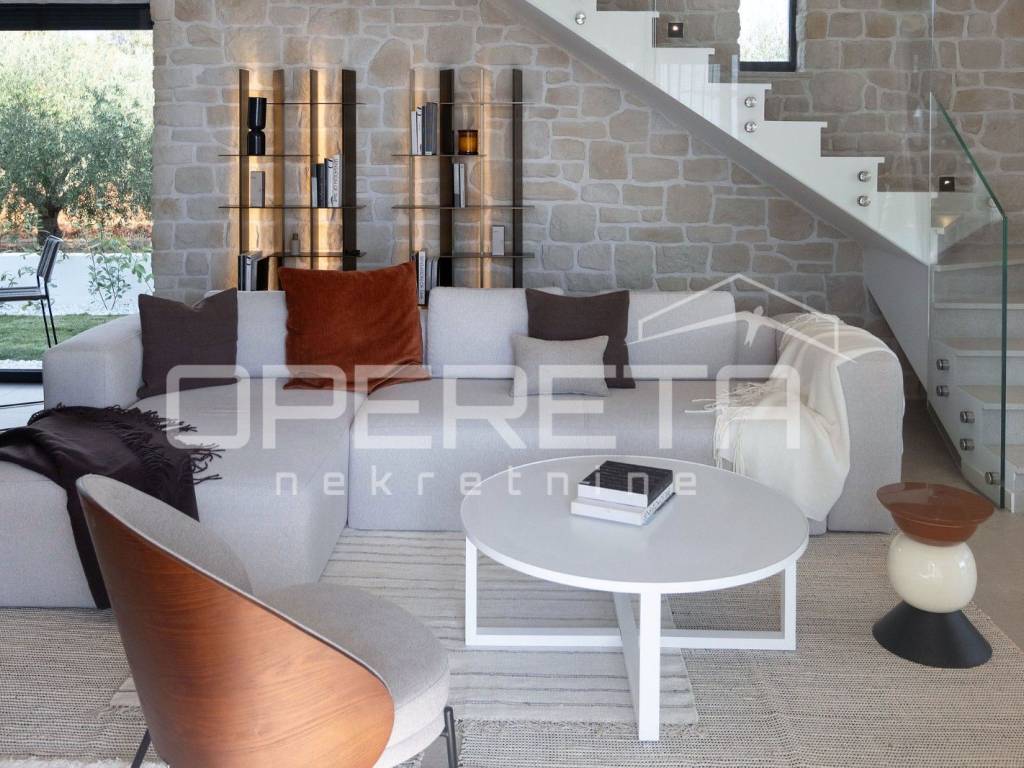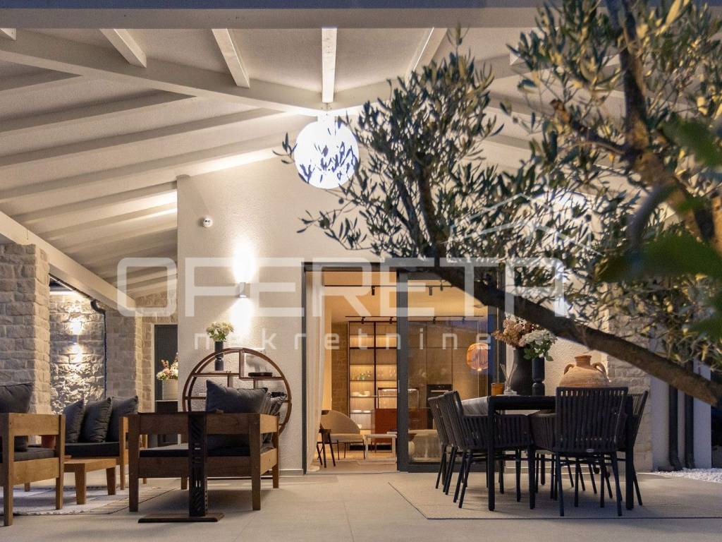 Inside the house there is a large living room with access to a covered terrace, which allows for uninterrupted enjoyment of the outdoor space. The house is elegantly decorated and carefully furnished with high-quality furniture, which emphasizes the sophistication of the interior. There are three bedrooms and three modern bathrooms, while underfloor heating ensures maximum comfort throughout the year.