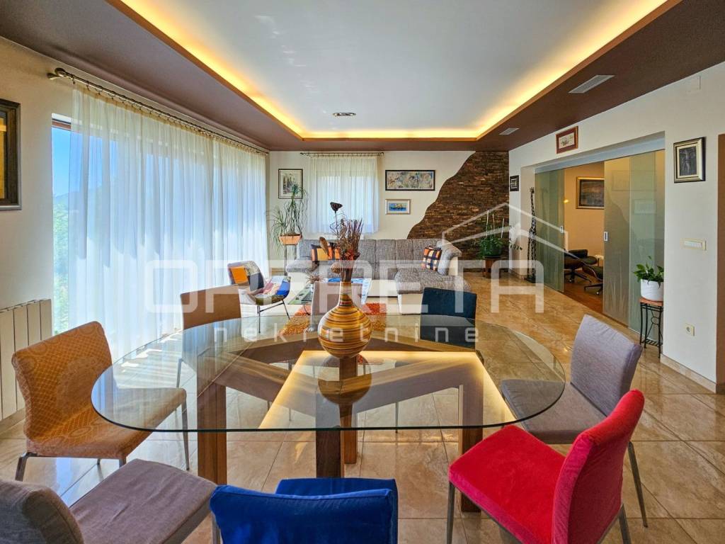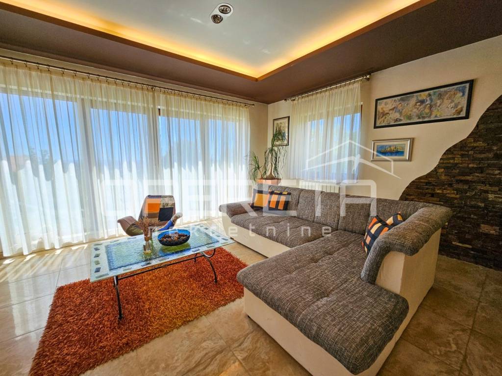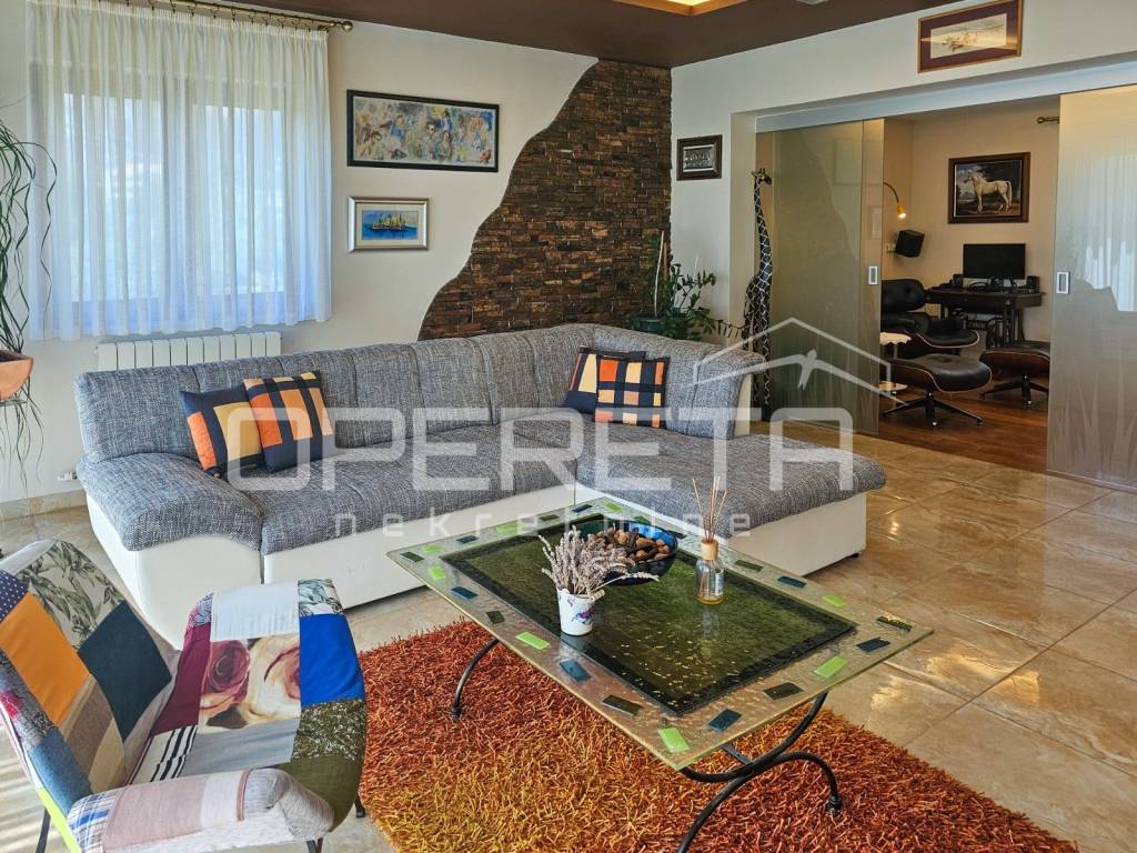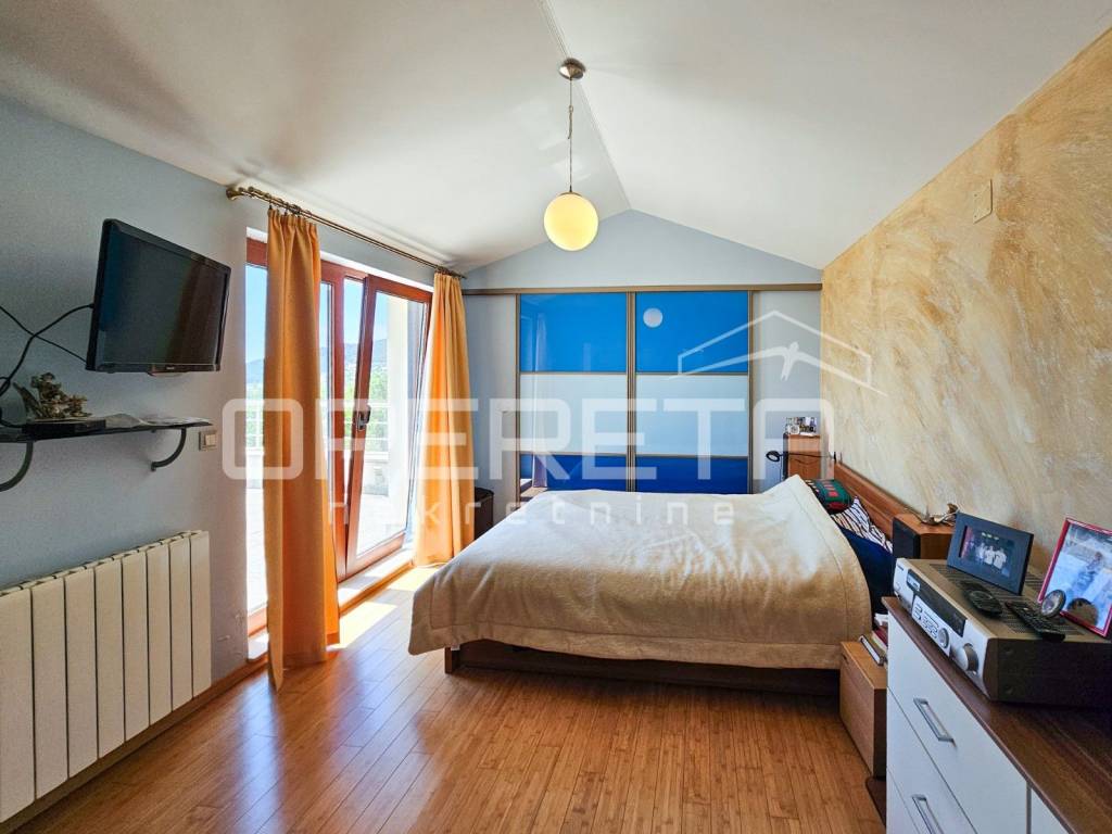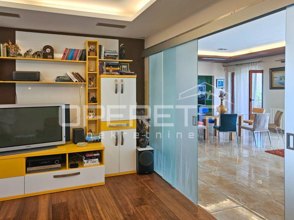 Next to the living room is a TV lounge with a floor made of American cherry wood, crafted by the renowned Croatian company Požgaj giving the space a luxurious and cozy touch.