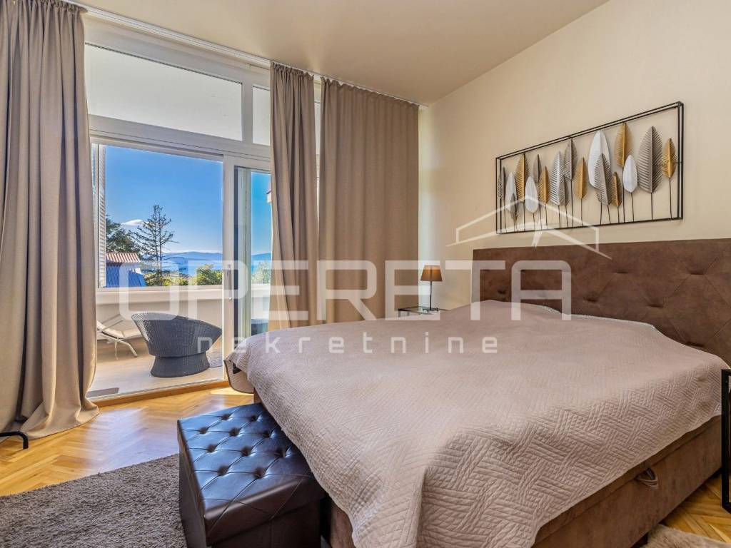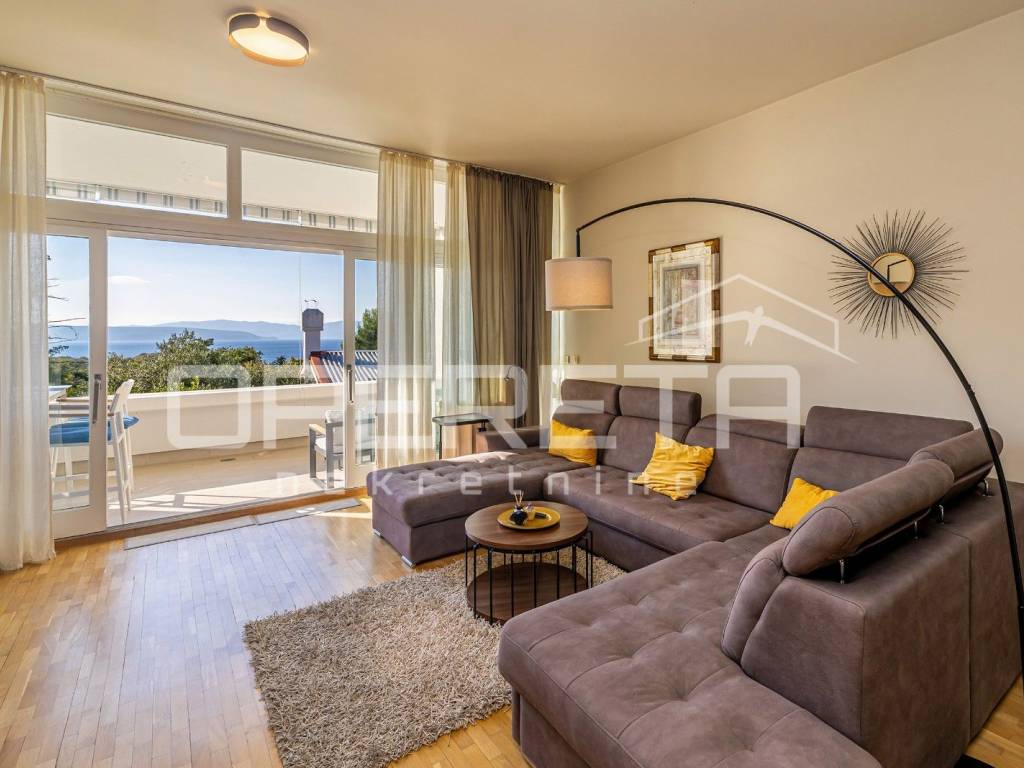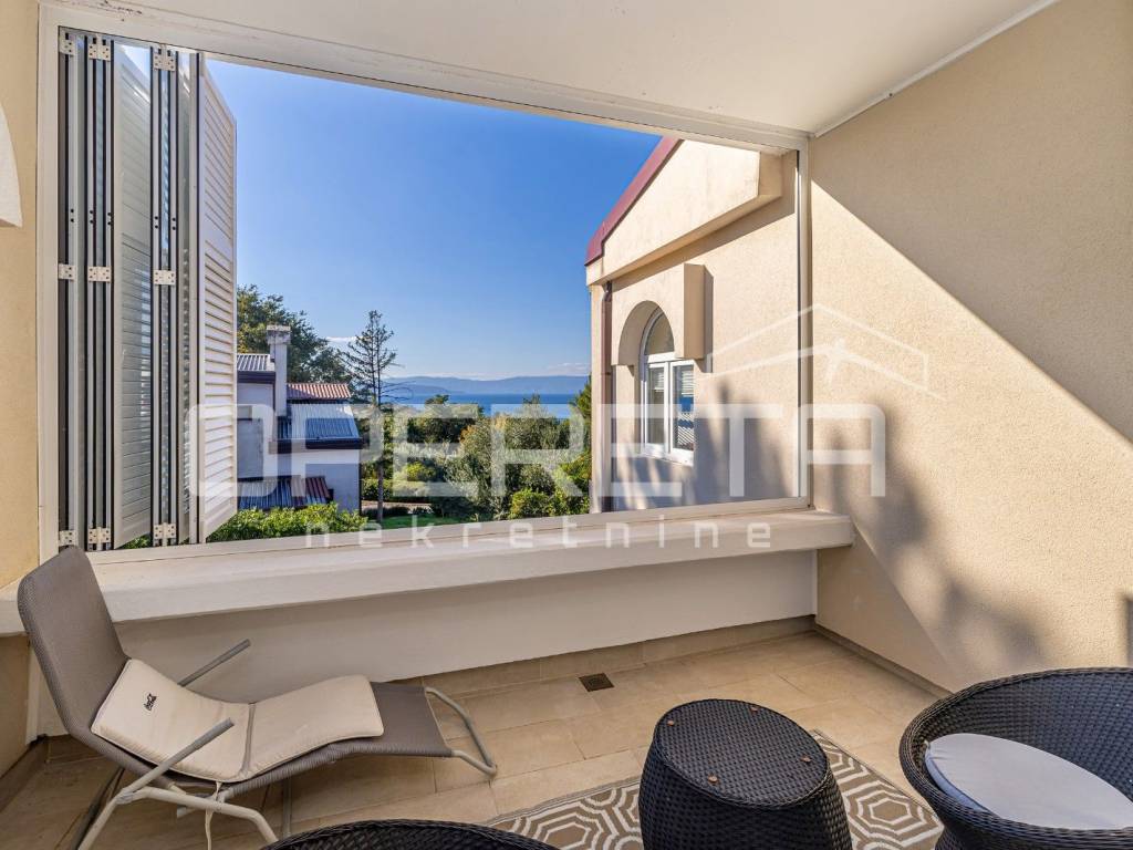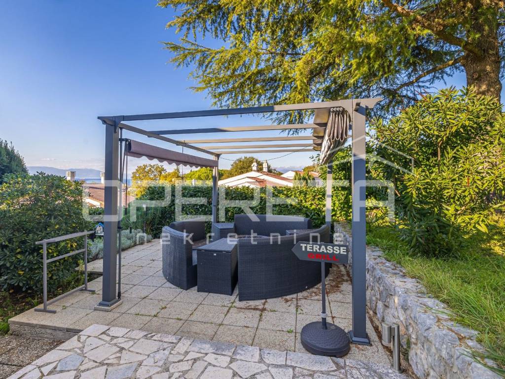 Designed by a renowned architect, the house blends harmoniously with its Mediterranean surroundings. An open view of the Kvarner Bay extends from almost every room. The functional layout includes a spacious living room with a fireplace and dining area, a fully equipped kitchen, an additional auxiliary kitchen, three bedrooms, two bathrooms, a separate guest toilet, a storage room and a large garage.