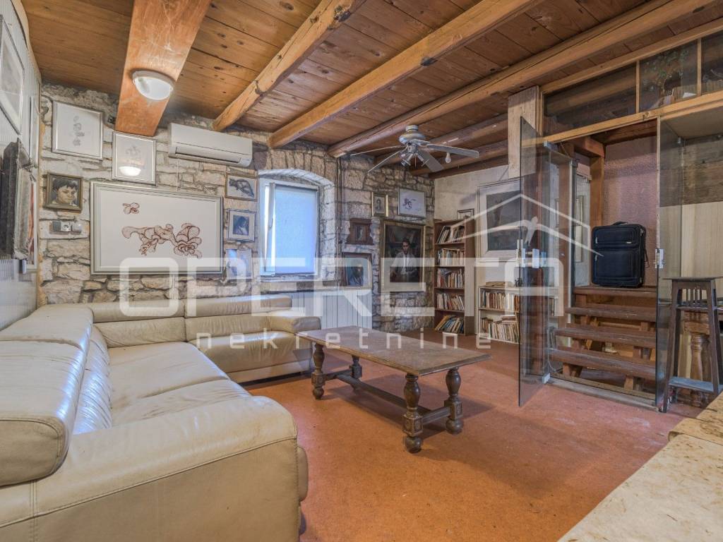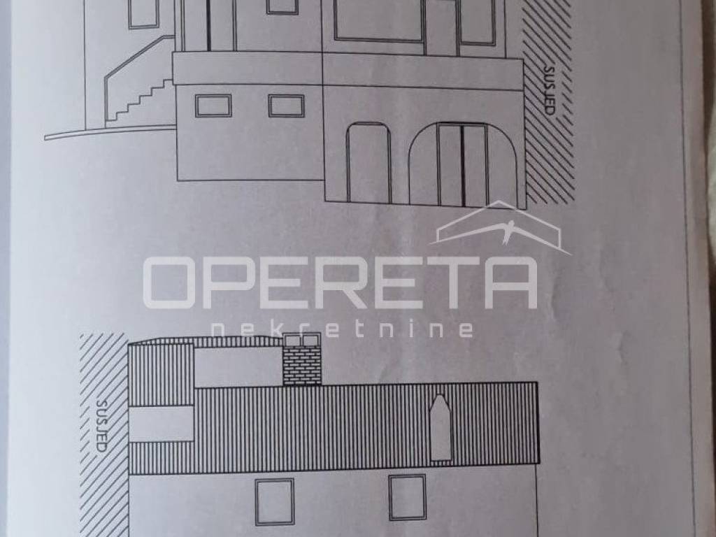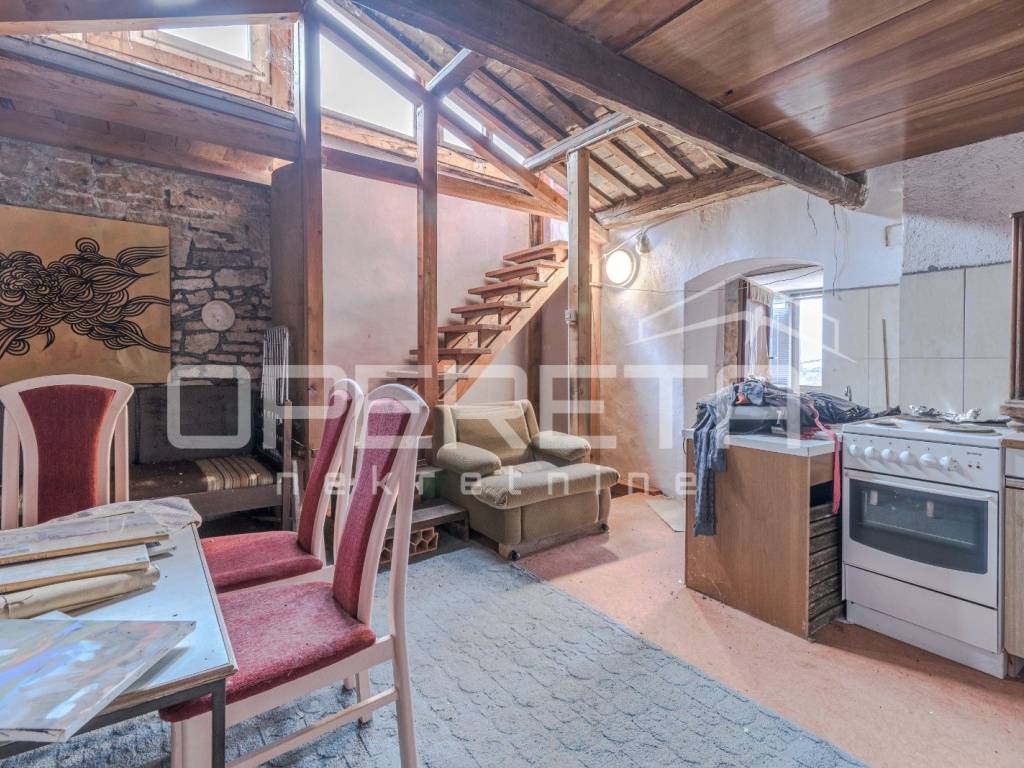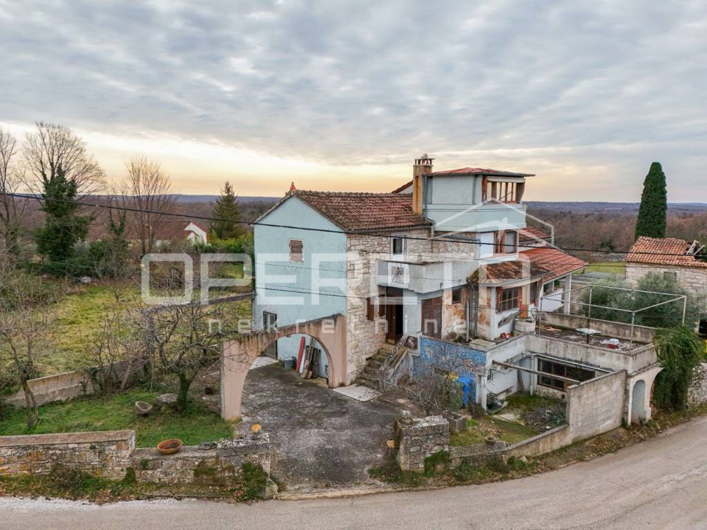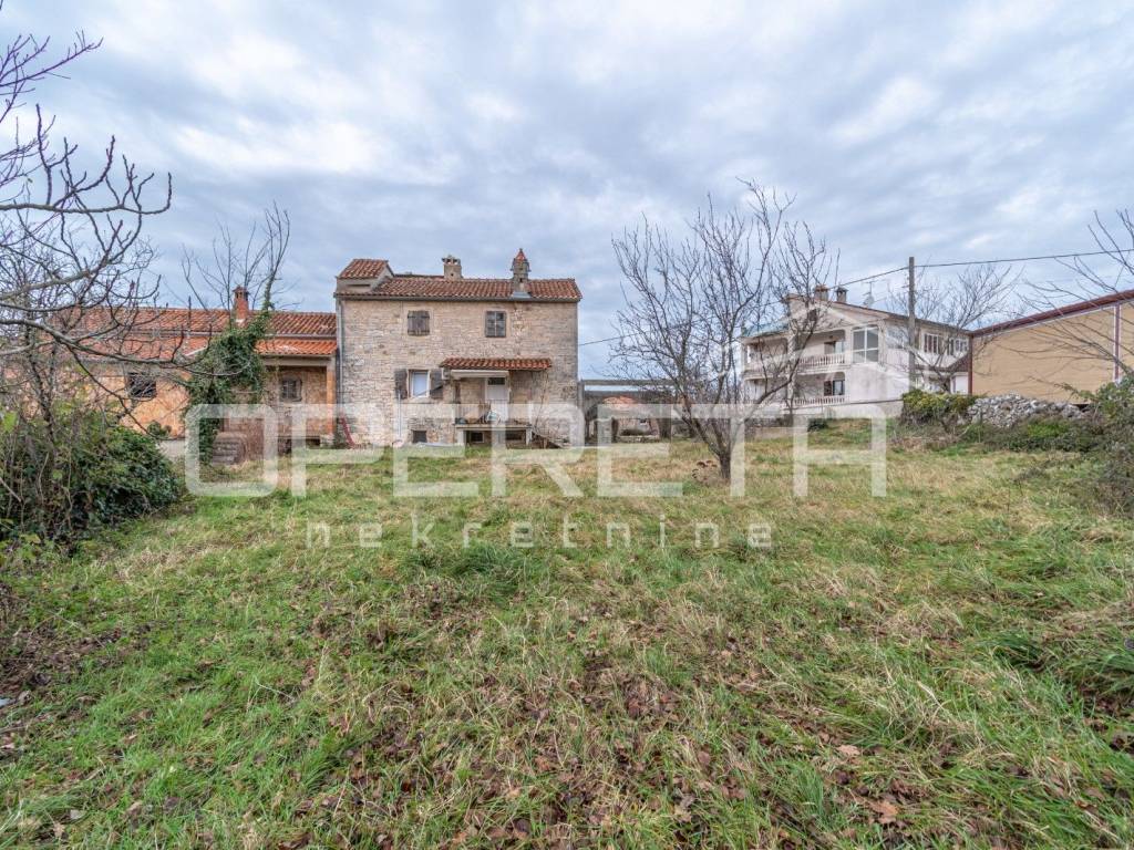 A semi-detached house for sale in Višnjan, arranged over three floors, ideal as an investment project requiring complete renovation. The property offers approximately 300 m of living space and a garden of around 800 m, with the possibility of creating a swimming pool, outdoor kitchen, and parking area.