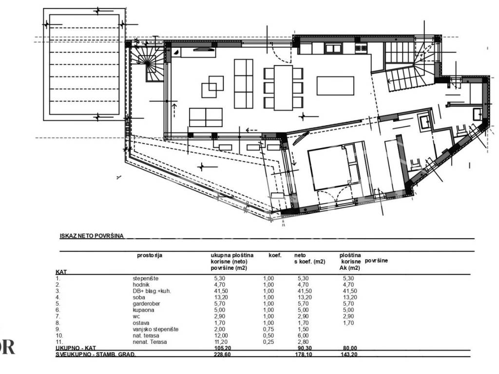 The floors are connected by an internal and external staircase, which allows for flexible communication and the possibility of separate use of the space.