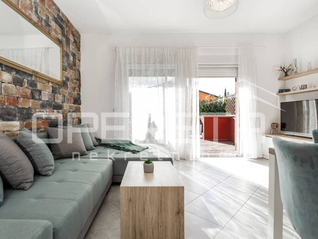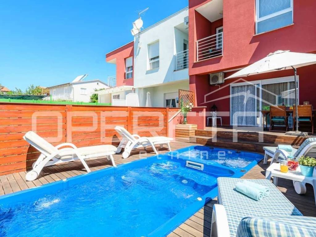 For sale is a modern house of 91.44 m spread over two floors. The ground floor features an open-plan living room, kitchen, and dining area, along with a guest WC. It opens onto a covered terrace with a glass wall leading to a beautifully landscaped garden with a swimming pool, jacuzzi, and sundeck. The upper floor houses two bedrooms, one of which has a terrace overlooking the garden. The property also includes two parking spaces.