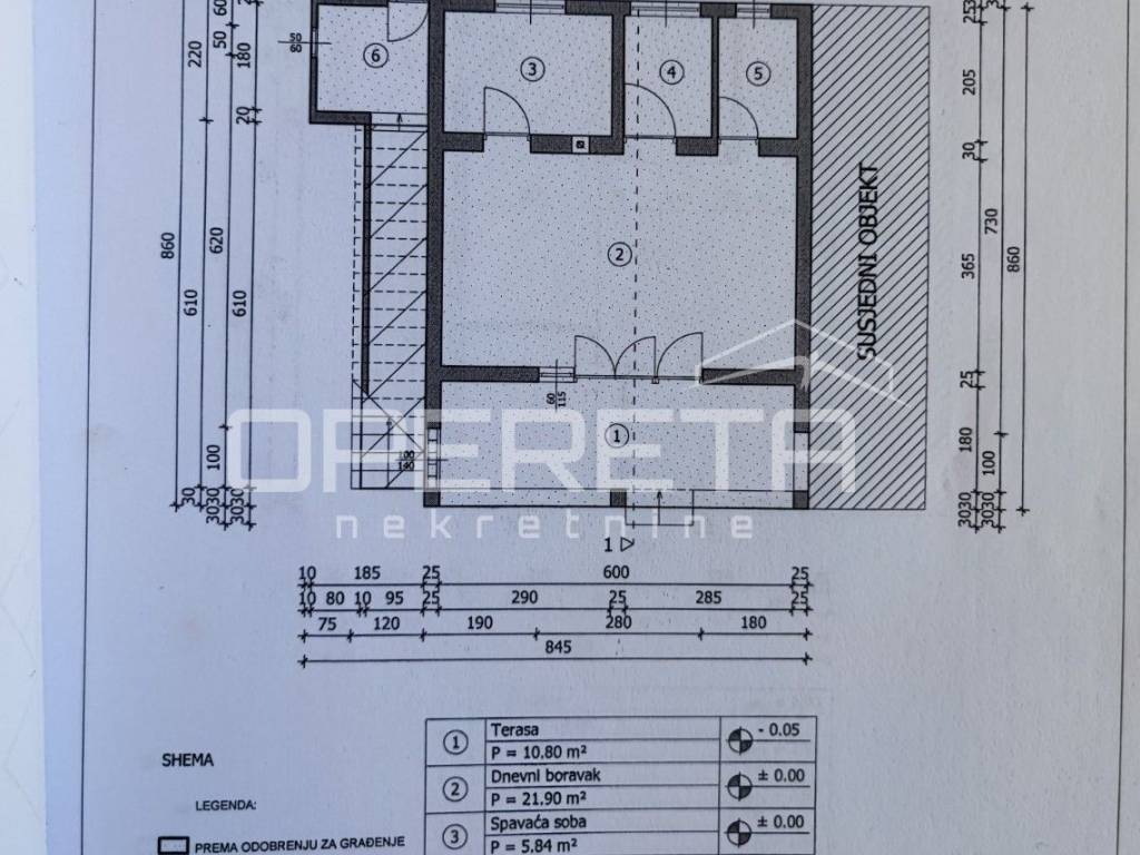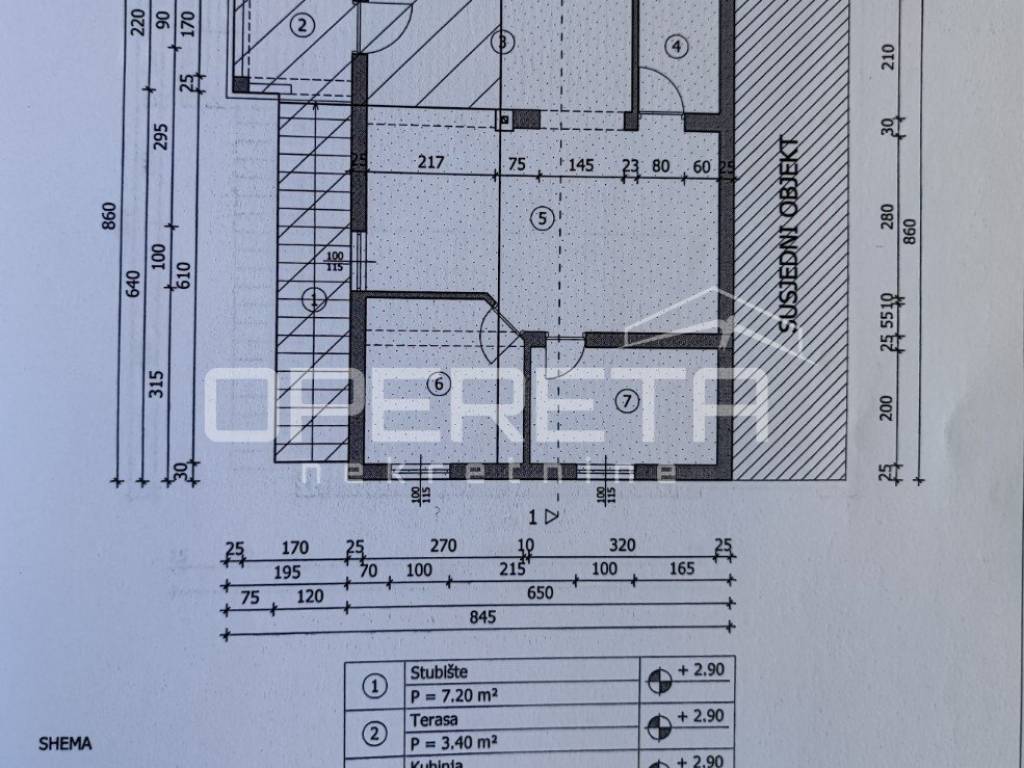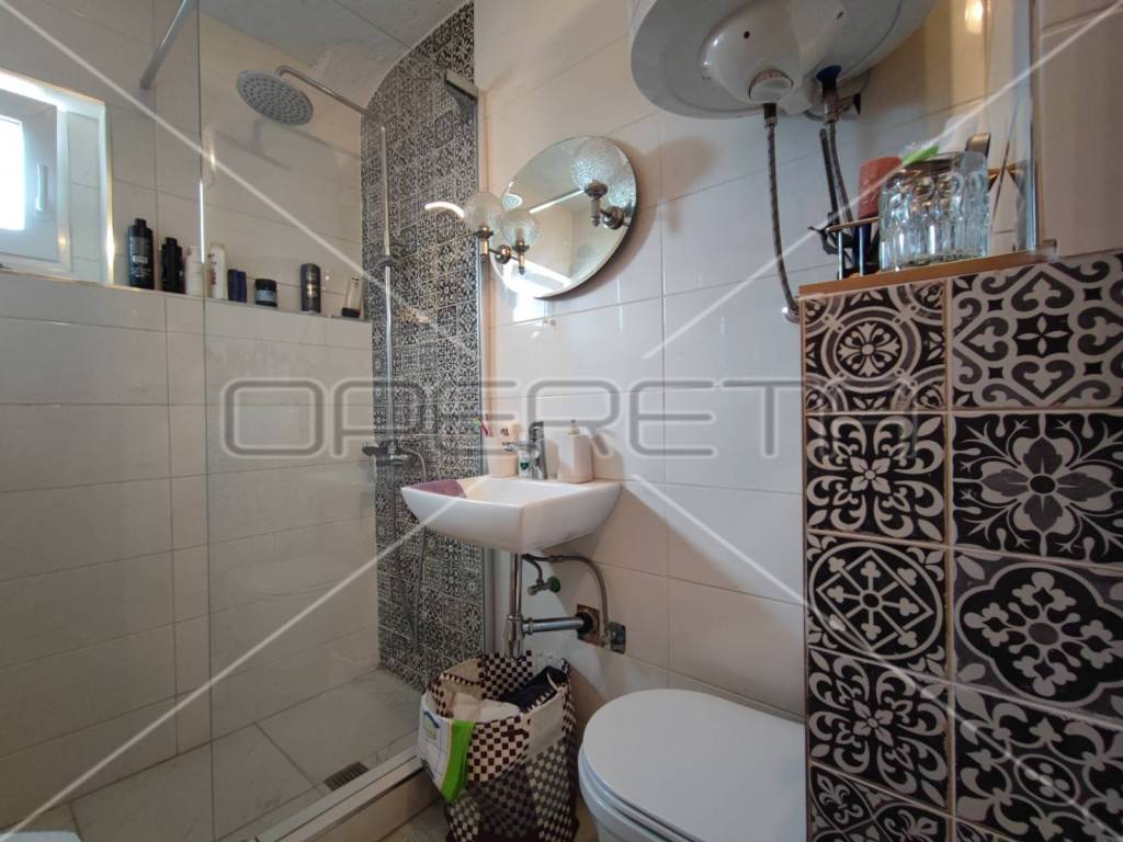 An external staircase leads to the second floor, where there is a two-room apartment with a net area of 47 m2, with a covered terrace of 3.40 m2 (net 1.7 m2) in front of the entrance. The apartment consists of a kitchen, a living room with a dining room, and two bedrooms, which can be converted into one larger bedroom according to needs. From the top floor there is a view of the sea.