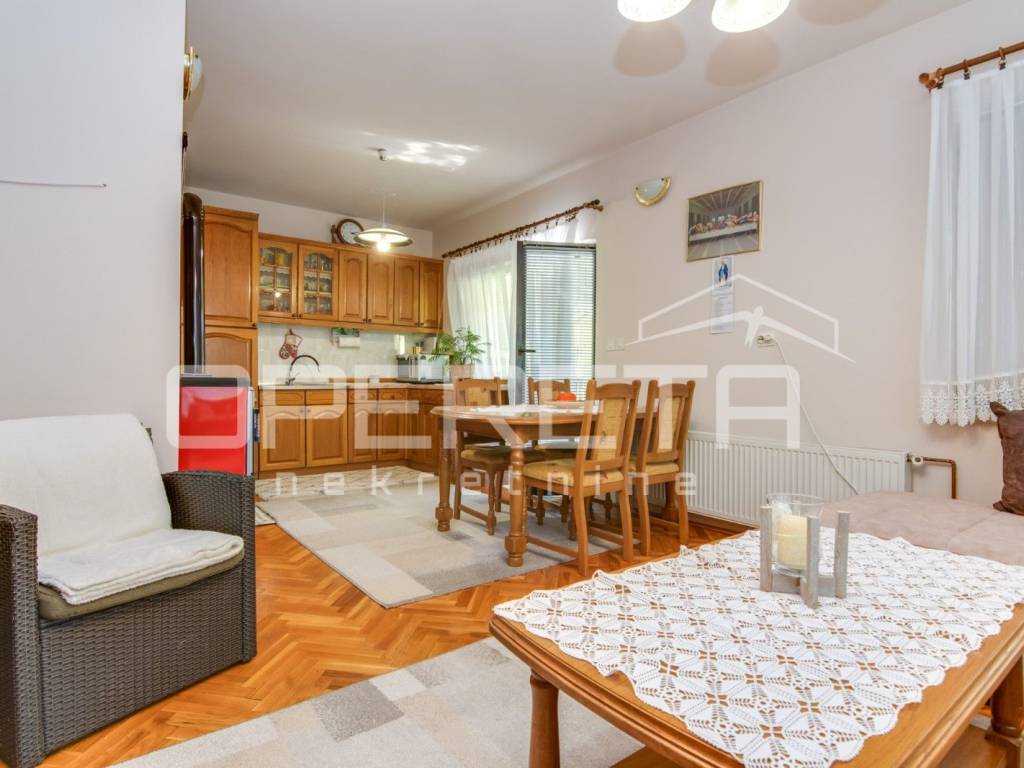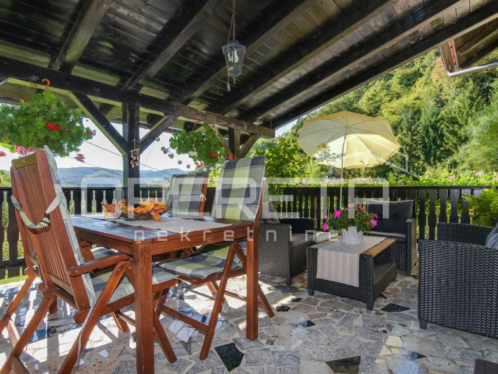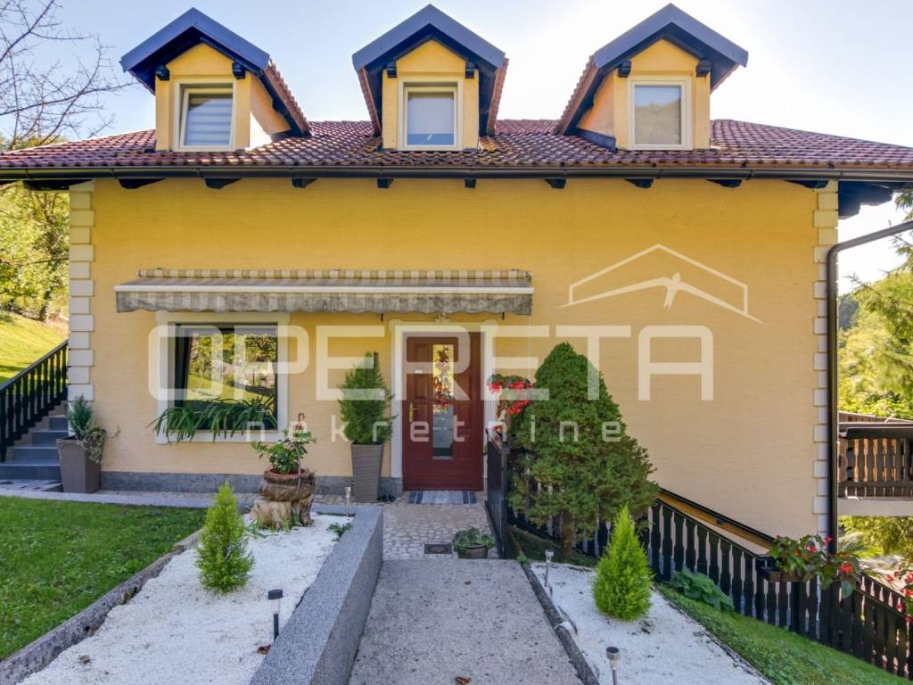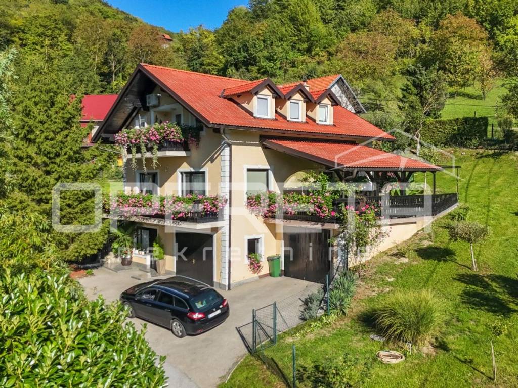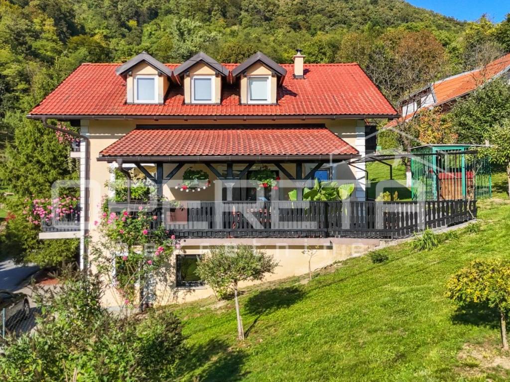 Samostojeća kvalitetno građena i opremljena katnica stambene površine od 180 m2 na blago uzvišenoj i ograđenoj parceli od 946 m2 u mirnoj ulici, odmaknutoj od glavne ceste i centra Klanjca svega 3 minute vožnje. Podijeljena u dvije zasebne samostalne funkcionalne jedinice. Orjentirana na sve 4 strane svijeta, sastoji se od suterenskog dijela ( u kojem su dvije garaže i spremište ), kata i potkrovlja. Na katu se nalazi prostran "open space" dnevni boravak s blagovaonicom i kuhinjom te izlazom na prostranu terasu s pogledom na zelenilo, 2 spavaće/radne sobe, kupaonica s wc-om i ulazni hodnik. Vanjsko natkriveno stubište povezuje ga s potkrovljem gdje se nalazi "open space" dnevni boravak s kuhinjom i blagovaonicom te izlazom na balkon, 2 spavaće sobe, tehnička prostorija, kupaonica i hodnik. Kuća je obnovljena tj. rekonstruirana 2015. g. kada je napravljena terasa, te obnovljen krov i fasada. U dvorištu uredno održavana hortikultura. Lijep položaj na uzvišenom terenu s pogledom na zelenilo, u blizini svih sadržaja potrebnih za kvalitetan život. Do centra Klanjca i svih potrebnih sadržaja 3 minute, do Zagreba 40 minuta vožnje. Preporuka!