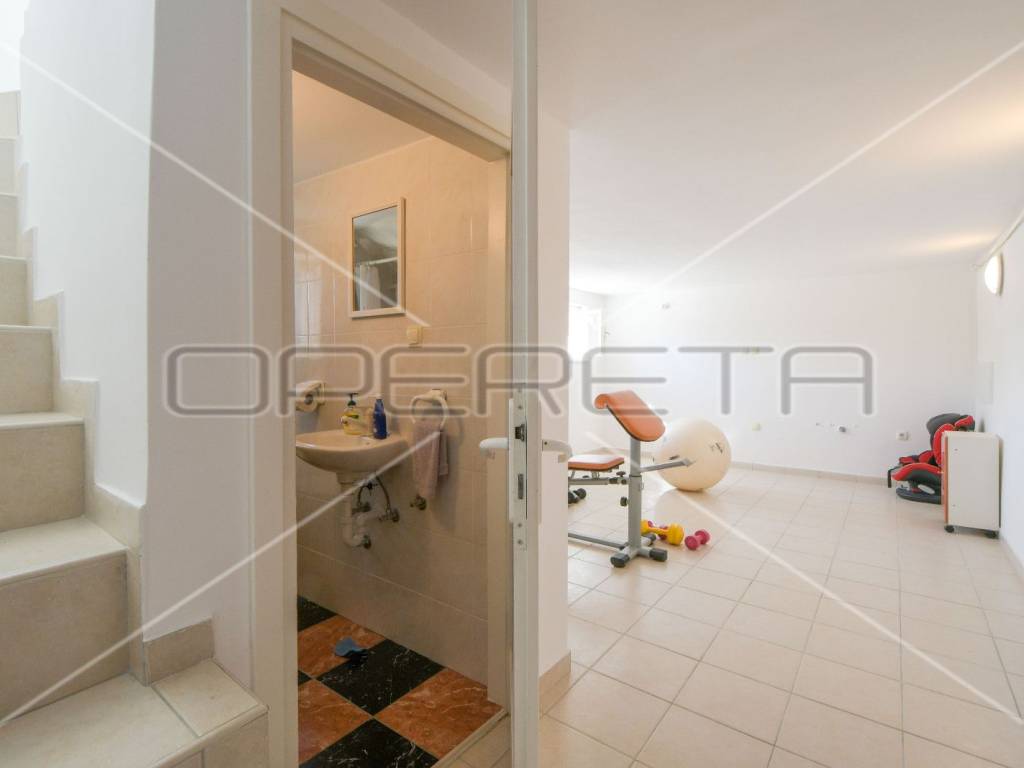 Idealnog tlocrta. Zbog dva odvojena ulaza i jednostavne opcije odvajanja idealno u slučaju potrebe korištena dijela kuće za potrebe poslovnog, a ostatak kuće za stambeno. Klimatizirano, puno ugradbenih ormara, jacuzzi, namješten, potpuno opremljena kuhinja, alarm, kamere, pvc, električna ulazna ograda, električna garažna vrata Orijentacija zapad istok jug, visine stropa 260 cm.