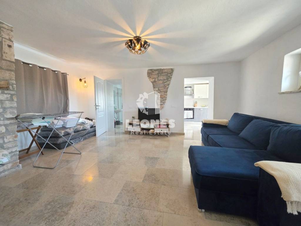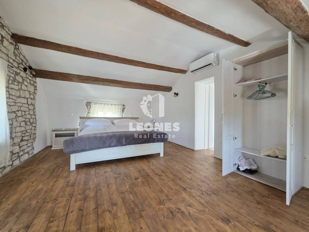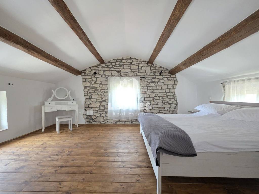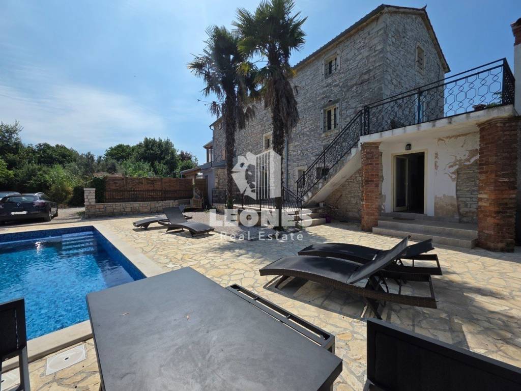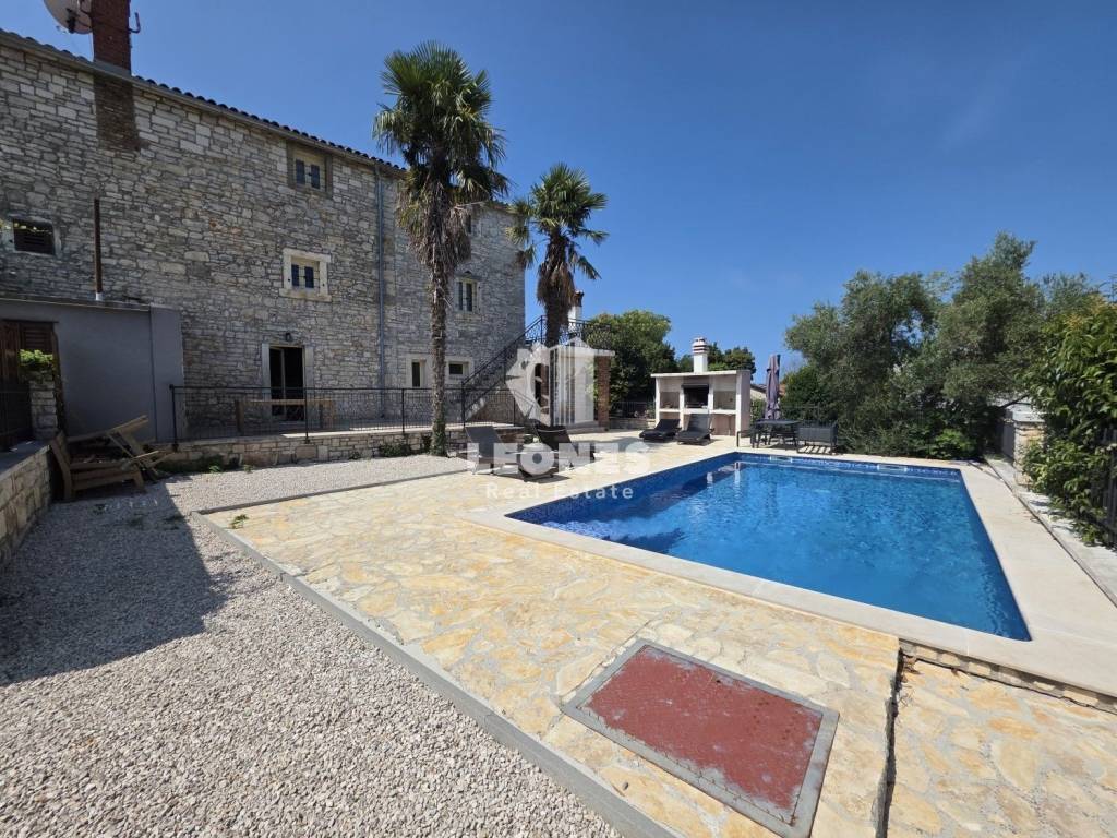 A stone house with a swimming pool and a view of the sea is for sale in Tar. The surface of the house is 180 m2. On the ground floor there is a kitchen with a dining room, a living room with access to the terrace and a bathroom. Stone stairs lead to the first floor where there are two bedrooms, one of which has a spacious terrace with a view of the sea and a bathroom. There are two more bedrooms and a bathroom on the second floor. Heating is by air conditioning unit and fireplace.