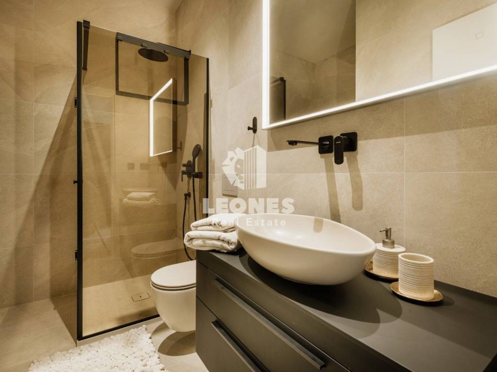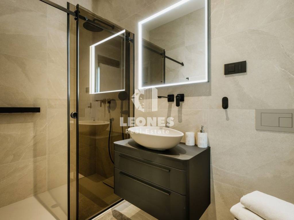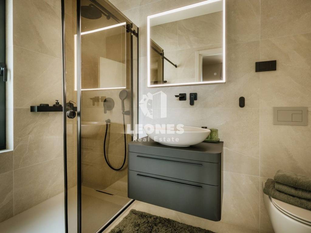 Hiša vključuje tudi tri moderne kopalnice, opremljene z vrhunskimi materiali, tuš kabinami in elegantnimi detajli.