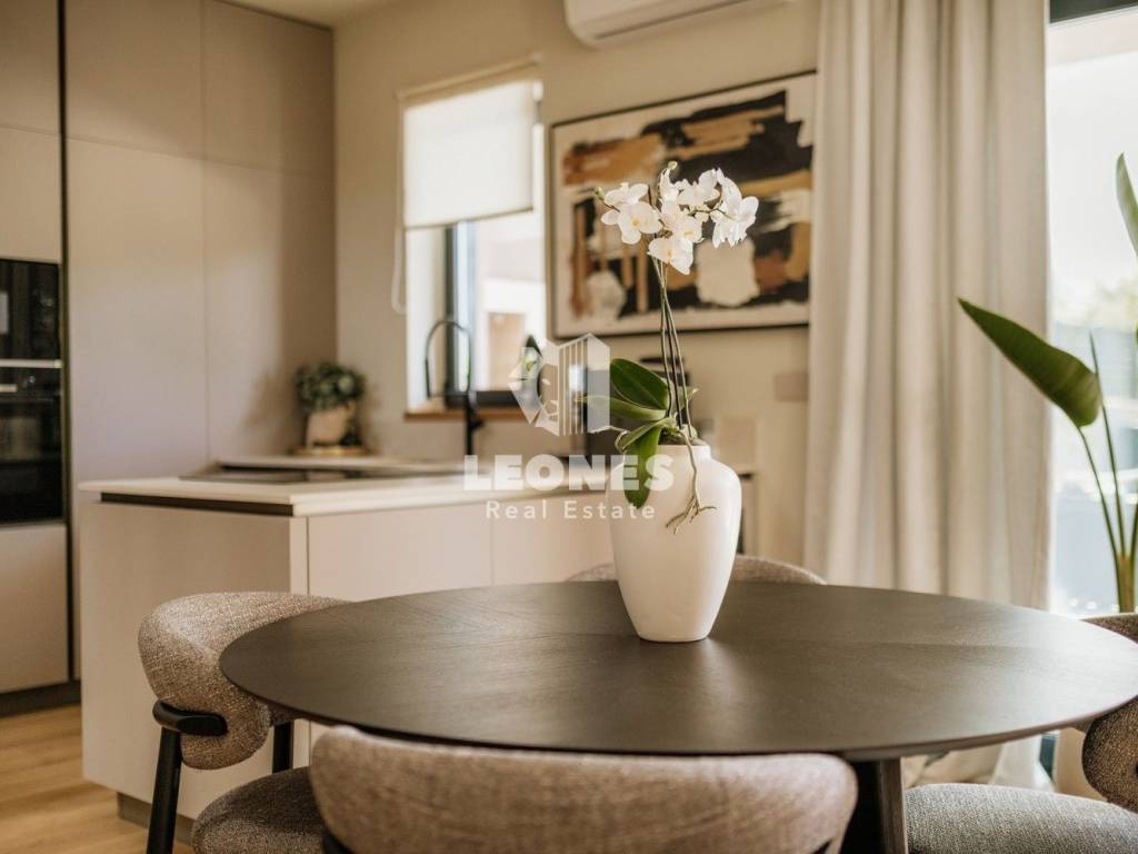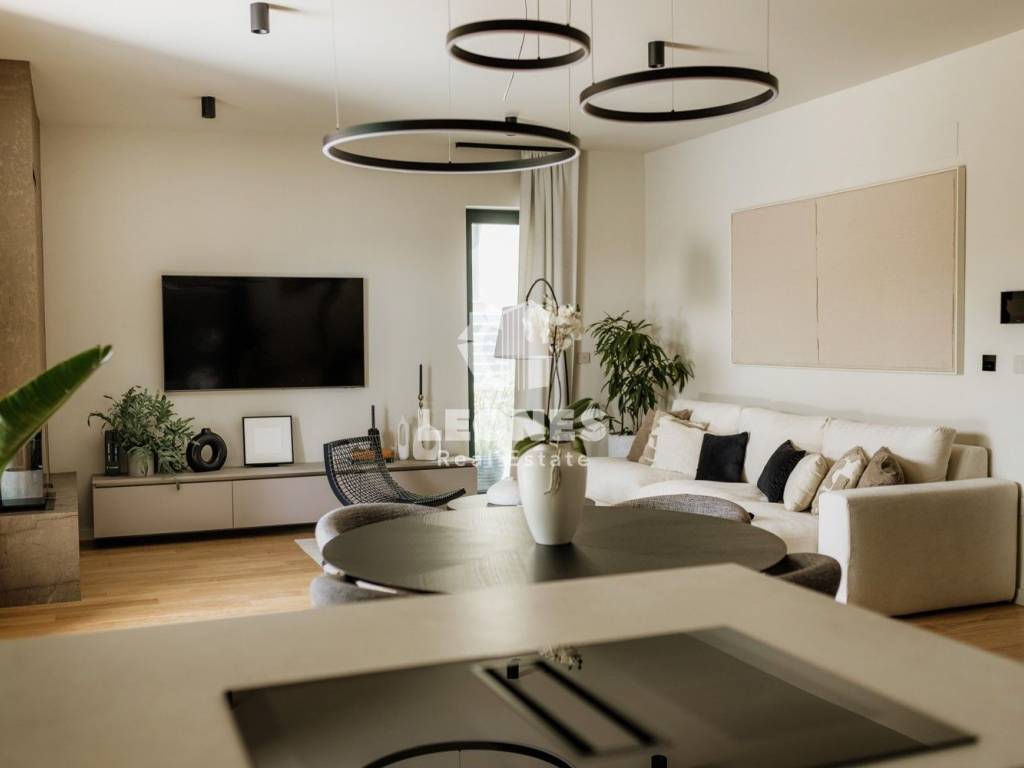 Odprt bivalni prostor povezuje kuhinjo, jedilnico in dnevno sobo v svetlo celoto zahvaljujoč velikim aluminijastim oknom, ki ponujajo čudovit razgled na dvorišče in bazen.