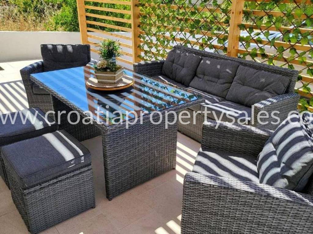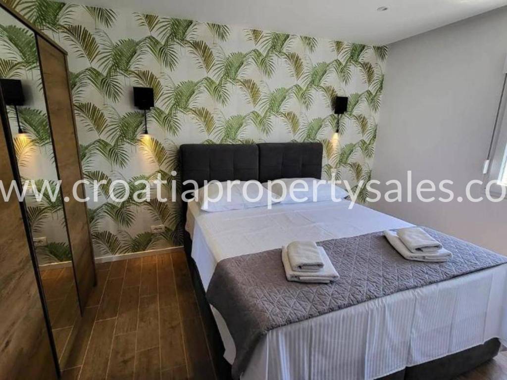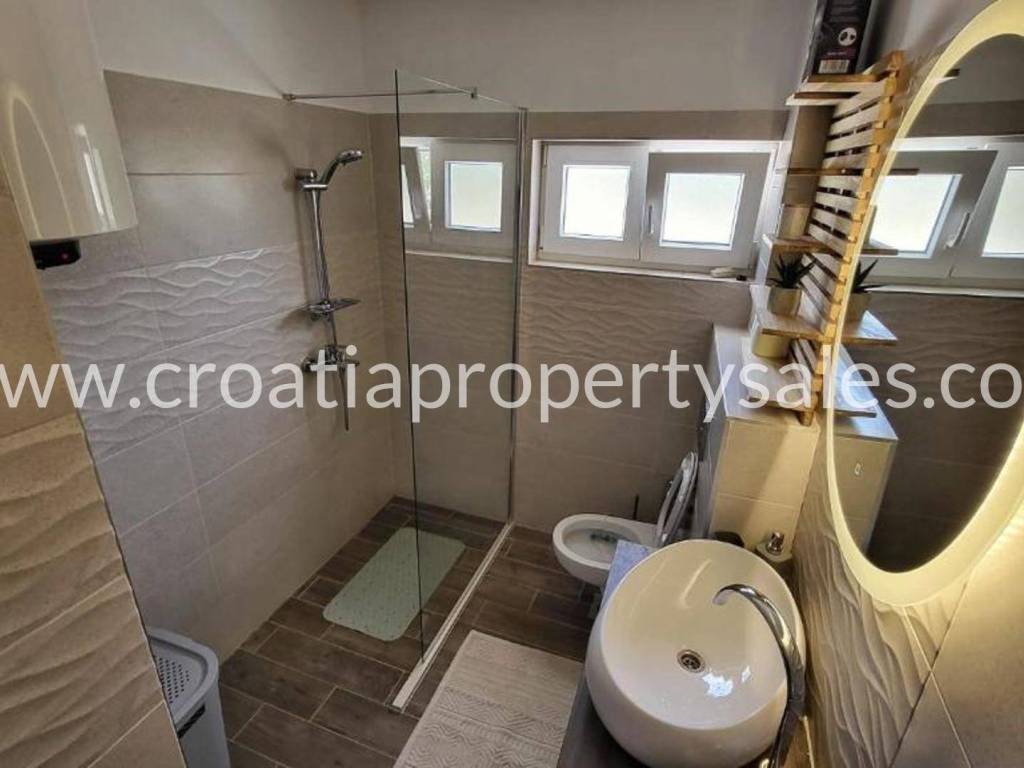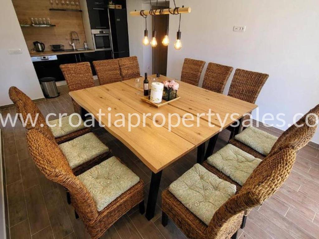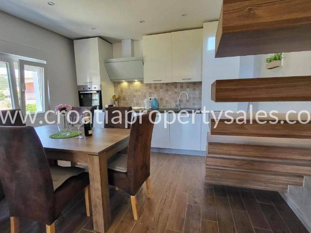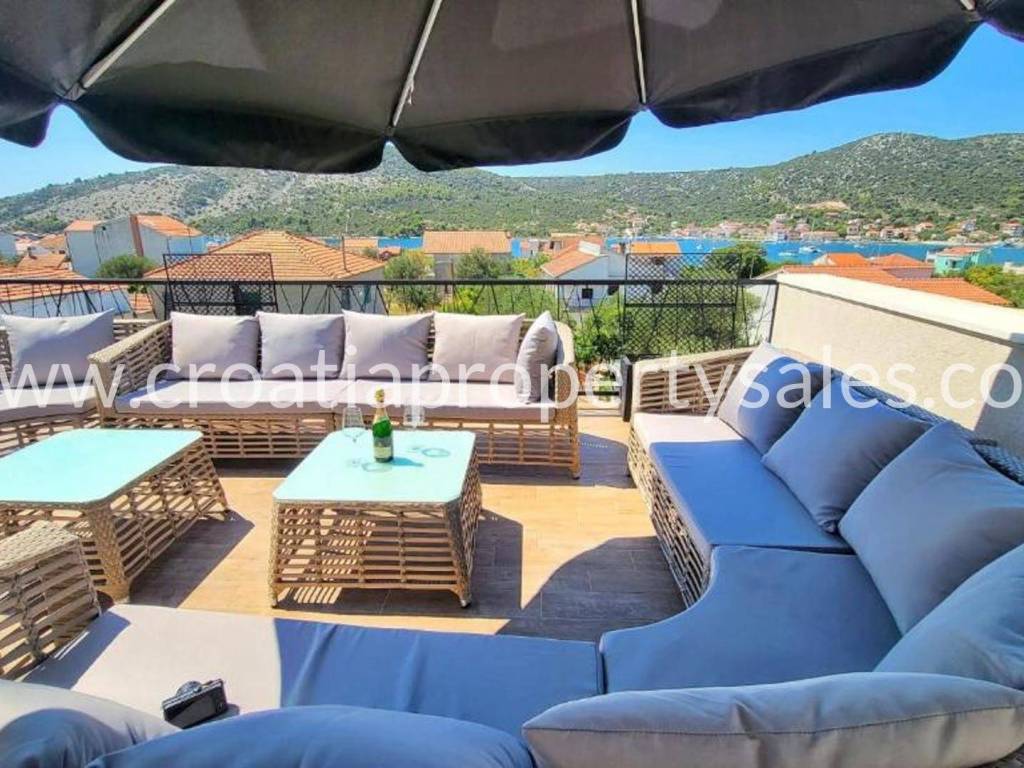 Detached house with gorgeous views over the bay in a village not far from Trogir. The house is divided into two apartments with separate entrances. The ground floor consists of one apartment with 2 bedrooms, 2 bathrooms, a living room and a kitchen with a dining room. On the first and second floor is the second apartment consisting of 4 bedrooms (2 en-suite), additional bathroom, a living room, a kitchen and dining area, covered balcony and a large terrace with panoramic views of the sea. The house is furnished and air-conditioned. Parking for 4 cars Split airport is 35 min away, while the beach and cafes are in walking distance.