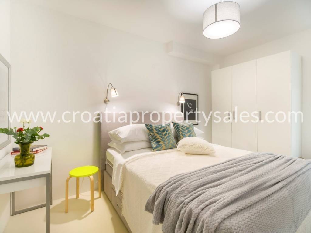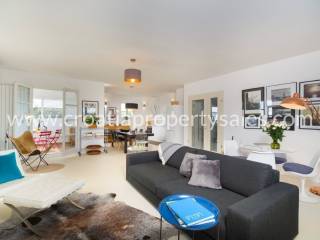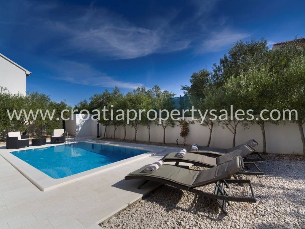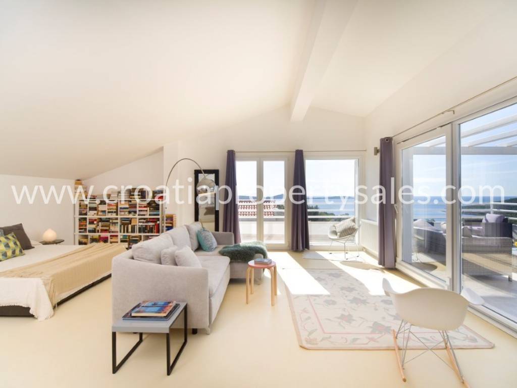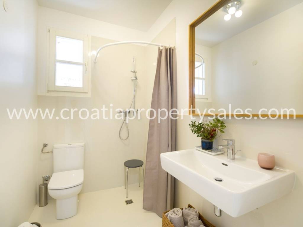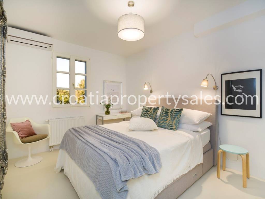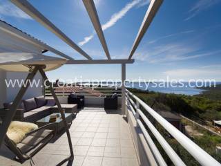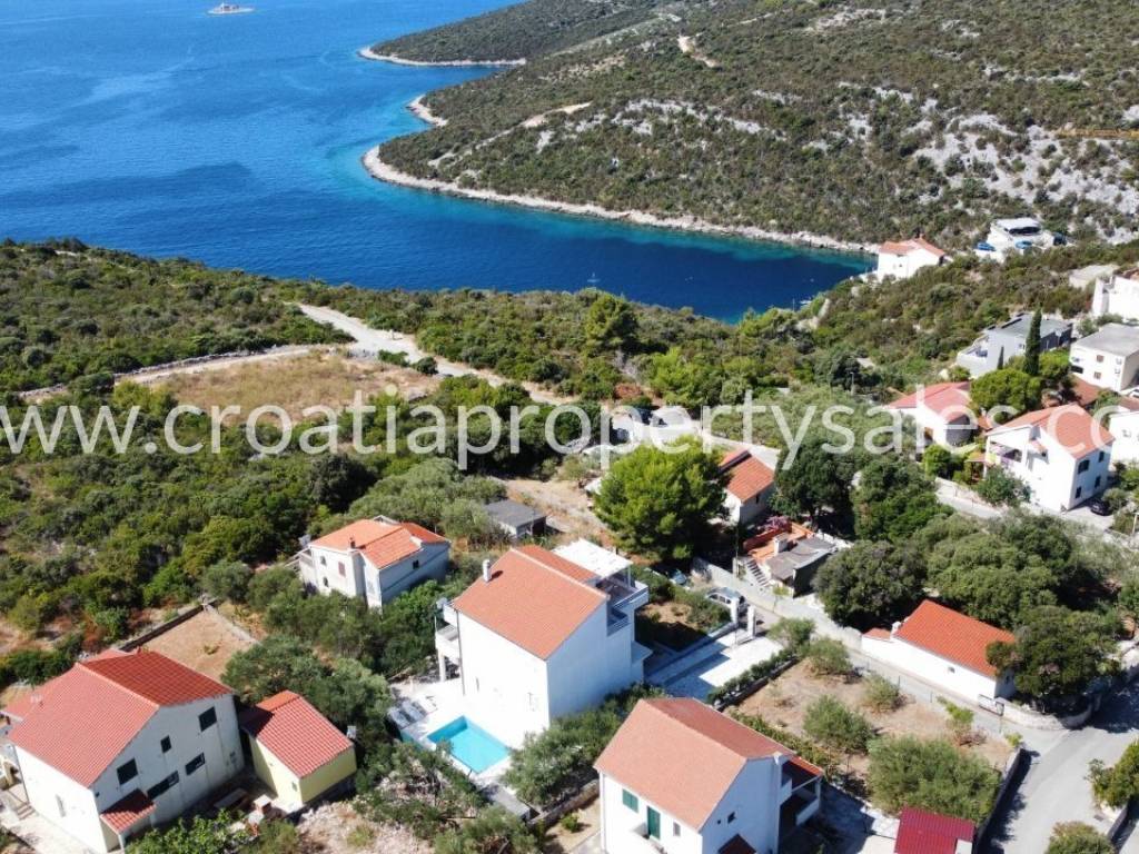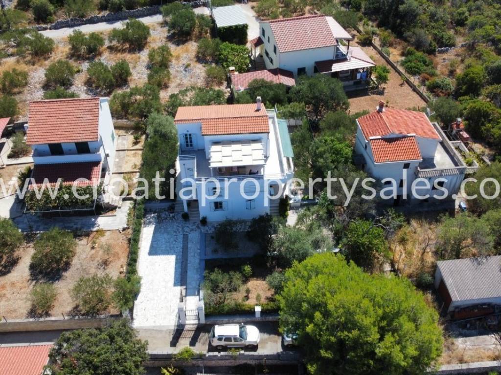 Beautiful modern house in an idyllic Mediterranean bay, not far from Vinišće. Silence, pine trees, swimming pool and spectacular sea views make this property an exceptional opportunity for those who want a truly Mediterranean experience. The living area of the house is 215 m2, and it is located on a plot of 615 m2. The house consists of three floors. On the ground floor there are three bedrooms and two bathrooms. The master bedroom has its own separate bathroom. The first floor is one big open area consisting of living room, dining room and kitchen. The exit is to a spacious terrace that extends to the south and west side of the house. On the second floor there is also an open space that is currently used as a spacious living room with a terrace (54 m2) that offers a unique sea view. The house is built with top quality materials, luxuriously decorated and with central heating throughout the house, as well as a separate cooling system. There is a paved road leading to the house, and parking spaces are provided within the plot. All the necessary infrastructure is present.