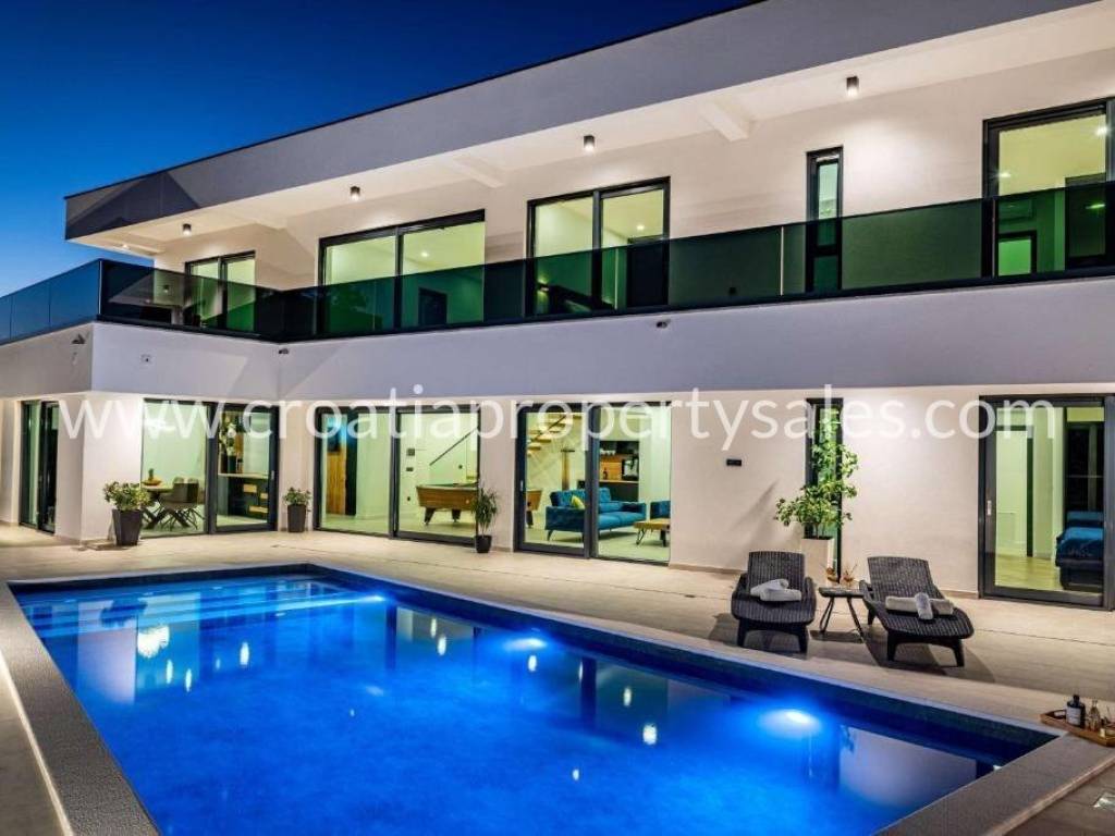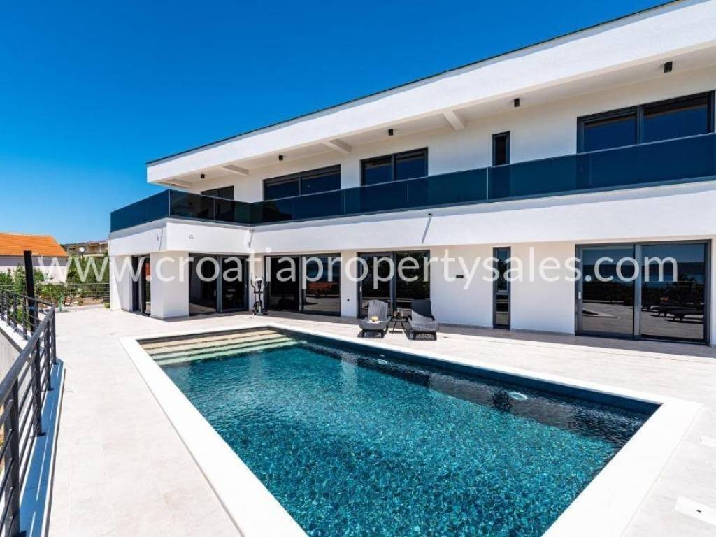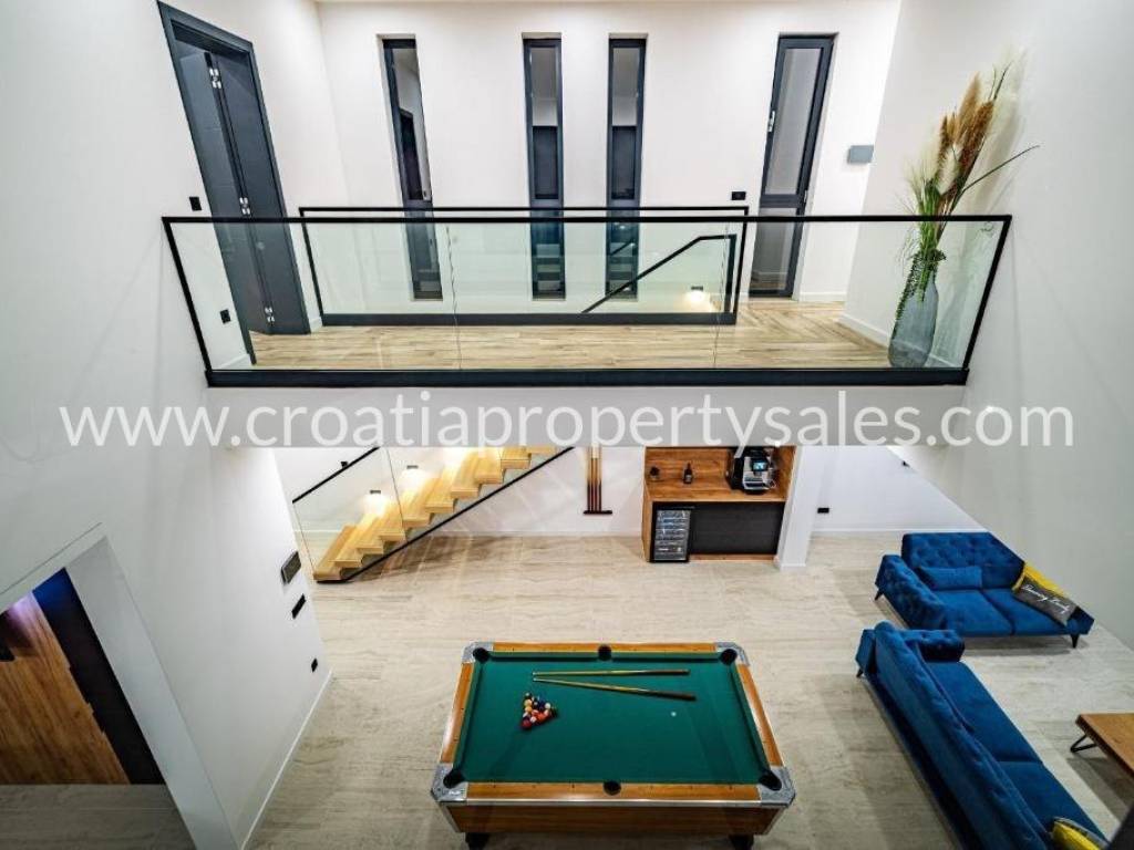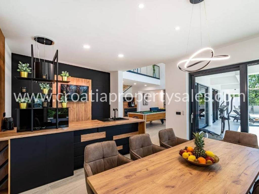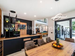The property is built on two floors, on the ground floor of the villa there is a kitchen and dining room, a living room, an entertainment corner and one bedroom with a bathroom and a small toilet. It has direct access to the swimming pool with sea water, sun deck and outdoor kitchen.