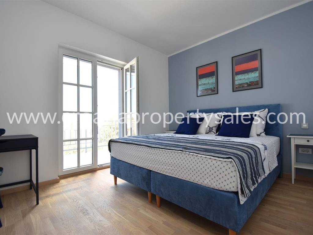 The ground floor has an entrance hall, kitchen with dining room and spacious living area, bathroom and outdoor terrace. On the 1st floor there are two bedrooms each with a balcony and sea view and a bathroom.
