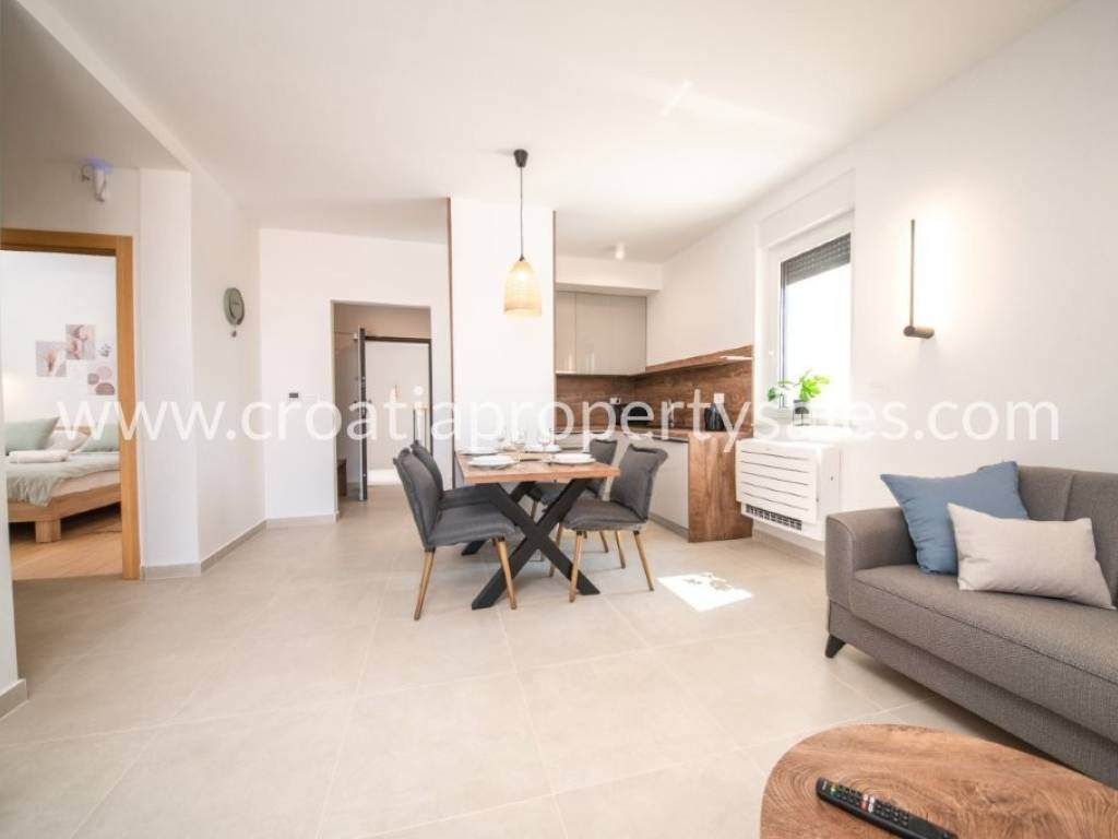 The apartments have two bedrooms with double beds, a living room connected to the kitchen and dining room, a bathroom and an additional toilet. Each apartment has a balcony.
